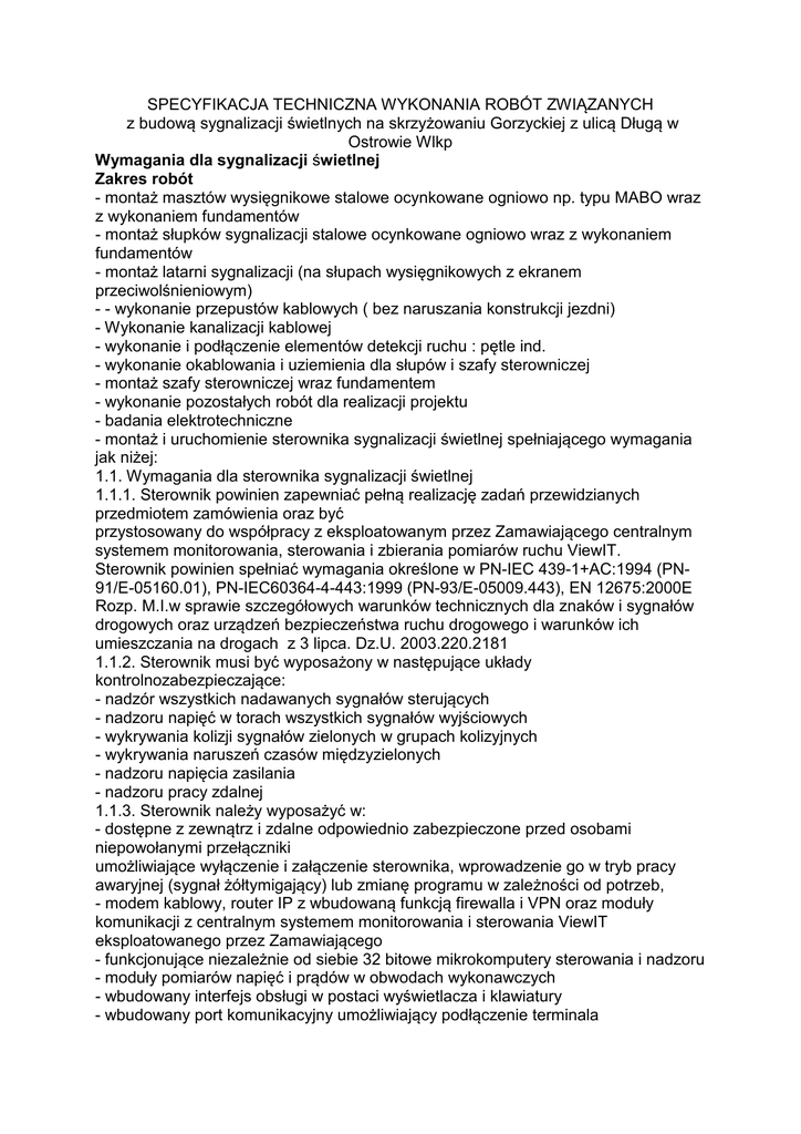 SPECYFIKACJA TECHNICZNA WYKONANIA ROBÓT ZWIĄZANYCH z budową sygnalizacji świetlnych na skrzyżowaniu Gorzyckiej z ulicą Długą w Ostrowie Wlkp Wymagania dla sygnalizacji świetlnej Zakres robót - montaż masztów wysięgnikowe stalowe ocynkowane ogniowo np. typu MABO wraz z wykonaniem fundamentów - montaż słupków sygnalizacji stalowe ocynkowane ogniowo wraz z wykonaniem fundamentów - montaż latarni sygnalizacji (na słupach wysięgnikowych z ekranem przeciwolśnieniowym) - - wykonanie przepustów kablowych ( bez naruszania konstrukcji jezdni) - Wykonanie kanalizacji kablowej - wykonanie i podłączenie elementów detekcji ruchu : pętle ind. - wykonanie okablowania i uziemienia dla słupów i szafy sterowniczej - montaż szafy sterowniczej wraz fundamentem - wykonanie pozostałych robót dla realizacji projektu - badania elektrotechniczne - montaż i uruchomienie sterownika sygnalizacji świetlnej spełniającego wymagania jak niżej: 1.1. Wymagania dla sterownika sygnalizacji świetlnej 1.1.1. Sterownik powinien zapewniać pełną realizację zadań przewidzianych przedmiotem zamówienia oraz być przystosowany do współpracy z eksploatowanym przez Zamawiającego centralnym systemem monitorowania, sterowania i zbierania pomiarów ruchu ViewIT. Sterownik powinien spełniać wymagania określone w PN-IEC 439-1+AC:1994 (PN91/E-05160.01), PN-IEC60364-4-443:1999 (PN-93/E-05009.443), EN 12675:2000E Rozp. M.I.w sprawie szczegółowych warunków technicznych dla znaków i sygnałów drogowych oraz urządzeń bezpieczeństwa ruchu drogowego i warunków ich umieszczania na drogach z 3 lipca. Dz.U. 2003.220.2181 1.1.2. Sterownik musi być wyposażony w następujące układy kontrolnozabezpieczające: - nadzór wszystkich nadawanych sygnałów sterujących - nadzoru napięć w torach wszystkich sygnałów wyjściowych - wykrywania kolizji sygnałów zielonych w grupach kolizyjnych - wykrywania naruszeń czasów międzyzielonych - nadzoru napięcia zasilania - nadzoru pracy zdalnej 1.1.3. Sterownik należy wyposażyć w: - dostępne z zewnątrz i zdalne odpowiednio zabezpieczone przed osobami niepowołanymi przełączniki umożliwiające wyłączenie i załączenie sterownika, wprowadzenie go w tryb pracy awaryjnej (sygnał żółtymigający) lub zmianę programu w zależności od potrzeb, - modem kablowy, router IP z wbudowaną funkcją firewalla i VPN oraz moduły komunikacji z centralnym systemem monitorowania i sterowania ViewIT eksploatowanego przez Zamawiającego - funkcjonujące niezależnie od siebie 32 bitowe mikrokomputery sterowania i nadzoru - moduły pomiarów napięć i prądów w obwodach wykonawczych - wbudowany interfejs obsługi w postaci wyświetlacza i klawiatury - wbudowany port komunikacyjny umożliwiający podłączenie terminala diagnostycznego w postaci komputera typu notebook - moduł obsługujący przyciski dla pieszych, o których mowa w pkt. 1.1.7. - funkcję przyciemniania polegającą na zmniejszaniu napięcia sterującego sygnalizatorami , zgodnie z zegarem astronomicznym zaimplementowanym w sterowniku sygnalizacji świetlnej 1.1.4. Sterownik musi umożliwiać: - ciągły pomiar napięcia zasilania sterownika - spadek napięcia zasilania poniżej zadanego progu napięcia powinien skutkować wyłączeniem sygnalizacji, powrót poprawnej wartości napięcia powinien spowodować automatyczne załączenie sygnalizacji z wykorzystaniem programu startowego (zgodnie z Instrukcją o DrogowejSygnalizacji Świetlnej) - dynamiczne deklarowanie wartości progów kontroli prądowej sygnału czerwonego dla wszystkich grup sygnałowych. Spadek mocy pobieranej w kanale poniżej zadeklarowanego progu powoduje przejście sterownika w tryb pracy awaryjnej, a informacja przyczynie zaistnienia takiej sytuacji powinna być niezwłocznie zapisana w automatycznym dzienniku zdarzeń, wyświetlaczu panelu sterowania oraz odpowiedniej karcie (module) wykonawczej - przechowywanie w logach informacji o min. 1500 wykrytych zdarzeniach i awariach - realizować dowolnie definiowane ciągłe w czasie pomiary ruchu - eliminację stanów sygnalizacji niebezpiecznych dla ruchu w czasie < 300 ms 1.1.5. Sterownik musi posiadać obudowę zabezpieczoną przed dostawaniem się kurzu i wilgoci, zabezpieczającą przed uszkodzeniami mechanicznymi (klasa co najmniej IP54) 1.1.6. sterownik musi mieć możliwośc włączenia do systemu monitoringu eksploatowanego przez Zamawiającego i w siedzibie przedsiębiorstwa konserwującego sygnalizację świetlną. 1.1.7 przejścia dla pieszych w przyciski wyposażone w linijkę świetlną (LED) wyświetlającą informację o pozostałym czasie do zapalenia sygnału zielonego na przejściu dla pieszych 2.2. Wymagania odnośnie metody transmisji pomiędzy sterownikiem a centralnym systemem monitoringu i sterowania 2.2.1. Sterownik musi realizować funkcje klienta TELNET oraz klienta DHCP 2.2.2. Sterownik musi posiadać statyczny adres IP (otrzymany od operatora sieci telematycznej) oraz MAC 2.2.3. Router musi realizować funkcję serwera DHCP, FireWalla, translacji NAT, tworzenia VPN i posiadać statyczny adres IP (otrzymany od operatora sieci telematycznej) i MAC 2.2.4. Router musi posiadać pojedynczy port WAN oraz min. dwukrotny port LAN 2.2.5. Router musi posiadać interfejsy zgodne ze standardem ethernet 2.2.6. Modem kablowy musi adoptować sieć telamatyczną telewizji kablowej do standardu ethernet 2.2.7. Należy zapewnić maksymalne bezpieczeństwo dostępu do sterownika pracującego w sieci telematycznej operatora sieci kablowej przed niepowołanym dostępem 2.2.8. Należy zrealizować w pełni zabezpieczone łącze telekomunikacyjne z Systemem monitoringu w Powiatowym Zarządzie Dróg w Ostrowie Wielkopolskim i w Miejskim Zarządzie Dróg w Ostrowie Wielkopolskim Sygnalizacja i przyłącze to musi spełniać wszelkie normy obowiązujące przy tego typu rozwiązaniach D - 07.03.01. SYGNALIZACJA ŚWIETLNA 1. WSTĘP 1.1. Przedmiot STWIORB Przedmiotem n