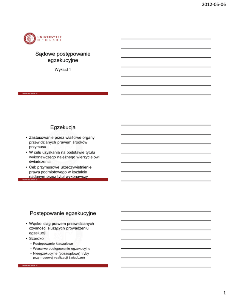 2012-05-06 Sądowe postępowanie egzekucyjne Wykład 1 Egzekucja • Zastosowanie przez właściwe organy przewidzianych prawem środków przymusu • W celu uzyskania na podstawie tytułu wykonawczego należnego wierzycielowi świadczenia • Cel: przymusowe urzeczywistnienie prawa podmiotowego w kształcie nadanym przez tytuł wykonawczy Postępowanie egzekucyjne • Wąsko: ciąg prawem przewidzianych czynności służących prowadzeniu egzekucji • Szeroko – Postępowanie klauzulowe – Właściwe postępowanie egzekucyjne – Nieegzekucyjne (pozasądowe) tryby przymusowej realizacji świadczeń 1 2012-05-06 Rodzaje egzekucji • Syngularna – Jeden wierzyciel – Kierowana do poszczególnych składników majątku • Uniwersalna (upadłościowa) – Więcej niż jeden wierzyciel – Kierowana do całego majątku Przesłanki • Okoliczności warunkujące skuteczne wszczęcie i prowadzenie egzekucji • Zasadniczo tożsame z przesłankami postępowania cywilnego • Występują odrębności Przesłanki II • • • • • Droga sądowa (art. 824 par. 1 pkt 1 i 2) Jurysdykcja (art. 824 par 1 pkt 2) Zdolność sądowa i procesowa Reprezentacja (818, 823) Mniejsze znaczenie – Litispendencja – Res iudicata 2 2012-05-06 Zasady • Idee przewodnie postępowania • Rekonstruowane na zasadzie wnioskowania z norm o normach • Zasady wymiaru sprawiedliwości • Zasady postępowania cywilnego • Zasady postępowania egzekucyjnego Zasady wymiaru sprawiedliwości • • • • • • • • Z. sądowego wymiaru sprawiedliwości Z. prawa do sądu Z. niezawisłości sędziowskiej Z. jednolitości sądów Z. udziału czynnika społecznego Z. nadzoru judykacyjnego SN Z. jawności Z. instancyjności Zasady postępowania cywilnego • • • • • • • Z. równości stron Z. dyspozycyjności Z. kontradyktoryjności Z. formalizmu procesowego Z. koncentracji materiału dowodowego Z. formalizmu procesowego Z. ustności 3 2012-05-06 Zasady postępowania egzekucyjnego • Z. poszanowania godności człowieka • Z. prawa do wysłuchania (informacja, zajęcie stanowiska, prawo do twierdzeń i wywodów) • Z. formalizmu • Z. dyspozycyjności Rodzaje egzekucji • Wyodrębniane ze względu na – Podmiot – Przedmiot – Realizowany cel • Podmiotowo: – Egzekucja sądowa – Egzekucja administracyjna Rodzaje egzekucji II • Przedmiotowo – Singularna – Uniwersalna • Źródło tytułu wykonawczego – Krajowa – zagraniczna 4 2012-05-06 Rodzaje egzekucji III • Cel – Egzekucja świadczeń pieniężnych – Egzekucja świadczeń niepieniężnych (wydanie rzeczy, statku, wykonanie czynności, zaniechanie czynności) – Egzekucja w celu zniesienia współwłasności Sposoby egzekucji • Egzekucja może być prowadzona z różnych składników majątkowych i praw dłużnika (na różne sposoby) • Świadczenia pieniężne (np. z wynagrodzenia, rachunku bankowego, statku morskiego itd.) • Świadczenia niepieniężne (np. odebranie rzeczy, wykonanie zastępcze, grzywna) Źródła prawa • KPC • Ustawa o komornikach sądowych i egzekucji, • Ustawodawstwo wspólnotowe • Akty wykonawcze 5
