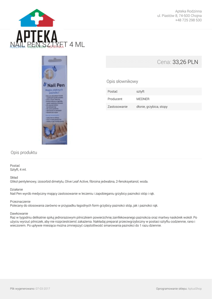 Apteka Rodzinna ul. Piastów 8, 74-500 Chojna +48 725 298 530 NAIL PEN SZTYFT 4 ML Cena: 33,26 PLN Opis słownikowy Postać sztyft Producent MEDNER Zastosowanie dłonie, grzybica, stopy Opis produktu Postać Sztyft, 4 ml. Skład Glikol pentylenowy, izosorbid dimetylu, Olive Leaf Active, fibroina jedwabna, 2-fenoksyetanol, woda. Działanie Nail Pen wyrób medyczny mający zastosowanie w leczeniu i zapobieganiu grzybicy paznokci stóp i rąk. Przeznaczenie Polecany do stosowania zarówno w przypadku łagodnych form grzybicy paznokci stóp, jak i paznokci rąk. Dawkowanie Raz w tygodniu delikatnie spiłuj jednorazowym pilniczkiem powierzchnię zainfekowanego paznokcia oraz martwy naskórek wokół. Po użyciu wyrzuć pilniczek, aby nie rozprzestrzenić zakażenia. Nakładaj preparat przeciwgrzybiczny w postaci sztyftu codziennie, rano i wieczorem. Po upływie miesiąca można zmniejszyć częstotliwość smarowania paznokci do 1 razu dziennie. Plik wygenerowano: 07-03-2017 Powered by TCPDF (www.tcpdf.org) Oprogramowanie sklepu: AptusShop