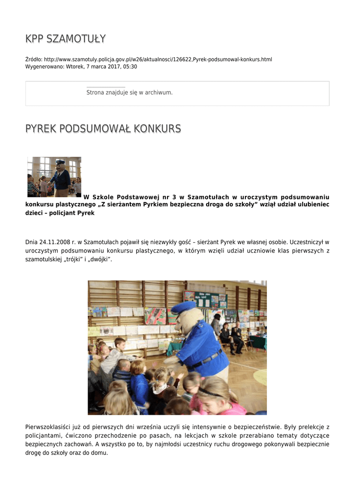 KPP SZAMOTUŁY Źródło: http://www.szamotuly.policja.gov.pl/w26/aktualnosci/126622,Pyrek-podsumowal-konkurs.html Wygenerowano: Wtorek, 7 marca 2017, 05:30 Strona znajduje się w archiwum. PYREK PODSUMOWAŁ KONKURS W Szkole Podstawowej nr 3 w Szamotułach w uroczystym podsumowaniu konkursu plastycznego „Z sierżantem Pyrkiem bezpieczna droga do szkoły” wziął udział ulubieniec dzieci – policjant Pyrek Dnia 24.11.2008 r. w Szamotułach pojawił się niezwykły gość – sierżant Pyrek we własnej osobie. Uczestniczył w uroczystym podsumowaniu konkursu plastycznego, w którym wzięli udział uczniowie klas pierwszych z szamotulskiej „trójki” i „dwójki”. Pierwszoklasiści już od pierwszych dni września uczyli się intensywnie o bezpieczeństwie. Były prelekcje z policjantami, ćwiczono przechodzenie po pasach, na lekcjach w szkole przerabiano tematy dotyczące bezpiecznych zachowań. A wszystko po to, by najmłodsi uczestnicy ruchu drogowego pokonywali bezpiecznie drogę do szkoły oraz do domu. Kolejnym etapem szkolnej profilaktyki było ogłoszenie konkursu plastycznego pt. „Z sierżantem Pyrkiem bezpieczna droga do szkoły”. Prace dzieci oceniło jury składające się z nauczycieli oraz policjantów. Z każdej klasy pierwszej wyróżniono trzech „artystów”, którzy w swych pracach zawarli najistotniejsze elementy bezpiecznego poruszania się po drogach. Podsumowaniem działań były zagadki przygotowane przez policjantkę. Po krótkim sprawdzianie wiadomości z zasad bezpieczeństwa, przyszedł czas na uhonorowanie zwycięzców konkursu. Nagrody oczywiście wręczył pluszowy przyjaciel dzieci – sierżant Pyrek. Jak zwykle były tańce i pamiątkowe zdjęcia z policyjną maskotką. Ponadto każdy pierwszak został opieczętowany „pyrkowym” stempelkiem. Ocena: 0/5 (0) Tweetnij
