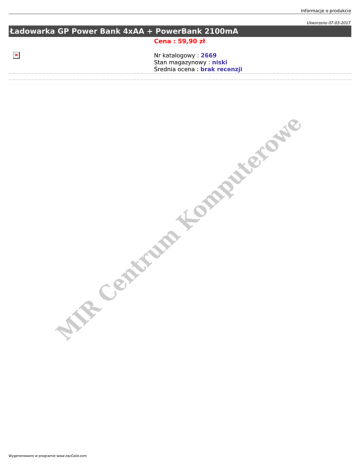 Informacje o produkcie Utworzono 07-03-2017 Ładowarka GP Power Bank 4xAA + PowerBank 2100mA Cena : 59,90 zł M IR C en tr um K om pu te r ow e Nr katalogowy : 2669 Stan magazynowy : niski Średnia ocena : brak recenzji Wygenerowano w programie www.oscGold.com