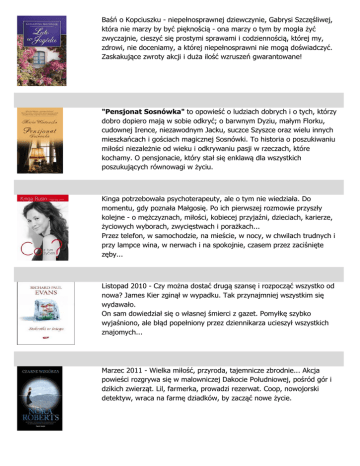 Baśń o Kopciuszku - niepełnosprawnej dziewczynie, Gabrysi Szczęśliwej, która nie marzy by być pięknością - ona marzy o tym by mogła żyć zwyczajnie, cieszyć się prostymi sprawami i codziennością, której my, zdrowi, nie doceniamy, a której niepełnosprawni nie mogą doświadczyć. Zaskakujące zwroty akcji i duża ilość wzruszeń gwarantowane! "Pensjonat Sosnówka" to opowieść o ludziach dobrych i o tych, którzy dobro dopiero mają w sobie odkryć; o barwnym Dyziu, małym Florku, cudownej Irence, niezawodnym Jacku, suczce Szyszce oraz wielu innych mieszkańcach i gościach magicznej Sosnówki. To historia o poszukiwaniu miłości niezależnie od wieku i odkrywaniu pasji w rzeczach, które kochamy. O pensjonacie, który stał się enklawą dla wszystkich poszukujących równowagi w życiu. Kinga potrzebowała psychoterapeuty, ale o tym nie wiedziała. Do momentu, gdy poznała Małgosię. Po ich pierwszej rozmowie przyszły kolejne - o mężczyznach, miłości, kobiecej przyjaźni, dzieciach, karierze, życiowych wyborach, zwycięstwach i porażkach... Przez telefon, w samochodzie, na mieście, w nocy, w chwilach trudnych i przy lampce wina, w nerwach i na spokojnie, czasem przez zaciśnięte zęby... Listopad 2010 - Czy można dostać drugą szansę i rozpocząć wszystko od nowa? James Kier zginął w wypadku. Tak przynajmniej wszystkim się wydawało. On sam dowiedział się o własnej śmierci z gazet. Pomyłkę szybko wyjaśniono, ale błąd popełniony przez dziennikarza ucieszył wszystkich znajomych... Marzec 2011 - Wielka miłość, przyroda, tajemnicze zbrodnie... Akcja powieści rozgrywa się w malowniczej Dakocie Południowej, pośród gór i dzikich zwierząt. Lil, farmerka, prowadzi rezerwat. Coop, nowojorski detektyw, wraca na farmę dziadków, by zacząć nowe życie. Czwarty tom bestsellerowej serii GONE: Zniknęli Michaela Granta, współczesny, postapokaliptyczny thriller dla młodzieży. Nie ma już nadziei w Perdido Beach. Ulice zamieniły się areną, na której rosnąca armia mutantów walczy o panowanie nad ETAPem z tymi, których pozbawiono nadnaturalnych mocy. Ale prawdziwa bitwa toczy się niezauważenie w niewielkim pokoju, w domu na granicy Perdido Beach... Mały Pete, autystyczny brat Astrid, śni w morderczej gorączce. Jednak jego upiorne wizje, to nie majaki szaleńca – gdy rozum śpi, budzą się upiory... Coś szuka dostępu do miasta, coś bardzo, bardzo złego, coś, czego nie można zobaczyć ani pokonać na jawie… Drugi tom uzależniającego cyklu "Upadli", w którym …MIŁOŚĆ NIGDY SIĘ NIE KOŃCZY Piekło na ziemi. Tak właśnie czuje się Luce z dala od swojego chłopaka Daniela, upadłego anioła. Minęła cała wieczność, nim się odnaleźli, ale teraz znów muszą się rozstać. Jednak im więcej się dowiaduje, tym bardziej prześladuje ją myśl, że Daniel nie powiedział jej wszystkiego. Coś przed nią ukrywa - coś niebezpiecznego. Pięć kobiet, pięć motywów, jeden spadek. Policja otrzymuje tajemnicze zgłoszenie o samobójstwie. Zamknięty od środka pokój. Martwy mężczyzna. Broń, na której znajdują się wyłącznie odciski palców ofiary. Jednak zdaniem przybyłego na miejsce komisarza Potockiego nie mogło to być samobójstwo. Ślady zdają się wykluczać również morderstwo. Zagadkowa śmierć jest jednak dopiero początkiem niezwykłych zdarzeń... Maj 2010 - Październikowy poranek we Fjällbace. Rybak Frans Bengtsson wypłynął łódką, aby opróżnić więcierze, które zastawił na homary. Przy ostatnim z nich coś się mocno zacina, Frans przeczuwa, że nie będzie to zwykły połów, nie myli się, w siatce więcierza tkwi ciało dziewczynki... Spektakularny sukces powieści uczynił z Cobena megagwiazdę współczesnego thrillera. Precyzyjnie skonstruowana intryga, mistrzowsko stopniowane napięcie, fałszywe tropy prowadzące donikąd, pozornie niemożliwe do wyjaśnienia zagadki pojawiające się niemal na każdej stronie, zaskakujące zakończenie, którego nie domyśli się nawet najbardziej przenikliwy czytelnik, to podstawowe cechy jego pisarskiego stylu. Siedemnastoletnia Haley McWaid jest doskonałą uczennicą i chlubą swoich rodziców. Pewnego dnia nie powraca do domu. Po trzech miesiącach bezskutecznych poszukiwań jej najbliżsi są przygotowani na najgorsze. Dan Mercer, pracownik opieki społecznej, wpada w pułapkę zastawioną przez reporterkę Wendy Tynes, realizującą program telewizyjny "Przyłapani na gorącym uczynku", służący demaskowaniu przestępców seksualnych. Za próbę seksu z nastolatką staje przed sądem. Marzec 2011 - Zielony sweterek istnieje do dziś. Jest eksponatem w waszyngtońskim Muzeum Holocaustu. Prawdziwa historia Krystyny Chiger – w czasie wojny żydowskiej dziewczynki, której życie ocalił Leopold Socha – polski kanalarz ze Lwowa. Przez 14 miesięcy pomagał i dawał schronienie ukrywającej się w kanałach grupie uciekinierów z getta. To, co wydawało się okazją do zarobku, stało się jednak heroiczną walką o życie ludzkie… Tytułowa dziewczynka to ośmioletnia Krysia, która opowiada o pobycie w lwowskim getcie i codzienności ukrycia w cuchnących kanałach. Jej historia jest pełna kontrastów – między przedwojennym, opływającym w luksusy życiem rodziny Chigerów, a miesiącami spędzonymi w ciemności, brudzie i wilgoci. Ta książka jest zadziwiającym i budzącym nadzieję dowodem na siłę ludzkiego charakteru. Vanessa doznała wielu krzywd od psychopatycznej matki, która karała dziewczynkę za byle co - przywiązywała ją na noc do drzewa w ogrodzie, gdy ta miała 3 lata. Była też wykorzystywana seksualnie przez dziadka i dręczona psychicznie przez rodzinę. W wieku 8 lat odkryła, że matka ją adoptowała i wcale jej nie kocha. Być może nie przeżyłaby tego rodzinnego piekła, gdyby nie odkryła w sobie daru przewidywania przyszłości... Dalsze losy bohaterów "Białej wilczycy" - rosyjskiej
