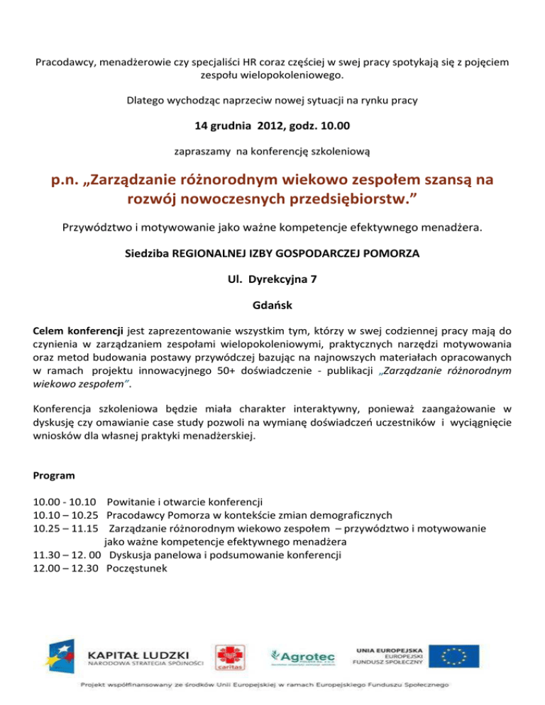 Pracodawcy, menadżerowie czy specjaliści HR coraz częściej w swej pracy spotykają się z pojęciem zespołu wielopokoleniowego. Dlatego wychodząc naprzeciw nowej sytuacji na rynku pracy 14 grudnia 2012, godz. 10.00 zapraszamy na konferencję szkoleniową p.n. „Zarządzanie różnorodnym wiekowo zespołem szansą na rozwój nowoczesnych przedsiębiorstw.” Przywództwo i motywowanie jako ważne kompetencje efektywnego menadżera. Siedziba REGIONALNEJ IZBY GOSPODARCZEJ POMORZA Ul. Dyrekcyjna 7 Gdańsk Celem konferencji jest zaprezentowanie wszystkim tym, którzy w swej codziennej pracy mają do czynienia w zarządzaniem zespołami wielopokoleniowymi, praktycznych narzędzi motywowania oraz metod budowania postawy przywódczej bazując na najnowszych materiałach opracowanych w ramach projektu innowacyjnego 50+ doświadczenie - publikacji „Zarządzanie różnorodnym wiekowo zespołem”. Konferencja szkoleniowa będzie miała charakter interaktywny, ponieważ zaangażowanie w dyskusję czy omawianie case study pozwoli na wymianę doświadczeń uczestników i wyciągnięcie wniosków dla własnej praktyki menadżerskiej. Program 10.00 - 10.10 Powitanie i otwarcie konferencji 10.10 – 10.25 Pracodawcy Pomorza w kontekście zmian demograficznych 10.25 – 11.15 Zarządzanie różnorodnym wiekowo zespołem – przywództwo i motywowanie jako ważne kompetencje efektywnego menadżera 11.30 – 12. 00 Dyskusja panelowa i podsumowanie konferencji 12.00 – 12.30 Poczęstunek Projekt „50+ doświadczenie” Od kilku lat wyzwaniem dla polskiej gospodarki i polityki społecznej stała się dezaktywizacja zawodowa osób powyżej 50 roku życia. Polska stoi przed wyzwaniem wydłużenia okresu aktywności zawodowej oraz efektywnego motywowania do późniejszego opuszczania rynku pracy. Tylko 28% osób po 50 roku życia w Polsce pracuje, a przeciętny wiek wyjścia z rynku pracy wynosi 58 lat, co jest najniższym wiekiem opuszczania rynku pracy w Unii Europejskiej. Stopa zatrudnienia w Polsce osób 50+ jest 1,5 razy mniejsza niż średnia UE. Polska w najniższym stopniu wykorzystuje potencjał osób bardziej dojrzałych. Oznacza to, że kapitał wiedzy (w tym wiedzy praktycznej) ponad 4 mln Polaków nie jest w pełni wykorzystywany przez społeczeństwo. Jednocześnie postępuje proces starzenia się społeczeństwa, co jest zjawiskiem obserwowalnym również w całej Unii. W 2030 r. co 3. Polak będzie miał więcej niż 50 lat. Dziś jest to co 5. mieszkaniec naszego kraju. Dezaktywizacja 50+ przy jednoczesnym starzeniu się społeczeństwa i wydłużeniu średniej długości życia mają dzisiaj charakter wyzwań rozwojowych. Wg socjologa, prof. Zbigniewa Woźniaka grozi nam „geriatryczne tsunami”. W odpowiedzi na ww. wyzwania, Caritas Polska realizuje projekt innowacyjny z Programu Operacyjnego Kapitał Ludzki „50+ doświadczenie”. Projekt realizowany jest w woj. pomorskim w partnerstwie z Caritas Diecezji Pelplińskiej i firmą Agrotec Polska sp. z o.o. Jest współfinansowany ze środków Unii Europejskiej, w ramach Europejskiego Funduszu Społecznego. Czas realizacji projektu to 01.07.2010-31.12.2012. Projekt skierowany jest do czterech grup: pracowników, pracodawców, partnerów i instytucji rynku pracy. Jego celem jest sprawdzenie, jakie rozwiązania mogą być jednocześnie atrakcyjne dla pracodawców i sprzyjać utrzymaniu zatrudnienia przez osoby powyżej 50 roku życia. Projekt zakłada przetestowanie dwóch modeli wspierających aktywność zawodową osób 50+. Pierwszy to podręcznik Zarządzanie różnorodnym wiekowo zespołem uwzględniający zarządzanie potrzebami i kompetencjami pracowników reprezentujących różne generacje. Drugi to platforma wymiany informacji dotyczących sytuacji osób starszych na lokalnym rynku pracy o charakterze Obserwatorium Rynku Pracy (ORP). Dane te będą dostarczane w systematyczny sposób przez instytucje rynku pracy, pracodawców i ośrodki uczelniane oraz partnerów społecznych. W ramach podjętych działań powstanie portal internetowy, który będzie głównym środkiem komunikacji i wymiany informacji między instytucjami tworzącymi platformę. Poza tym, model instytucji o charakterze ORP będzie wspierał nawiązywanie i utrzymywanie współpracy instytucji lokalnych na rzecz aktywizacji, w tym także zawodowej osób starszych. AGNIESZKA DŁUGOŁĘCKA - KURZYK 2 Psycholożka biznesu, trenerka, coach (International Coaching Certyfication) , konsultantka współpracująca z Ośrodkiem Doradztwa i Treningu Kierowniczego. Posiada 10 letnie doświadczenie w doradztwie oraz w przygotowywaniu i realizacji szkoleń (ok. 800 dni szkoleniowych i doradczych) z zakresu budowania zespołu, pracy umiejętności kierowniczych, zespołowej, liderskich, kompetencji zarządzanie komunikacyjnych, personelem, rozmów prowadzenia szkoleń „trening dla trenerów”, asertywności i inteligencji emocjonalnej, otwartości na zmiany, zarządzanie czasem, radzenie sobie ze stresem, motywowania, NLP oraz szkoleń z coachingu menedżerskiego, sprzedażowego oraz wspierającego. Doświadczenie w doradztwie i prowadzeniu szkoleń zdobyła pracując m.in. dla: Budimex S.A., Polimex Mostostal, BZ WBK, TP S.A., Renault Polska, Prokom Software S.A, Elektrownia Bełchatów, Fabryka Wódek Gdańskich, Radmor S.A., Kompania Piwowarska S.A., PZU S.A., Grupa Żywiec S.A., ZDZ Białystok, WSB w Gdańsku, WSB W Poznaniu, Uniwersytet Gdański, WSAiB w Gdyni, GWSH, Grupa Lotos, Raiffeisen Bank, Raiffeisen Leasing Polska, Kujawska Fabryka Manometrów S.A., ZETO, Profireal, PLL LOT, ING NN, Philips Lighting Piła, PBG, Grupa Torfarm S.A., Grupa LOTOS, Polska Telefonia Cyfrowa ERA, TIME S.A., Grupa Banków Spółdzielczych, Gospodarczy Bank Wielkopolski, BODiE, Bank Millennium, Nordea Bank, Jysk, inne. 3