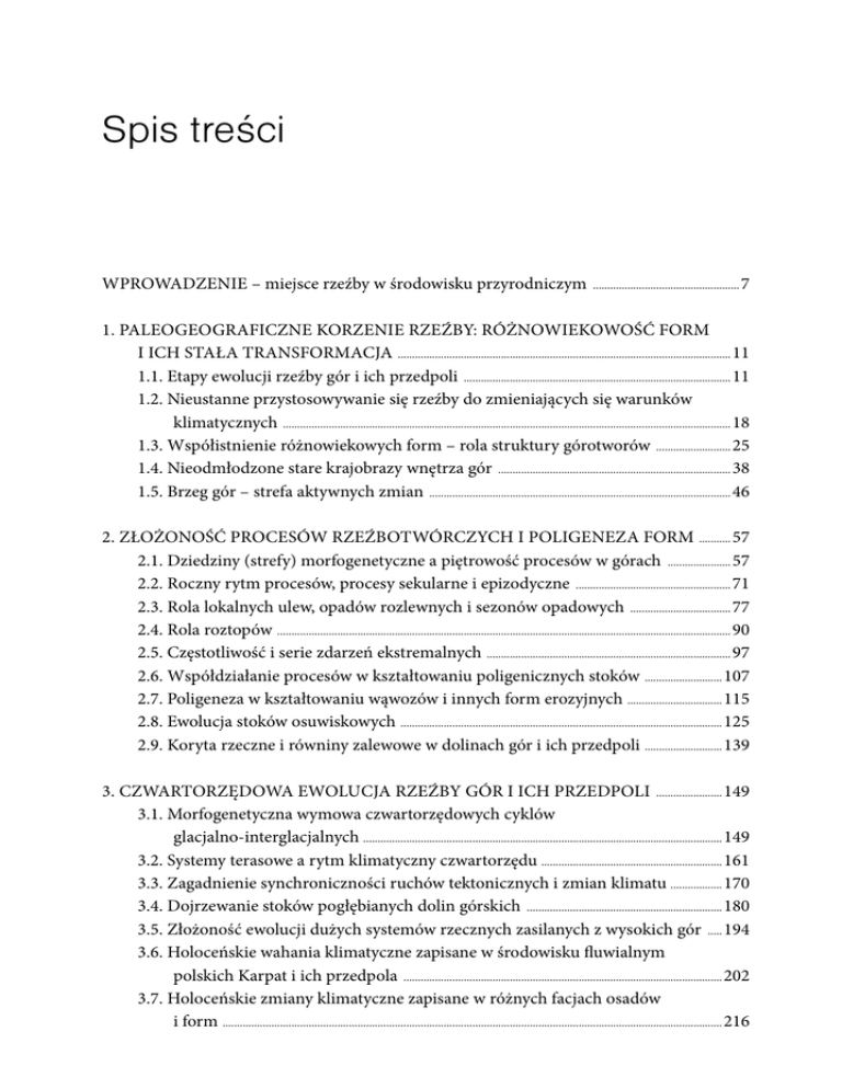 Spis treści Wprowadzenie – miejsce rzeźby w środowisku przyrodniczym ��������������������������������������������������� 7 1. Paleogeograficzne korzenie rzeźby: różnowiekowość form i ich stała transformacja �������������������������������������������������������������������������������������������������������������������� 11 1.1. Etapy ewolucji rzeźby gór i ich przedpoli ��������������������������������������������������������������������������������������������� 11 1.2. Nieustanne przystosowywanie się rzeźby do zmieniających się warunków klimatycznych ������������������������������������������������������������������������������������������������������������������������������������������������������������ 18 1.3. Współistnienie różnowiekowych form – rola struktury górotworów �������������������������� 25 1.4. Nieodmłodzone stare krajobrazy wnętrza gór ��������������������������������������������������������������������������������� 38 1.5. Brzeg gór – strefa aktywnych zmian ��������������������������������������������������������������������������������������������������������� 46 2. Złożoność procesów rzeźbotwórczych i poligeneza form ����������� 57 2.1. Dziedziny (strefy) morfogenetyczne a piętrowość procesów w górach ���������������������� 57 2.2. Roczny rytm procesów, procesy sekularne i epizodyczne ������������������������������������������������������ 71 2.3. Rola lokalnych ulew, opadów rozlewnych i sezonów opadowych ����������������������������������� 77 2.4. Rola roztopów �������������������������������������������������������������������������������������������������������������������������������������������������������������� 90 2.5. Częstotliwość i serie zdarzeń ekstremalnych ������������������������������������������������������������������������������������� 97 2.6. Współdziałanie procesów w kształtowaniu poligenicznych stoków ��������������������������� 107 2.7. Poligeneza w kształtowaniu wąwozów i innych form erozyjnych ��������������������������������� 115 2.8. Ewolucja stoków osuwiskowych ���������������������������������������������������������������������������������������������������������������� 125 2.9. Koryta rzeczne i równiny zalewowe w dolinach gór i ich przedpoli ��������������������������� 139 3. Czwartorzędowa ewolucja rzeźby gór i ich przedpoli ����������������������� 149 3.1. Morfogenetyczna wymowa czwartorzędowych cyklów glacjalno-interglacjalnych ���������������������������������������������������������������������������������������������������������������������������� 149 3.2. Systemy terasowe a rytm klimatyczny czwartorzędu �������������������������������������������������������������� 161 3.3. Zagadnienie synchroniczności ruchów tektonicznych i zmian klimatu ����������������� 170 3.4. Dojrzewanie stoków pogłębianych dolin górskich �������������������������������������������������������������������� 180 3.5. Złożoność ewolucji dużych systemów rzecznych zasila