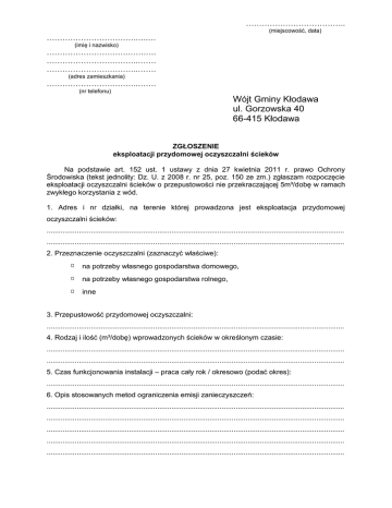 ……………………………….. (miejscowość, data) …………………………….…..… (imię i nazwisko) ………………………….…….…. ……………………………..……. ……………………………..……. (adres zamieszkania) ……………………………..……. (nr telefonu) Wójt Gminy Kłodawa ul. Gorzowska 40 66-415 Kłodawa ZGŁOSZENIE eksploatacji przydomowej oczyszczalni ścieków Na podstawie art. 152 ust. 1 ustawy z dnia 27 kwietnia 2011 r. prawo Ochrony Środowiska (tekst jednolity: Dz. U. z 2008 r. nr 25, poz. 150 ze zm.) zgłaszam rozpoczęcie eksploatacji oczyszczalni ścieków o przepustowości nie przekraczającej 5m³/dobę w ramach zwykłego korzystania z wód. 1. Adres i nr działki, na terenie której prowadzona jest eksploatacja przydomowej oczyszczalni ścieków: .................................................................................................................................................... .................................................................................................................................................... 2. Przeznaczenie oczyszczalni (zaznaczyć właściwe): na potrzeby własnego gospodarstwa domowego, na potrzeby własnego gospodarstwa rolnego, inne 3. Przepustowość przydomowej oczyszczalni: .................................................................................................................................................... 4. Rodzaj i ilość (m³/dobę) wprowadzonych ścieków w określonym czasie: .................................................................................................................................................... .................................................................................................................................................... 5. Czas funkcjonowania instalacji – praca cały rok / okresowo (podać okres): .................................................................................................................................................... 6. Opis stosowanych metod ograniczenia emisji zanieczyszczeń: .................................................................................................................................................... .................................................................................................................................................... .................................................................................................................................................... .................................................................................................................................................... .................................................................................................................................................... 7. Informacja, czy stopień oczyszczania ścieków jest zgodny z obowiązującymi przepisami, w tym określenie w (%) na podstawie instrukcji eksploatacji oczyszczalni stopnia redukcji BZT5 i zawiesiny ogólnej w ściekach – ścieki wprowadzone do ziemi, stopnia redukcji BZT5, ChZTCr i zawiesiny ogólnej w ściekach – ścieki wprowadzane do urządzeń wodnych: .................................................................................................................................................... .................................................................................................................................................... .................................................................................................................................................... .................................................................................................................................................... Załączniki*: 1. Mapa sytuacyjna z naniesieniem lokalizacji oczyszczalni ścieków i drogi dojazdowej lub powykonawcza inwentaryzacja geodezyjna. 2. Informacja potwierdzająca tytuł prawny do instalacji (kopia aktu notarialnego, umowy dzierżawy, umowy najmu). 3. Kopia zgłoszenia budowy indywidualnej przydomowej oczyszczalni ścieków. 4. Opinia o gruncie zawierająca w szczególności informacje o: głębokości położenia najwyższego użytkowego poziomu wodonośnego wód podziemnych, chłonności gruntu lub wyniki testu perkolacyjnego. 5. Kopia dokumentacji technicznej przydomowej oczyszczalni ścieków (instrukcja eksploatacji). 6. Pełnomocnictwo, w przypadku dokonania zgłoszenia przez pełnomocnika. 7. Dowód wpłaty opłaty skarbowej: za zgłoszenie – 120 zł. Pouczenie dla użytkownika instalacji: Zgodnie z art. 152 ust. 4 ustawy Prawo Ochrony Środowiska – do rozpoczęcia eksploatacji instalacji nowo wybudowanej lub zmienionej w sposób istotny można przystąpić, jeżeli organ właściwy do przyjęcia zgłoszenia w terminie 30 dni od dnia doręczenia zgłoszenia nie wniesie sprzeciwu w drodze decyzji. Zgodnie z art. 122 w związku z art. 37 ustawy Prawo Wodne (tekst jednolity: Dz. U. z 2012r poz145 ze zm.) – w przypadku przekroczenia ram zwykłego korzystania z wód, konieczne jest uzyskanie pozwolenia wodnoprawnego. Zgodnie z art. 36 ust. 3 pkt 3 i 4 ustawy Prawo Wodne – przekracza się ramy zwykłego korzystania z wód m. in. w przypadku: korzystania z oczyszczalni na potrzeby działalności gospodarczej, gdy oczyszczone ścieki wprowadzane będę do wód lub do ziemi w ilości przekraczającej 5m³/dobę. Zgodnie z art. 2 ust. 1 pkt. 2 ustawy z dn. 16 listopada 2006r. o opłacie skarbowej (tekst jednolity: Dz. U. z 2012r. poz. 1282 ze zm.), nie podlega opłacie skarbowej dokonanie czynności urzędowej, wydanie zaświadczenia oraz zezwolenia w sprawach budownictwa mieszkaniowego. ................................................. (podpis zgłaszającego) * niepotrzebne skreślić Łośno 10.11.2010r. Sylwester Czerniawski Łośno 44 66-415 Kłodawa nr telefonu 607676748 W