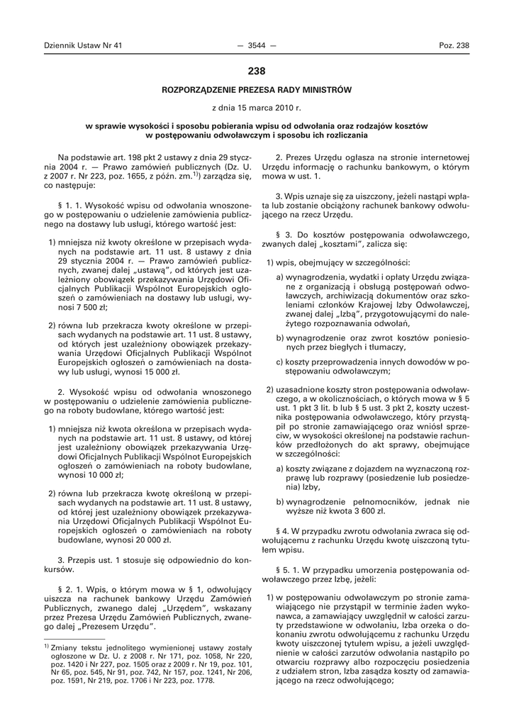 Dziennik Ustaw Nr 41 — 3544 — Poz. 238 238 ROZPORZĄDZENIE PREZESA RADY MINISTRÓW z dnia 15 marca 2010 r. w sprawie wysokości i sposobu pobierania wpisu od odwołania oraz rodzajów kosztów w postępowaniu odwoławczym i sposobu ich rozliczania Na podstawie art. 198 pkt 2 ustawy z dnia 29 stycznia 2004 r. — Prawo zamówień publicznych (Dz. U. z 2007 r. Nr 223, poz. 1655, z późn. zm.1)) zarządza się, co następuje: § 1. 1. Wysokość wpisu od odwołania wnoszonego w postępowaniu o udzielenie zamówienia publicznego na dostawy lub usługi, którego wartość jest: 1) mniejsza niż kwoty określone w przepisach wydanych na podstawie art. 11 ust. 8 ustawy z dnia 29 stycznia 2004 r. — Prawo zamówień publicznych, zwanej dalej „ustawą”, od których jest uzależniony obowiązek przekazywania Urzędowi Oficjalnych Publikacji Wspólnot Europejskich ogłoszeń o zamówieniach na dostawy lub usługi, wynosi 7 500 zł; 2) równa lub przekracza kwoty określone w przepisach wydanych na podstawie art. 11 ust. 8 ustawy, od których jest uzależniony obowiązek przekazywania Urzędowi Oficjalnych Publikacji Wspólnot Europejskich ogłoszeń o zamówieniach na dostawy lub usługi, wynosi 15 000 zł. 2. Wysokość wpisu od odwołania wnoszonego w postępowaniu o udzielenie zamówienia publicznego na roboty budowlane, którego wartość jest: 1) mniejsza niż kwota określona w przepisach wydanych na podstawie art. 11 ust. 8 ustawy, od której jest uzależniony obowiązek przekazywania Urzędowi Oficjalnych Publikacji Wspólnot Europejskich ogłoszeń o zamówieniach na roboty budowlane, wynosi 10 000 zł; 2) równa lub przekracza kwotę określoną w przepisach wydanych na podstawie art. 11 ust. 8 ustawy, od której jest uzależniony obowiązek przekazywania Urzędowi Oficjalnych Publikacji Wspólnot Europejskich ogłoszeń o zamówieniach na roboty budowlane, wynosi 20 000 zł. 3. Przepis ust. 1 stosuje się odpowiednio do konkursów. § 2. 1. Wpis, o którym mowa w § 1, odwołujący uiszcza na rachunek bankowy Urzędu Zamówień Publicznych, zwanego dalej „Urzędem”, wskazany przez Prezesa Urzędu Zamówień Publicznych, zwanego dalej „Prezesem Urzędu”. 1) Zmiany tekstu jednolitego wymienionej ustawy zostały ogłoszone w Dz. U. z 2008 r. Nr 171, poz. 1058, Nr 220, poz. 1420 i Nr 227, poz. 1505 oraz z 2009 r. Nr 19, poz. 101, Nr 65, poz. 545, Nr 91, poz. 742, Nr 157, poz. 1241, Nr 206, poz. 1591, Nr 219, poz. 1706 i Nr 223, poz. 1778. 2. Prezes Urzędu ogłasza na stronie internetowej Urzędu informację o rachunku bankowym, o którym mowa w ust. 1. 3. Wpis uznaje się za uiszczony, jeżeli nastąpi wpłata lub zostanie obciążony rachunek bankowy odwołującego na rzecz Urzędu. § 3. Do kosztów postępowania odwoławczego, zwanych dalej „kosztami”, zalicza się: 1) wpis, obejmujący w szczególności: a) wynagrodzenia, wydatki i opłaty Urzędu związane z organizacją i obsługą postępowań odwoławczych, archiwizacją dokumentów oraz szkoleniami członków Krajowej Izby Odwoławczej, zwanej dalej „Izbą”, przygotowującymi do należytego rozpoznawania odwołań, b) wynagrodzenie oraz zwrot kosztów poniesionych przez biegłych i tłumaczy, c) koszty przeprowadzenia innych dowodów w postępowaniu odwoławczym; 2) uzasadnione koszty stron postępowania odwoławczego, a w okolicznościach, o których mowa w § 5 ust. 1 pkt 3 lit. b lub § 5 ust. 3 pkt 2, koszty uczestnika postępowania odwoławczego, który przystąpił po stronie zamawiającego oraz wniósł sprzeciw, w wysokości określonej na podstawie rachunków przedłożonych do akt sprawy, obejmujące w szczególności: a) koszty związane z dojazdem na wyznaczoną rozprawę lub rozprawy (posiedzenie lub posiedzenia) Izby, b) wynagrodzenie pełnomocników, jednak nie wyższe niż kwota 3 600 zł. § 4. W przypadku zwrotu odwołania zwraca się odwołującemu z rachunku Urzędu kwotę uiszczoną tytułem wpisu. § 5. 1. W przypadku umorzenia postępowania odwoławczego przez Izbę, jeżeli: 1) w postępowaniu odwoławczym po stronie zamawiającego nie przystąpił w terminie żaden wykonawca, a zamawiający uwzględnił w całości zarzuty przedstawione w odwołaniu, Izba orzeka o dokonaniu zwrotu odwołującemu z rachunku Urzędu kwoty uiszczonej tytułem wpisu, a jeżeli uwzględnienie w całości zarzutów odwołania nastąpiło po otwarciu rozprawy albo rozpoczęciu posiedzenia z udziałem stron, Izba zasądza koszty od zamawiającego na rzecz odwołującego; Dziennik Ustaw Nr 41 — 3545 — 2) uczestnik postępowania odwoławczego, który przystąpił po stronie zamawiającego, nie wniósł sprzeciwu wobec uwzględnienia w całości zarzutów przedstawionych w odwołaniu, a zamawiający uwzględnił zarzuty przedstawione w odwołaniu w całości: a) przed otwarciem rozprawy — Izba orzeka o dokonaniu zwrotu odwołującemu z rachunku Urzędu kwoty uiszczonej tytułem wpisu, b) po otwarciu rozprawy — Izba zasądza koszty od zamawiającego na rzecz odwołującego; 3) odwołujący cofnął odwołanie: a) przed otwarciem rozprawy — Izba orzeka o dokonaniu zwrotu odwołującemu z rachunku Urzędu 90 % kwoty uiszczonej tytułem wpisu, b) po otwarciu rozprawy — Izba zasądza koszty, o których mowa w § 3 pkt 2, od odwołującego na rzecz zamawiającego lub wnoszącego sprzeciw. 2. W przypadku uwzględnienia odwołania przez Izbę: 1) Izba zasądza koszty od zamawiającego na rzecz odwołującego; 2) jeżeli uczestnik postępowania odwoławczego, który przystąpił po stronie zamawiającego, wniósł sprzeciw wobec uwzględnienia w całości zarzutów przedstawionych w odwołaniu, Izba zasądza od wnoszącego sprzeciw równowartość kwoty wpisu na rzecz odwołującego oraz koszty, o których mowa w § 3 pkt 2, na rzecz odwołującego lub zamawiającego. Poz. 238 3. W przypadku odrzucenia albo oddalenia odwołania przez Izbę: 1) Izba zasądza od odwołującego na rzecz zamawiającego koszty,