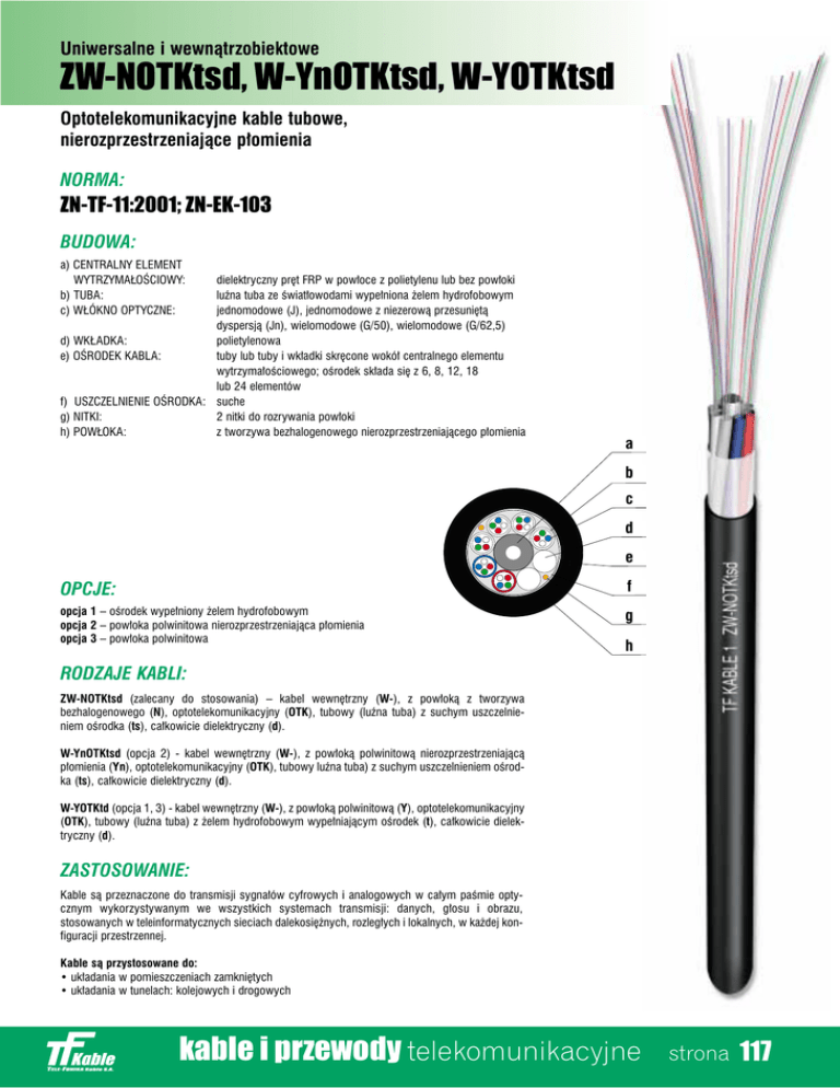 Uniwersalne i wewnàtrzobiektowe ZW-NOTKtsd, W-YnOTKtsd, W-YOTKtsd Optotelekomunikacyjne kable tubowe, nierozprzestrzeniajàce p∏omienia NORMA: ZN-TF-11:2001; ZN-EK-103 BUDOWA: a) CENTRALNY ELEMENT WYTRZYMA¸OÂCIOWY: b) TUBA: c) W¸ÓKNO OPTYCZNE: dielektryczny pr´t FRP w pow∏oce z polietylenu lub bez pow∏oki luêna tuba ze Êwiat∏owodami wype∏niona ˝elem hydrofobowym jednomodowe (J), jednomodowe z niezerowà przesuni´tà dyspersjà (Jn), wielomodowe (G/50), wielomodowe (G/62,5) d) WK¸ADKA: polietylenowa e) OÂRODEK KABLA: tuby lub tuby i wk∏adki skr´cone wokó∏ centralnego elementu wytrzyma∏oÊciowego; oÊrodek sk∏ada si´ z 6, 8, 12, 18 lub 24 elementów f) USZCZELNIENIE OÂRODKA: suche g) NITKI: 2 nitki do rozrywania pow∏oki h) POW¸OKA: z tworzywa bezhalogenowego nierozprzestrzeniajàcego p∏omienia a b c d e OPCJE: f opcja 1 – oÊrodek wype∏niony ˝elem hydrofobowym opcja 2 – pow∏oka polwinitowa nierozprzestrzeniajàca p∏omienia opcja 3 – pow∏oka polwinitowa g h RODZAJE KABLI: ZW-NOTKtsd (zalecany do stosowania) – kabel wewn´trzny (W-), z pow∏okà z tworzywa bezhalogenowego (N), optotelekomunikacyjny (OTK), tubowy (luêna tuba) z suchym uszczelnieniem oÊrodka (ts), ca∏kowicie dielektryczny (d). W-YnOTKtsd (opcja 2) - kabel wewn´trzny (W-), z pow∏okà polwinitowà nierozprzestrzeniajàcà p∏omienia (Yn), optotelekomunikacyjny (OTK), tubowy luêna tuba) z suchym uszczelnieniem oÊrodka (ts), ca∏kowicie dielektryczny (d). W-YOTKtd (opcja 1, 3) - kabel wewn´trzny (W-), z pow∏okà polwinitowà (Y), optotelekomunikacyjny (OTK), tubowy (luêna tuba) z ˝elem hydrofobowym wype∏niajàcym oÊrodek (t), ca∏kowicie dielektryczny (d). ZASTOSOWANIE: Kable sà przeznaczone do transmisji sygna∏ów cyfrowych i analogowych w ca∏ym paÊmie optycznym wykorzystywanym we wszystkich systemach transmisji: danych, g∏osu i obrazu, stosowanych w teleinformatycznych sieciach dalekosi´˝nych, rozleg∏ych i lokalnych, w ka˝dej konfiguracji przestrzennej. Kable sà przystosowane do: • uk∏adania w pomieszczeniach zamkni´tych • uk∏adania w tunelach: kolejowych i drogowych kable i przewody telekomunikacyjne strona 117 W¸ASNOÂCI U˚YTKOWE: Kable tubowe wewn´trzne, wzmacniane sà: • w pe∏ni dielektryczne • odporne na zak∏ócenia elektromagnetyczne • zabezpieczone przed wnikaniem wilgoci i wzd∏u˝nà penetracjà wody • mogà byç uk∏adane w pobli˝u instalacji elektrycznych. Zewn´trzna pow∏oka kabli jest wykonana z materia∏ów trudnopalnych, mo˝e byç równoczeÊnie bezhalogenowa. Nadruk metryczny oraz oznakowanie kabli sà naniesione na pow∏oce. Inne oznakowanie na pow∏oce mo˝e byç wyspecyfikowane w zamówieniu. ZAKRES TEMPERATUR: - instalacji: - transportu i przechowywania: - pracy: -15ºC ÷ +60ºC -40ºC ÷ +70ºC -40ºC ÷ +70ºC CHARAKTERYSTYKA KABLI: Wymiary kabla Liczba w∏ókien Êwiat∏owodowych w kablu Liczba elementów (tub/wk∏adek) Liczba w∏ókien Êwiat∏owodowych w tubie W∏asnoÊci mechaniczne Ârednica zewn´trzna Masa kabla Max si∏a ciàgnienia [N] Min. promieƒ zginania [mm] [mm] [kg/km] Dynamiczna Statyczna Dynamiczny Statyczny 4-24 6 4 8,0 60 1000 500 120 160 6-36 6 6 11,5 130 2000 1000 180 230 8-48 6 8 11,5 130 2000 1000 180 230 12-72 6 12 11,5 130 2000 1000 180 230 6-48 8 6 13,0 160 2500 1250 200 260 8-64 8 8 13,0 160 2500 1250 200 260 12-96 8 12 13,0 160 2500 1250 200 260 6-72 12 6 16,1 235 2500 1250 240 330 8-96 12 8 16,1 235 2500 1250 240 330 12-144 12 12 16,1 235 2500 1250 240 330 12-216 18 12 16,8 245 2500 1250 250 340 12-288 24 12 16,8 310 2500 1250 280 380 D¸UGOÂå FABRYKACYJNA: W/g wymagaƒ klienta (max 16 km na b´bnie) – standardowo: 4200±50 mb PAKOWANIE: B´bny kablowe drewniane. kable i przewody telekomunikacyjne strona 118