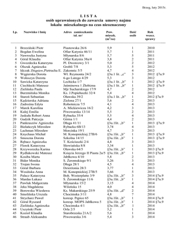 Brzeg, luty 2015r. LISTA osób uprawnionych do zawarcia umowy najmu lokalu mieszkalnego na czas nieoznaczony Pow. Ilość Rok mieszk. osób wszcz. (m2/os) sprawy ---------------------------------------------------------------------------------------------------------------------------------------------------------Lp. 1 2 3 4 5 6 7 8 9 10 11 12 13 14 15 16 17 18 19 20 21 22 23 24 25 26 27 28 29 30 31 32 33 34 35 36 37 38 39 40 41 42 43 44 45 46 Nazwisko i Imię Brzeziński Piotr Bogdan Ewelina Nawrocka Justyna Góral Klaudia Gwozdecka Katarzyna Olszuk Agnieszka Idczak Zbigniew,Pietrucha E. Węgierska Dorota Wołoszyn Dorota Sawicka Katarzyna Ciechlecki Mateusz Zielińska Paula Burzmińska Monika Staroń Sebastian Kędzierska Adriana Zadrożna Edyta Marek Karolina Kulej Emilia Jaskuła Robert Anna Gudzik Patrycja Pankraszów Agnieszka Bielańczyk Mirosław Lachman Mirosław Knychaus Michał Smoszna Dorota Rębacz Agnieszka Florek Katarzyna Krzyworzeka Karina Rydlakowski Mateusz Kosiba Marta Bider Monika Trojan Iwona Góral Barbara Wosińska Anna Palacz Katarzyna Mardas Łukasz Pawluk Małgorzata Jeka Magdalena Borowska Wiesława Smolińska Urszula Strycharz Paweł Góral Ryszard Zielińska Agnieszka Uszyński Piotr Kozioł Klaudia Straub Aleksandra Adres zamieszkania /ul. nr/ Piastowska 26/6 Ofiar Katynia 46/11 Młynarska 8/6 Ofiar Katynia 38a/4 Pl. Dworcowy 3/1 Grobli 7/8 Zakonnic 5/5 Wł. Reymonta 24/2 6-go Lutego 4/29 Lechicka 1/7 Jaśminowa 1 Żłobizna Mjr Sucharskiego 17/9 Ks. J.Popiełuszki 32/4 Oławska 39/2 Zielona 27/1 Robotnicza 7/5 A. Mickiewicza 16/2 Piwowarska 13/14 Rybacka 35/4 Górna 1/1 Długa 41/11 Rybacka 6B/13 Morcinka 19/1 M. Konopnickiej 27B/6 Szkolna 14/15 T. Kościuszki 2/4 Słowiańska 8/8 Oławska 64/5 Księcia Jerzego II Piasta 2a/5 Jabłkowa 4/10 S. Żeromskiego 9/1 Długa 28/1 Dzierżonia 28/3 M. Konopnickiej 27B/5 Boh. Westerplatte 3/9 S. Żeromskiego 11/6 Młynarska 15/2 Wileńska 15 Ks. Makarskiego 25/9 Chocimska 3/11 koresp. Pępice 65 koresp. MOPS Jabłkowa 5 Chocimska 4/1 Orla 2/5 Starobrzeska 21A/2 Piwowarska 3/6 5,9 5,7 5,7 3,8 5,0 5,3 4,7 §3u.1 lit. „c” 5,3 §3u.1 lit. „b” §3u.1 lit. „b” 4,7 5,4 §3u.1 lit. „b” 5,6 4,1 4,2 5,5 5,5 4,4 §3u.1lit. „b” 3,74 4,7 §3u.1lit. „b” §3u.1lit. „b” 4,8 3,34 §3u.1lit. „b” §3u.1lit. „b” 5,8 5,26 4,5 3,77 5,66 §3u.1lit. „b” §3u.1lit. „b” 3,15 4,0 §3u.1lit. „d” 4,8 §3u.1lit. „b” §3u.1lit. „b” §3u.1lit. „b” 5,2 5,6 5,4 1 1 5 2 2 5 4 3 3 1 1 2 4 1 2 4 3 2 4 2 1 4 3 1 1 3 1 1 1 2 3 4 1 5 3 1 4 4 2 7 1 1 1 1 1 3 2010 2011 2011 2011 2012 2012 2012 2012 §7u.9 2012 2012 §7u.9 2012 §7u.9 2012 2012 2012 §7u.9 2013 2013 2013 2013 2013 2013 2013 §7u.9 2013 2013 2013 §7u.9 2013 §7u.9 2013 2013 2013 §7u.9 2013 §7u.9 2013 2013 2013 2013 2013 2014 §7u.9 2014 §7u.9 2014 2014 2014 2014 2014 §7u.9 2014 §7u.9 2014 2014 2014 2014 47 48 49 50 51 52 53 54 55 56 57 58 59 60 61 62 63 64 65 66 67 68 69 70 71 72 73 74 75 76 77 78 79 80 81 82 83 84 85 86 87 88 89 90 91 92 Leczowicz Monika Gen. Andersa 3/4 6,8 2 2014 Kanak Agnieszka Marsz. J. Piłsudskiego 16/11 §3u.1lit. „b” 1 2014 §7u.9 Nowosad Natalia Polska 1/17 §3u.1lit. „b” 1 2014 §7u.9 Smuga Grzegorz Długa 51/53 m 3 7,45 1 2014 Oleksik Łukasz Powstańców Śl. 10/8 5,62 1 2014 Doliński Paweł G. Morcinka 1/5 6,7 4 2014 Pater Justyna S. Żeromskiego 17/2 6,1 2 2014 Malita Justyna Górna 1/9 4,9 1 2014 Babiarz Krzysztof Stare Koszary 5/9 7,57 1 2014 Bogdan Sebastian Wierzbowa 18/9 6,13 4 2014 Bojdys Sławomir Jerzego 2/11 6,31 1 2014 Jaros Bożena Rybacka 25A/6 4,4 1 2014 Smuga Ewelina Długa 51-53/3 7,4 1 2014 Oleksów Weronika Nysańska 19/9 7,6 2 2014 Goruk Piotr, Sochacka Bożena Stare Koszary 5/2 §3u.1lit. „c ”, d” 4 2014 Szczepaniak Agnieszka Kamienna 13/15 5,1 4 2014 Cichecka Sara Fabryczna 10/5 4,8 2 2014 Wojtysiak Anna Boh. Westerplatte 41/13 7,97 2 2014 Dziuba Anna Jabłkowa 3/10 6,3 3 2014 Urbiak Grzegorz B. Chrobrego 23/9 6,7 3 2014 Bielecka Patrycja Ofiar Katynia 19/6 7,95 2 2014 Białek Marzena Zakonnic 13/5 6,1 3 2014 Majgier Marcin Ofiar Katynia 1/5 6,2 5 2014 Cieleban Magdalena Elektryczna 4/8 §3u.1lit. „c ” 3 2014 §7u.9 Bilowicki Michał Wileńska 15 4,0 1 2014 Ozga Katarzyna, Dariusz 3-go Maja 3/11 6,53 4 2014 Śrutwa Edyta Poprzeczna 3c/1 §3u.1lit. „b” 1 2014 §7u.9 Kadłubowska Aleksandra Cegielniana 6/2 7,53 2 2014 Poświstak Maria bezdomna --1 2014 Wojarska Karolina Boh. Westerplatte 41/15 5,96 3 2014 Nemś Halina Działkowa 4 7,55 2 2014 Łagodzińska Ewelina Dębowa 6/5 3,76 4 2014 Zakrzewska Dorota Zamkowa 5/12 7,7 4 2014 Oćwieja Justyna Rybacka 49/1 4,2 2 2014 Oćwieja Edyta Rybacka 49/1 4,2 3 2014 Mikoda Przemysław Grota Roweckiego 3/10 4,26 5 2014 Mazur Angelika Boh. Westerplatte 2/2 3,7 2 2014 Wasylik Marlena Ks. Makarskiego 27/4 §3u.1lit. „d” 4 2014 Wiśniewski Patryk Ofiar Katynia 36/4a 3,19 1 2014 Adamowski Aleksander Karłowicza 7/5 §3u.1lit. „b” 1 2014 §7u.9 Jeka Anna Przemysław J. Słowackiego 7/5 7,92 5 2014 Misztal Dorota Rybacka 35/10 6,37 2 2014 Chmiecik Magdalena, Tadeusz Ks. Popiełuszki 8a/5 5,17 4 2014 Ćwiertniewicz Anna, Marek Szkolna 3/6 6,52 6 2014 Basik Łukasz Szkolna 4a/10 6,75 1 2014 Sołtys Wojciech Boh. Westerplatte 36/13 6,17 4 2014 93 Józefczyk Justyna, Zając Rafał K. Makuszyńskiego 18/13 6,76 3 2014 94 Sewruk Anna Robotnicza 6/5 5,74 3 2014 95 Czajda Sandra Włościańska 6/6 7,2 3 2014 96 Demczyna Józefa Starobrzeska 24c/5 7,4 1 2014 97 Gruszczyński Tomasz Ofiar Katynia 24c/30 6,78 2 2014 98 Humnicka Joanna Elektryczna 4/20 4,73 2 2014 ---------------------------------------------------------------------------------------------------------------------------------Burmistrz Jerzy Wrębiak