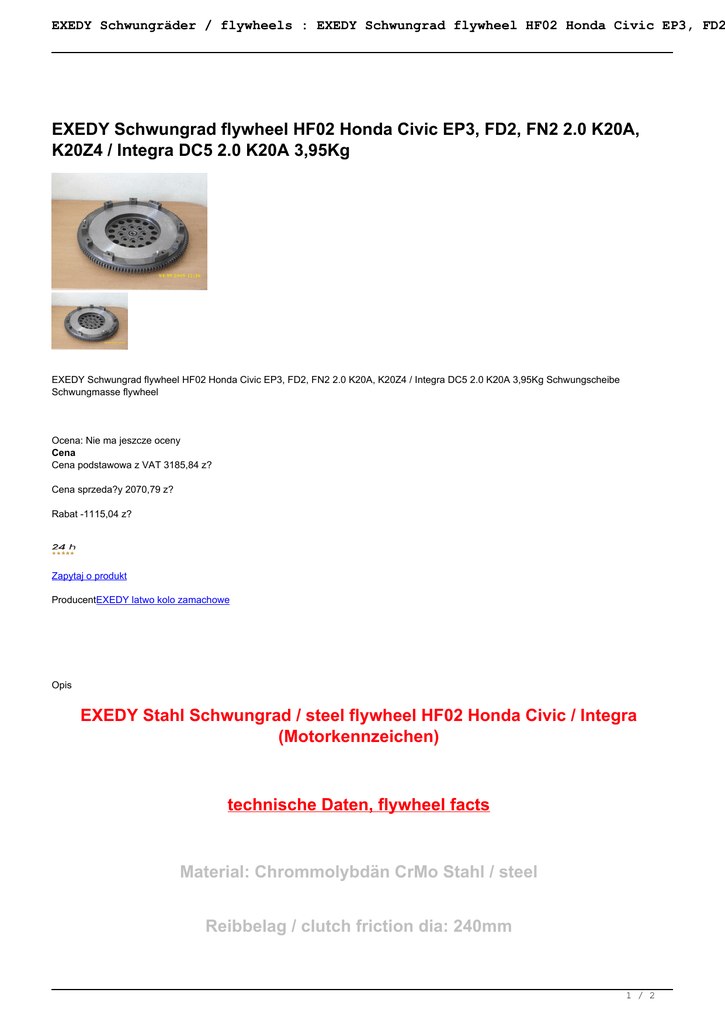 EXEDY Schwungräder / flywheels : EXEDY Schwungrad flywheel HF02 Honda Civic EP3, FD2 EXEDY Schwungrad flywheel HF02 Honda Civic EP3, FD2, FN2 2.0 K20A, K20Z4 / Integra DC5 2.0 K20A 3,95Kg EXEDY Schwungrad flywheel HF02 Honda Civic EP3, FD2, FN2 2.0 K20A, K20Z4 / Integra DC5 2.0 K20A 3,95Kg Schwungscheibe Schwungmasse flywheel Ocena: Nie ma jeszcze oceny Cena Cena podstawowa z VAT 3185,84 z? Cena sprzeda?y 2070,79 z? Rabat -1115,04 z? Zapytaj o produkt ProducentEXEDY latwo kolo zamachowe Opis EXEDY Stahl Schwungrad / steel flywheel HF02 Honda Civic / Integra (Motorkennzeichen) technische Daten, flywheel facts Material: Chrommolybdän CrMo Stahl / steel Reibbelag / clutch friction dia: 240mm 1 / 2 EXEDY Schwungräder / flywheels : EXEDY Schwungrad flywheel HF02 Honda Civic EP3, FD2 Gewicht/ weight: 3,95Kg Schwungrad ist passend für nachfolgende Modelle/Motorisierungen Civic EP3 2.0 K20A Bj. 2001-2005 Civic FD2 2.0 K20A Bj. 2007-2011 Civic FN2 2.0 K20Z4 Bj. 2007-2010 Integra DC5 2.0 K20A Bj. 2001-2003 2 / 2 Powered by TCPDF (www.tcpdf.org)