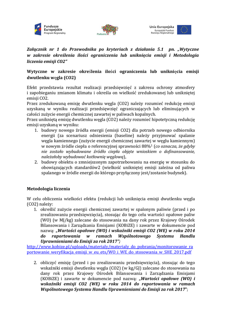 Załącznik nr 1 do Przewodnika po kryteriach z działania 5.1 pn. „Wytyczne w zakresie określenia ilości ograniczenia lub uniknięcia emisji i Metodologia liczenia emisji CO2” Wytyczne w zakresie określenia ilości ograniczenia lub uniknięcia emisji dwutlenku węgla (CO2) Efekt przedstawia rezultat realizacji przedsięwzięć z zakresu ochrony atmosfery i zapobieganiu zmianom klimatu i określa on wielkość zredukowanej lub unikniętej emisji CO2. Przez zredukowaną emisję dwutlenku węgla (CO2) należy rozumieć redukcję emisji uzyskaną w wyniku realizacji przedsięwzięć ograniczających lub eliminujących w całości zużycie energii chemicznej zawartej w paliwach kopalnych. Przez unikniętą emisję dwutlenku węgla (CO2) należy rozumieć hipotetyczną redukcję emisji uzyskaną w wyniku: 1. budowy nowego źródła energii (emisji CO2) dla potrzeb nowego odbiornika energii (za scenariusz odniesienia (baseline) należy przyjmować spalanie węgla kamiennego (zużycie energii chemicznej zawartej w węglu kamiennym) w nowym źródle ciepła o referencyjnej sprawności 88%1 (co oznacza, że gdyby nie zostało wybudowane źródło ciepła objęte wnioskiem o dofinansowanie, należałoby wybudować kotłownię węglową), 2. budowy obiektu o zmniejszonym zapotrzebowaniu na energię w stosunku do obowiązujących standardów2 (wielkość unikniętej emisji zależna od paliwa spalanego w źródle energii do którego przyłączony jest/zostanie budynek). Metodologia liczenia W celu obliczenia wielkości efektu (redukcji lub uniknięcia emisji dwutlenku węgla (CO2) należy: 1. określić zużycie energii chemicznej zawartej w spalonym paliwie (przed i po zrealizowaniu przedsięwzięcia), stosując do tego celu wartości opałowe paliw (WO) (w MJ/kg) zalecane do stosowania na dany rok przez Krajowy Ośrodek Bilansowania i Zarządzania Emisjami (KOBiZE) i zawarte w dokumencie pod nazwą: „Wartości opałowe (WO) i wskaźniki emisji CO2 (WE) w roku 2014 do raportowania w ramach Wspólnotowego Systemu Handlu Uprawnieniami do Emisji za rok 2017”; http://www.kobize.pl/uploads/materialy/materialy_do_pobrania/monitorowanie_ra portowanie_weryfikacja_emisji_w_eu_ets/WO_i_WE_do_stosowania_w_SHE_2017.pdf 2. obliczyć emisję (przed i po zrealizowaniu przedsięwzięcia), stosując do tego wskaźniki emisji dwutlenku węgla (CO2) (w kg/GJ) zalecane do stosowania na dany rok przez Krajowy Ośrodek Bilansowania i Zarządzania Emisjami (KOBiZE) i zawarte w dokumencie pod nazwą: „Wartości opałowe (WO) i wskaźniki emisji CO2 (WE) w roku 2014 do raportowania w ramach Wspólnotowego Systemu Handlu Uprawnieniami do Emisji za rok 2017”; http://www.kobize.pl/uploads/materialy/materialy_do_pobrania/monitorowanie_ra portowanie_weryfikacja_emisji_w_eu_ets/WO_i_WE_do_stosowania_w_SHE_2017.pdf 3. emisja CO2 ze spalania biomasy nie wlicza się do sumy emisji ze spalania paliw, zgodnie zasadami Wspólnotowego handlu uprawnieniami do emisji oraz IPCC. Podejście to jest równoważne stosowaniu zerowego wskaźnika emisji dla biomasy; 4. w przypadku projektów związanych z wprowadzaniem energii elektrycznej do Krajowego Systemu Elektroenergetycznego (KSE) lub ograniczeniem zużycia energii elektrycznej z KSE, dla potrzeb obliczenia wielkości redukcji lub uniknięcia redukcji emisji dwutlenku węgla należy stosować „Referencyjny wskaźnik jednostkowej emisyjności dwutlenku węgla przy produkcji energii elektrycznej do wyznaczania poziomu bazowego dla projektów JI realizowanych w Polsce” zalecany do stosowania przez Krajowy Ośrodek Bilansowania i Zarządzania Emisjami (KOBiZE). Ostatnio opublikowany wskaźnik (czerwiec, 2011) wynosi: 0,812 MgCO2/MWh; Rozporządzenie Ministra Gospodarki z dnia 10 grudnia 2014 r. w sprawie sposobu obliczania danych podanych we wniosku o wydanie świadectwa pochodzenia z kogeneracji oraz szczegółowego zakresu obowiązku potwierdzania danych dotyczących ilości energii elektrycznej wytworzonej w wysokosprawnej kogeneracji (Dz.U. 2014 poz. 1940) 1