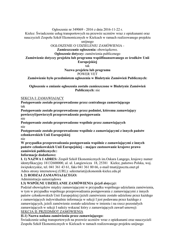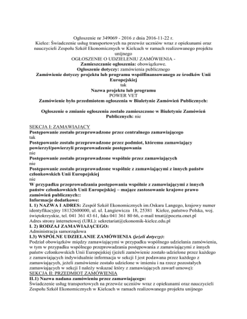 Ogłoszenie nr 349069 - 2016 z dnia 2016-11-22 r. Kielce: Świadczenie usług transportowych na przewóz uczniów wraz z opiekunami oraz nauczycieli Zespołu Szkół Ekonomicznych w Kielcach w ramach realizowanego projektu unijnego OGŁOSZENIE O UDZIELENIU ZAMÓWIENIA Zamieszczanie ogłoszenia: obowiązkowe. Ogłoszenie dotyczy: zamówienia publicznego Zamówienie dotyczy projektu lub programu współfinansowanego ze środków Unii Europejskiej tak Nazwa projektu lub programu POWER VET Zamówienie było przedmiotem ogłoszenia w Biuletynie Zamówień Publicznych: Ogłoszenie o zmianie ogłoszenia zostało zamieszczone w Biuletynie Zamówień Publicznych: nie SEKCJA I: ZAMAWIAJĄCY Postępowanie zostało przeprowadzone przez centralnego zamawiającego tak Postępowanie zostało przeprowadzone przez podmiot, któremu zamawiający powierzył/powierzyli przeprowadzenie postępowania nie Postępowanie zostało przeprowadzone wspólnie przez zamawiających nie Postępowanie zostało przeprowadzone wspólnie z zamawiającymi z innych państw członkowskich Unii Europejskiej nie W przypadku przeprowadzania postępowania wspólnie z zamawiającymi z innych państw członkowskich Unii Europejskiej – mające zastosowanie krajowe prawo zamówień publicznych:: Informacje dodatkowe: I. 1) NAZWA I ADRES: Zespół Szkół Ekonomicznych im.Oskara Langego, krajowy numer identyfikacyjny 18132600000, ul. ul. Langiewicza 18, 25381 Kielce, państwo Polska, woj. świętokrzyskie, tel. 041 361 43 61, faks 041 361 80 66, e-mail [email protected] Adres strony internetowej (URL): [email protected] I. 2) RODZAJ ZAMAWIAJĄCEGO: Administracja samorządowa I.3) WSPÓLNE UDZIELANIE ZAMÓWIENIA (jeżeli dotyczy): Podział obowiązków między zamawiającymi w przypadku wspólnego udzielania zamówienia, w tym w przypadku wspólnego przeprowadzania postępowania z zamawiającymi z innych państw członkowskich Unii Europejskiej (jeżeli zamówienie zostało udzielone przez każdego z zamawiających indywidualnie informacja w sekcji I jest podawana przez każdego z zamawiających, jeżeli zamówienie zostało udzielone w imieniu i na rzecz pozostałych zamawiających w sekcji I należy wskazać który z zamawiających zawarł umowę): SEKCJA II: PRZEDMIOT ZAMÓWIENIA II.1) Nazwa nadana zamówieniu przez zamawiającego: Świadczenie usług transportowych na przewóz uczniów wraz z opiekunami oraz nauczycieli Zespołu Szkół Ekonomicznych w Kielcach w ramach realizowanego projektu unijnego Numer referencyjny (jeżeli dotyczy): II.2) Rodzaj zamówienia: II.3) Krótki opis przedmiotu zamówienia (wielkość, zakres, rodzaj i ilość dostaw, usług lub robót budowlanych lub określenie zapotrzebowania i wymagań ) a w przypadku partnerstwa innowacyjnego - określenie zapotrzebowania na innowacyjny produkt, usługę lub roboty budowlane: Przedmiotem zamówienia jest świadczenie usług transportowych na przewóz uczniów ZSE w Kielcach wraz z opiekunami oraz nauczycieli Usługa transportowa ma być zorganizowana zgodnie z poniższym wykazem: a. Kielce, Polska – Plymouth, Wielka Brytania – Kielce, Polska dla 18 osób wyjazd 19.02.2017 , powrót 11.03.2017 b. Kielce, Polska – Lizbona, Portugalia – Kielce, Polska dla 5 osób wyjazd 23.04.2017 , powrót 29.04.2017 c. Kielce, Polska – Sewilla, Hiszpania – Kielce, Polska dla 18 osób wyjazd 28.05.2017, powrót 17.06.2017 d. Kielce, Polska – Lizbona, Portugalia – Kielce, Polska dla 18 osób wyjazd 03.09.2017 , powrót 23.09.2017 e. Kielce, Polska – Plymouth, Wielka Brytania – Kielce, Polska dla 18 osób wyjazd 11.02.2018 , powrót 03.03.2018 f. Kielce, Polska – Sewilla, Hiszpania – Kielce, Polska dla 18 osób wyjazd 28.05.2018, powrót 17.06.2018 II.4) Informacja o częściach zamówienia: Zamówienie podzielone jest na części: Nie II.5) Główny Kod CPV: 60000000-8 Dodatkowe kody CPV: 60100000-9, 60400000-2 SEKCJA III: PROCEDURA III.1) TRYB UDZIELENIA ZAMÓWIENIA Przetarg nieograniczony III.2) Ogłoszenie dotyczy zakończenia dynamicznego systemu zakupów III.3) Informacje dodatkowe: SEKCJA IV: UDZIELENIE ZAMÓWIENIA Postępowanie/część zostało unieważnione nie Należy podać podstawę i przyczynę unieważnienia postępowania: IV.1) DATA UDZIELENIA ZAMÓWIENIA: 21/11/2016 IV.2 Całkowita wartość zamówienia Wartość bez VAT139984 WalutaPLN IV.3) INFORMACJE O OFERTACH Liczba otrzymanych ofert2 w tym Liczba otrzymanych ofert od małych i średnich przedsiębiorstw: 2 Liczba otrzymanych ofert od wykonawców z innych państw członkowskich Unii Europejskiej: Liczba otrzymanych ofert od wykonawców z państw niebędących członkami Unii Europejskiej: liczba ofert otrzymanych drogą elektroniczną: IV.4) LICZBA ODRZUCONYCH OFERT: IV.5) NAZWA I ADRES WYKONAWCY, KTÓREMU UDZIELONO ZAMÓWIENIA Zamówienie zostało udzielone wykonawcom wspólnie ubiegającym się o udzielenie: nie Ovitravel Ernest Misztal , , Rykoszyn 110, 26-065, Piekoszów, kraj/woj. świętokrzyskie Wykonawca jest małym/średnim przedsiębiorcą: tak Wykonawca pochodzi z innego państwa członkowskiego Unii Europejskiej: nie Skrót literowy nazwy państwa: Wykonawca pochodzi z innego państwa nie będącego członkiem Unii Europejskiej: nie Skrót literowy nazwy państwa: IV.6) INFORMACJA O CENIE WYBRANEJ OFERTY/ WARTOŚCI ZAWARTEJ UMOWY ORAZ O OFERTACH Z NAJNIŻSZĄ I NAJWYŻSZĄ CENĄ/KOSZTEM Cena wybranej oferty/wartość umowy 139984 Oferta z najniższą ceną/kosztem 139984 > Oferta z najwyższą ceną/kosztem 141210 Waluta: PLN IV.7) Informacje na temat podwykonawstwa Wykonawca przewiduje powierzenie wykonania części zamówienia podwykonawcy/podwykonawcom Wartość lub procentowa część zamówienia, jaka zostanie powierzona podwykonawcy lub podwykonawcom: IV.8) Informacje dodatkowe: IV.9) UZASADNIENIE UDZIELENIA ZAMÓWIENIA W TRYBIE NEGOCJACJI BEZ OGŁOSZENIA, ZAMÓWIENIA Z WOLNEJ RĘKI ALBO ZAPYTANIA O CENĘ IV.9.1) Podstawa prawna Postępowanie prowadzone jest w trybie 