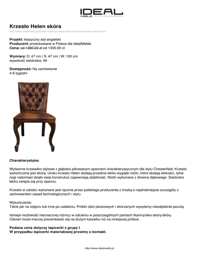 Krzesło Helen skóra http://www.idealmeble.pl/pl/offer/material/meble-skorzane/krzeslo-helen-skora.html/ Projekt: klasyczny styl angielski Producent: produkowane w Polsce dla IdealMeble Cena: od 1380.00 zł od 1300.00 zł Wymiary: D: 47 cm | S: 47 cm | W: 100 cm wysokość siedziska: 49 Dostępność: Na zamówienie 4-6 tygodni Charakterystyka: Wytworne krzesełko stylowe z głęboko pikowanym oparciem charakterystycznym dla stylu Chesterfield. Krzesło wykończone jest skórą. Uroku krzesłu Helen dodają przednie lekko wygięte nóżki, które dodają lekkości, tylne nogi natomiast dzięki swej konstrukcji zapewniają stabilność. Nóżki wykonane z drewna dębowego. Siedzisko lekko zwięża się przy oparciu. Krzesło w całości wykonane jest ręcznie przez polskiego producenta z troską o najdrobniejsze szczegóły z zachowaniem zasad technologicznych i stylu. Wykończenie: Takie jak na zdjęciu lub inne po ustaleniu. Próbki obić pluszowych i skórzanych wysyłamy nieodpłatnie pocztą. Istnieje możliwość nieznacznej różnicy w odcieniu w poszczególnych partiach tkaniny/eko-skóry/skóry. Odcień może inaczej prezentować się na dużym kawałku niż na mniejszej próbce. Podana cena dotyczy tapicerki z grupy I W przypadku tapicerki materiałowej prosimy o kontakt. http://www.idealmeble.pl Dostępne wersje produktu: nazwa produktu Krzesło Helen skóra warianty Tapicerka skóra naturalna gr I cena dostępne 1380.00zł 1300.00zł 4-6 tygodni Krzesło Helen skóra Tapicerka skóra naturalna gr II 1580.00zł 1495.00zł 4-6 tygodni http://www.idealmeble.pl Zdjęcia produktu: http://www.idealmeble.pl Powered by TCPDF (www.tcpdf.org)