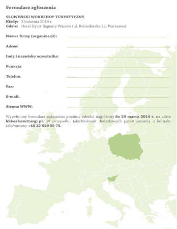 Formularz zgłoszenia SŁOWEŃSKI WORKSHOP TURYSTYCZNY Kiedy: 3 kwietnia 2014 r. Gdzie: Hotel Hyatt Regency Warsaw (ul. Belwederska 23, Warszawa) Nazwa firmy (organizacji): .........………………………………………………………………………… Adres: ..........……………………………………………………………………….. Imię i nazwisko uczestnika: .........………………………………………………………………………… Funkcja: .........………………………………………………………………………… Telefon: .........………………………………………………………………………… Fax: .........………………………………………………………………………… E-mail: .........………………………………………………………………………… Strona WWW: .........………………………………………………………………………… Wypełniony formularz zgłoszenia prosimy odesłać najpóźniej do 20 marca 2014 r. na adres [email protected]. W przypadku jakichkolwiek dodatkowych pytań prosimy o kontakt telefoniczny +4822 529 39 73.