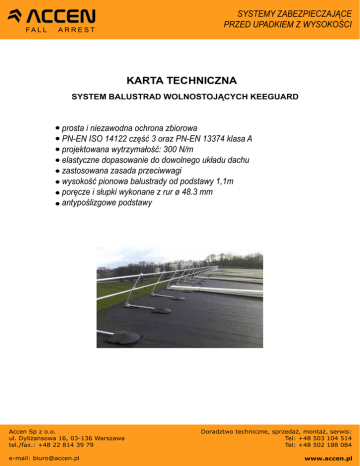 FA L L ARREST SYSTEMY ZABEZPIECZAJĄCE PRZED UPADKIEM Z WYSOKOŚCI KARTA TECHNICZNA SYSTEM BALUSTRAD WOLNOSTOJĄCYCH KEEGUARD prosta i niezawodna ochrona zbiorowa PN-EN ISO 14122 część 3 oraz PN-EN 13374 klasa A projektowana wytrzymałość: 300 N/m elastyczne dopasowanie do dowolnego układu dachu zastosowana zasada przeciwwagi wysokość pionowa balustrady od podstawy 1,1m poręcze i słupki wykonane z rur ø 48.3 mm antypoślizgowe podstawy Accen Sp z o.o. ul. Dyliżansowa 16, 03-136 Warszawa tel./fax.: +48 22 814 39 79 e-mail: [email protected] Doradztwo techniczne, sprzedaż, montaż, serwis: Tel: +48 503 104 514 Tel: +48 502 188 084 www.accen.pl FA L L ARREST SYSTEMY ZABEZPIECZAJĄCE PRZED UPADKIEM Z WYSOKOŚCI Wolnostojący system balustrad KeeGuard przeznaczony jest do zabezpieczania krawędzi dachu. Działa na zasadzie zastosowania sprawdzonej zasadzie przeciwwag ograniczających przesunięcie balustrady. System nie narusza poszycia dachu zapewniając elastyczne dopasowanie do dowolnego układu dachu, dzięki czemu zabezpieczona może zostać niemal każda powierzchnia o nachyleniu do 3 stopni. Podstawowy układ systemu jest zgodny z normą PN-EN ISO 14122 część 3 oraz PN-EN 13374 klasa A - dla dachów o nachyleniu do 10 stopni. System można montować na dachach bitumicznych, betonowych, asfaltowych oraz na membranie PCW. Zestawy wyposażone są w podkładki antypoślizgowe a kolorowe nakładki zwiększające widoczność i minimalizujące ryzyko potknięcia. Projektowana wytrzymałość to 300 N/m z siłą przyłożoną poziomo wzdłuż górnej poręczy. Poręcze i słupki wykonane z rur o średnicy zewnętrznej 48.3mm zgodnie z PN-EN 39. System może być indywidualnie dopasowany do istniejącej na dachu infrastruktury, np: drabin, włazów. Accen Sp z o.o. ul. Dyliżansowa 16, 03-136 Warszawa tel./fax.: +48 22 814 39 79 e-mail: [email protected] Doradztwo techniczne, sprzedaż, montaż, serwis: Tel: +48 503 104 514 Tel: +48 502 188 084 www.accen.pl