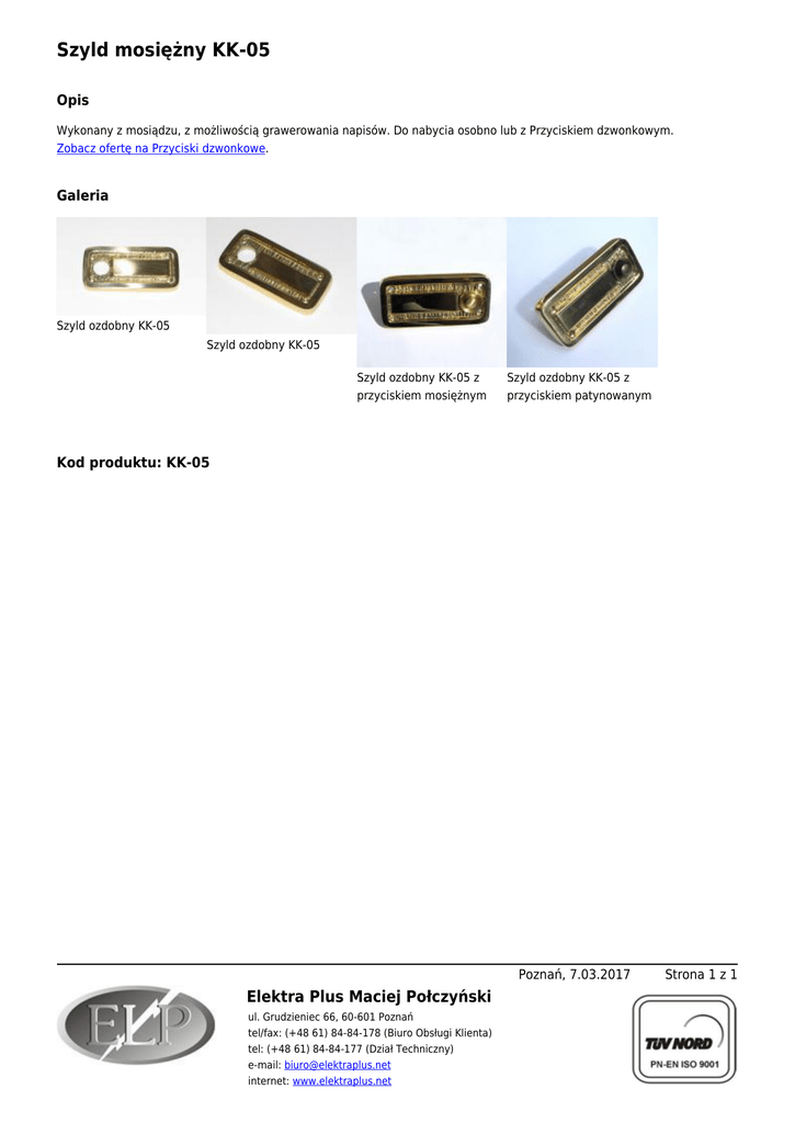 Szyld mosiężny KK-05 Opis Wykonany z mosiądzu, z możliwością grawerowania napisów. Do nabycia osobno lub z Przyciskiem dzwonkowym. Zobacz ofertę na Przyciski dzwonkowe. Galeria Szyld ozdobny KK-05 Szyld ozdobny KK-05 Szyld ozdobny KK-05 z przyciskiem mosiężnym Szyld ozdobny KK-05 z przyciskiem patynowanym Kod produktu: KK-05 Poznań, 7.03.2017 Elektra Plus Maciej Połczyński ul. Grudzieniec 66, 60-601 Poznań tel/fax: (+48 61) 84-84-178 (Biuro Obsługi Klienta) tel: (+48 61) 84-84-177 (Dział Techniczny) e-mail: [email protected] internet: www.elektraplus.net Strona 1 z 1