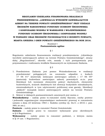 Załącznik nr 1 do Uchwały nr 580/2016 .Zarządu Powiatu Gnieźnieńskiego z dnia 4 maja 2016 r. REGULAMIN UDZIELANIA FINANSOWANIA REALIZACJI PRZEDSIĘWZIĘCIA: „LIKWIDACJA WYROBÓW ZAWIERAJĄCYCH AZBEST NA TERENIE POWIATU GNIEŹNIEŃSKIEGO” PRZY UDZIALE ŚRODKÓW NARODOWEGO FUNDUSZU OCHRONY ŚRODOWISKA I GOSPODARKI WODNEJ W WARSZAWIE I WOJEWÓDZKIEGO FUNDUSZU OCHRONY ŚRODOWISKA I GOSPODARKI WODNEJ W POZNANIU ORAZ ŚRODKÓW POCHODZĄCYCH Z BUDŻETU POWIATU, MIASTA GNIEZNA I GMIN POWIATU GNIEŹNIEŃSKIEGO NA ROK 2016. Rozdział I Postanowienia ogólne §1 Regulamin udzielania finansowania realizacji przedsięwzięcia: „Likwidacja wyrobów zawierających azbest na terenie Powiatu Gnieźnieńskiego”, zwany dalej „Regulaminem”, określa cele, zasady i tryb postępowania przy przyznawaniu i rozliczaniu środków finansowych na wykonanie Zadania. §2 1. Przedmiotem Zadania jest pomoc Wnioskodawcom w realizacji przedsięwzięć polegających na usuwaniu odpadów o kodach 17 06 01* (materiały izolacyjne zawierające azbest) i 17 06 05* (materiały budowlane zawierające azbest) powstałych m.in. przy likwidacji lub wymianie elementów pokryć dachowych, elementów budowlanych, ścianek działowych lub elewacji budynków mieszkalnych, niemieszkalnych w tym użyteczności publicznej oraz garaży, likwidacji „dzikich” wysypisk śmieci zawierających azbest na terenie Powiatu Gnieźnieńskiego. 2. Ilekroć w dalszych postanowieniach umownych jest mowa o: Wnioskodawcy – należy przez to rozumieć osoby fizyczne, osoby prawne i jednostki organizacyjne nieposiadające osobowości prawnej w rozumieniu ustawy z dnia 23 kwietnia 1964 r. Kodeks cywilny (tj. Dz.U. z 2016 r. poz. 380; ze zm.). Powiecie – należy przez to rozumieć Powiat Gnieźnieński. Zadaniu – należy przez to rozumieć wykonanie prac określonych w § 6 Regulaminu. Wykonawcy – należy przez to rozumieć podmiot, o którym mowa w § 14 ust. 1 Regulaminu. 1 Funduszu – należy przez to rozumieć środki przeznaczone na realizację zadania, o których mowa w § 4 Regulaminu, pochodzące z Narodowego Funduszu Ochrony Środowiska i Gospodarki Wodnej w Warszawie (NFOŚiGW), Wojewódzkiego Funduszu Ochrony Środowiska i Gospodarki Wodnej w Poznaniu (WFOŚiGW), budżetu Powiatu oraz budżetu Miasta Gniezna i gmin Powiatu Gnieźnieńskiego, w których przeprowadzono, zgodnie z oświadczeniem gmin, inwentaryzację wyrobów zawierających azbest, a jej wyniki zostały ujęte w Powiatowym Programie Usuwania Azbestu i Wyrobów Zawierających Azbest dla Powiatu Gnieźnieńskiego oraz w aktualizowanej bazie azbestowej. 3. W ramach realizacji przedsięwzięcia nie będą finansowane koszty związane z zakupem i montażem nowych pokryć dachowych, elementów budowlanych, elewacji i innych elementów. §3 Procedury z zakresu postępowania objętego przedmiotem niniejszego Regulaminu nadzoruje Wydział Ochrony Środowiska Starostwa Powiatowego w Gnieźnie. Rozdział II Środki na finansowanie zadania §4 Środki na finansowanie Zadania pochodzą z Funduszu w wysokości deklarowanej przez podmioty uczestniczące w finansowaniu Zadania. I. Zadeklarowane przez Miasto Gniezno i gminy uczestniczące w finansowaniu środki finansowe w 2016 r. wynoszą: Lp. Miasto i/lub Gmina Zadeklarowane środki [zł] 1. Trzemeszno 25 000 2. Gmina Gniezno 20 000 3. Witkowo 20 000 4. Kiszkowo 15 000 5. Kłecko 12 000 6. Łubowo 10 000 7. Mieleszyn 10 000 2 8. Czerniejewo 8 000 9. Niechanowo 8 000 10. Miasto Gniezno 5 000 Razem 133 000 Środki finansowe zadeklarowane przez gminy na realizację Zadania zostaną przekazane do Powiatu przed rozpoczęciem realizacji zadania, na podstawie zawartej umowy dwustronnej, w ciągu 14 dni od dnia jej podpisania. Wzór umowy przekazania środków finansowych na realizację przedsięwzięcia: Likwidacja wyrobów zawierających azbest, zawartej z Gminą stanowi załącznik nr 1 do niniejszego regulaminu. II. Środki Powiatu w 2016 r. przeznaczone na realizację zadania wynoszą: 50 000 zł brutto III. Środki NFOŚiGW i WFOŚiGW w 2016 r. zadeklarowane na realizację zadania wynoszą: 300 000 zł brutto IV. Ogółem środki finansowe w 2016 r. z Funduszu przeznaczone na likwidację wyrobów zawierających azbest w Powiecie Gnieźnieńskim wynoszą: 483 000 zł brutto V. Udział poszczególnych podmiotów w finansowaniu Zadania stanowi: NFOŚIGW w Warszawie i WFOŚiGW w Poznaniu - zgodnie z umową zawartą pomiędzy Powiatem a WFOŚiGW – do 100% kosztów kwalifikowanych brutto realizacji zadania nie więcej jednak niż 300 000,00 złotych całości zadania i nie przekraczając 600 zł/Mg usuniętych wyrobów zawierających azbest, Budżet gmin - 85% pozostałych kosztów realizacji zadania nie objętych udziałem WFOŚiGW, nie przekraczając deklarowanych przez gminy środków budżetowych, Budżet Powiatu - nadzór i rozliczenie zadania z WFOŚiGW oraz pozostałe koszty realizacji zadania nie objęte udziałem gmin i WFOŚiGW. Rozdział III Wnioskodawcy uprawnieni do korzystania ze środków 3 §5 1. Środki z Funduszu mogą być przyznawane Wnioskodawcom pod warunkiem, że: a) złożyli wniosek do urzędu gminy właściwego ze względu na miejsce położenia nieruchomości lub jej części zgodnie ze wzorem określonym w załączniku nr 2. Wzór wniosku dostępny jest na stronie internetowej www.naszesrodowisko.pl oraz we właściwych ze względu na miejsce zamieszkania urzędach gmin. b) posiadają tytuł prawny do nieruchomości lub jej części, która znajduje się na terenie Powiatu. c) na terenie nieruchomości lub jej części nie jest prowadzona działalność gospodarcza. d) są ujęci w Wojewódzkiej Bazie Danych o Wyrobach i Odpadach Zawierających Azbest. 2. W przypadku nieruchomości, w stosunku do których tytuł prawny przysługuje więcej niż jednej osobie, konieczne jest podpisanie wniosku jak i spełnienie innych wymogów przewidzianych w regulaminie przez wszystkie te osoby lub załączenie pe