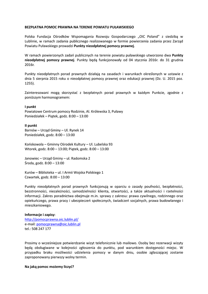 BEZPŁATNA POMOC PRAWNA NA TERENIE POWIATU PUŁAWSKIEGO Polska Fundacja Ośrodków Wspomagania Rozwoju Gospodarczego „OIC Poland” z siedzibą w Lublinie, w ramach zadania publicznego realizowanego w formie powierzenia zadania przez Zarząd Powiatu Puławskiego prowadzi Punkty nieodpłatnej pomocy prawnej. W ramach powierzonych zadań publicznych na terenie powiatu puławskiego utworzono dwa Punkty nieodpłatnej pomocy prawnej. Punkty będą funkcjonowały od 04 stycznia 2016r. do 31 grudnia 2016r. Punkty nieodpłatnych porad prawnych działają na zasadach i warunkach określonych w ustawie z dnia 5 sierpnia 2015 roku o nieodpłatnej pomocy prawnej oraz edukacji prawnej (Dz. U. 2015 poz. 1255). Zainteresowani mogą skorzystać z bezpłatnych porad prawnych w każdym Punkcie, zgodnie z poniższym harmonogramem: I punkt Powiatowe Centrum pomocy Rodzinie, Al. Królewska 3, Puławy Poniedziałek – Piątek, godz. 8:00 – 13:00 II punkt Barnów – Urząd Gminy – Ul. Rynek 14 Poniedziałek, godz. 8:00 – 13:00 Końskowola – Gminny Ośrodek Kultury – Ul. Lubelska 93 Wtorek, godz. 8:00 – 13:00; Piątek, godz. 8:00 – 13:00 Janowiec – Urząd Gminy – ul. Radomska 2 Środa, godz. 8:00 – 13:00 Kurów – Biblioteka – ul. I Armii Wojska Polskiego 1 Czwartek, godz. 8:00 – 13:00 Punkty nieodpłatnych porad prawnych funkcjonują w oparciu o zasady poufności, bezpłatności, bezstronności, niezależności, samodzielności klienta, otwartości, a także aktualności i rzetelności informacji. Zakres poradnictwa obejmuje m.in. sprawy z zakresu: prawa cywilnego, rodzinnego oraz opiekuńczego, prawa pracy i ubezpieczeń społecznych, świadczeń socjalnych, prawa budowlanego i mieszkaniowego. Informacje i zapisy: http://pomocprawna.oic.lublin.pl/ e-mail: [email protected] tel.: 508 247 177 Prosimy o wcześniejsze potwierdzanie wizyt telefonicznie lub mailowo. Osoby bez rezerwacji wizyty będą obsługiwane w kolejności zgłoszenia do punktu, pod warunkiem dostępności miejsc. W przypadku braku możliwości udzielenia pomocy w danym dniu, osobie zgłaszającej zostanie zaproponowany pierwszy wolny termin. Na jaką pomoc możemy liczyć? Bezpłatna pomoc prawna obejmuje: 1. poinformowanie osoby uprawnionej o obowiązującym stanie prawnym, o przysługujących jej uprawnieniach lub o spoczywających na niej obowiązkach, 2. wskazanie osobie uprawnionej sposobu rozwiązania jej problemu prawnego, 3. udzielenie pomocy w sporządzeniu projektu pisma w sprawach, o których mowa w pkt 1 i 2, z wyłączeniem pism procesowych w toczącym się postępowaniu przygotowawczym lub sądowym i pism w toczącym się postępowaniu sądowo-administracyjnym, 4. sporządzenie projektu pisma o zwolnienie od kosztów sądowych lub ustanowienie pełnomocnika z urzędu w postępowaniu sądowym lub ustanowienie adwokata, radcy prawnego, doradcy podatkowego lub rzecznika patentowego w postępowaniu sądowoadministracyjnym. Nieodpłatna pomoc prawna nie obejmuje spraw: 1. podatkowych związanych z prowadzeniem działalności gospodarczej; 2. z zakresu prawa celnego, dewizowego i handlowego; 3. związanych z prowadzeniem działalności gospodarczej, z wyjątkiem przygotowania do rozpoczęcia tej działalności Kto może skorzystać? Nieodpłatna pomoc prawna przysługuje Lp. osobie fizycznej, zwanej dalej "osobą Sposób udokumentowania uprawnienia uprawnioną": 1. której w okresie 12 miesięcy poprzedzających zwrócenie się o udzielenie nieodpłatnej pomocy prawnej zostało przyznane świadczenie z pomocy społecznej na podstawie ustawy z dnia 12 marca 2004 r. o pomocy społecznej (Dz. U. z 2015 r. poz. 163, 693 i 1045 z późn. zm.) i wobec której w tym okresie nie wydano decyzji o zwrocie nienależnie pobranego świadczenia 2. która posiada ważną Kartę Dużej Rodziny, o przedłożenie ważnej Karty Dużej Rodziny, o której mowa w ustawie z dnia 5 grudnia 2014 r. której mowa w ustawie z dnia 5 grudnia 2014 r. o Karcie Dużej Rodziny (Dz. U. poz. 1863) o Karcie Dużej Rodziny 3. która uzyskała zaświadczenie, o którym mowa w ustawie z dnia 24 stycznia 1991 r. o kombatantach oraz niektórych osobach będących ofiarami represji wojennych i okresu powojennego (Dz. U. z 2014 r. poz. 1206 oraz z 2015 r. poz. 693) przedłożenie zaświadczenia, o którym mowa w ustawie z dnia 24 stycznia 1991 r. o kombatantach oraz niektórych osobach będących ofiarami represji wojennych i okresu powojennego 4. która posiada ważną legitymację weterana albo legitymację weterana poszkodowanego, o których mowa w ustawie z dnia 19 sierpnia 2011 r. o weteranach działań poza granicami państwa (Dz. U. Nr 205, poz. 1203) przedłożenie ważnej legitymacji weterana albo legitymacji weterana poszkodowanego, o których mowa w ustawie z dnia 19 sierpnia 2011 r. o weteranach działań poza granicami państwa 5. która nie ukończyła 26 lat przedłożenie tożsamość przedłożenie oryginału albo odpisu decyzji o przyznaniu świadczenia z pomocy społecznej lub zaświadczenia o udzieleniu świadczenia, o którym mowa w art. 106 ust. 2 ustawy z dnia 12 marca 2004 r. o pomocy społecznej dokumentu stwierdzającego przedłożenie tożsamość dokumentu stwierdzającego 6. która ukończyła 65 lat 7. która w wyniku wystąpienia klęski żywiołowej, katastrofy naturalnej lub awarii technicznej złożenie oświadczenia, że zachodzi co najmniej znalazła się w sytuacji zagrożenia lub poniosła jedna z okoliczności wymienionych straty Prowadzenie punktów nieodpłatnej pomocy prawnej realizowane jest przez Polską Fundację Ośrodków Wspomagania Rozwoju Gospodarczego "OIC Poland" w ramach zadania publicznego realizowanego w formie powierzenia zadania przez Zarząd Powiatu Puławskiego.
