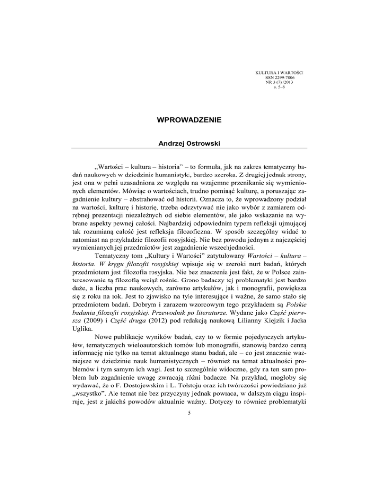 KULTURA I WARTOŚCI ISSN 2299-7806 NR 3 (7) /2013 s. 5–8 WPROWADZENIE Andrzej Ostrowski „Wartości – kultura – historia” – to formuła, jak na zakres tematyczny badań naukowych w dziedzinie humanistyki, bardzo szeroka. Z drugiej jednak strony, jest ona w pełni uzasadniona ze względu na wzajemne przenikanie się wymienionych elementów. Mówiąc o wartościach, trudno pominąć kulturę, a poruszając zagadnienie kultury – abstrahować od historii. Oznacza to, że wprowadzony podział na wartości, kulturę i historię, trzeba odczytywać nie jako wybór z zamiarem odrębnej prezentacji niezależnych od siebie elementów, ale jako wskazanie na wybrane aspekty pewnej całości. Najbardziej odpowiednim typem refleksji ujmującej tak rozumianą całość jest refleksja filozoficzna. W sposób szczególny widać to natomiast na przykładzie filozofii rosyjskiej. Nie bez powodu jednym z najczęściej wymienianych jej przedmiotów jest zagadnienie wszechjedności. Tematyczny tom „Kultury i Wartości” zatytułowany Wartości – kultura – historia. W kręgu filozofii rosyjskiej wpisuje się w szeroki nurt badań, których przedmiotem jest filozofia rosyjska. Nie bez znaczenia jest fakt, że w Polsce zainteresowanie tą filozofią wciąż rośnie. Grono badaczy tej problematyki jest bardzo duże, a liczba prac naukowych, zarówno artykułów, jak i monografii, powiększa się z roku na rok. Jest to zjawisko na tyle interesujące i ważne, że samo stało się przedmiotem badań. Dobrym i zarazem wzorcowym tego przykładem są Polskie badania filozofii rosyjskiej. Przewodnik po literaturze. Wydane jako Część pierwsza (2009) i Część druga (2012) pod redakcją naukową Lilianny Kiejzik i Jacka Uglika. Nowe publikacje wyników badań, czy to w formie pojedynczych artykułów, tematycznych wieloautorskich tomów lub monografii, stanowią bardzo cenną informację nie tylko na temat aktualnego stanu badań, ale – co jest znacznie ważniejsze w dziedzinie nauk humanistycznych – również na temat aktualności problemów i tym samym ich wagi. Jest to szczególnie widoczne, gdy na ten sam problem lub zagadnienie uwagę zwracają różni badacze. Na przykład, mogłoby się wydawać, że o F. Dostojewskim i L. Tołstoju oraz ich twórczości powiedziano już „wszystko”. Ale temat nie bez przyczyny jednak powraca, w dalszym ciągu inspiruje, jest z jakichś powodów aktualnie ważny. Dotyczy to również problematyki 5 A. OSTROWSKI – WPROWADZENIE podejmowanej przez innych przedstawicieli myśli rosyjskiej, o których mowa w opublikowanych artykułach. Mimo że większa część prezentowanych w tomie prac przedstawia wyniki badań z zakresu historii filozofii, to analizowana przez ich autorów problematyka powinna być jednak odczytywana nie tylko jako przedmiot badań historycznych, ale również – a może przede wszystkim – jako to, co aktualnie ważne dla współczesnych. Tom „Kultury i Wartości” poświęcony filozofii rosyjskiej otwiera artykuł Janusza Dobieszewskiego zatytułowany Filozofia religii. Współczesne horyzonty. Autor podejmuje w nim między innymi próbę określenia relacji między religią a filozofią, wyznaczając tym samym bardzo szeroki kontekst dla problematyki rozważanej w myśli rosyjskiej oraz dla problematyki podejmowanej przez autorów publikowanych artykułów. Kontekstem tym jest filozofia religii, ale wartość tego tekstu polega między innymi na tym, że zawarte w nim rozważania są uniwersalne, ponieważ dotyczą one filozofii religii jako takiej oraz jej aktualnych, ważnych dla współczesnych, problemów. Celowo podkreślam uniwersalność rozważań na temat filozofii religii, ich autor w sposób szczególny kładzie bowiem akcent na filozofię rosyjską. Pozwala to mówić o niej jako integralnym elemencie filozofii w ogóle – co nie jest jednak tezą oczywistą, ponieważ w dyskusjach nad filozofią rosyjską często podkreśla się jej odrębność. Zasadniczy cel, któremu służy skierowanie uwagi na tę filozofię, jest jednak inny. Autor wyznacza współczesne horyzonty dla filozofii religii, jednak pomimo wielości tych „horyzontów” wskazuje na jeden zasadniczy – od siebie dodam: obiecujący pod względem poznawczym i metafizycznym – kierunek, którym z pewnością warto się zainteresować, nie tylko jako przedmiotem badań, lecz również jako źródłem inspiracji – jest nim filozofia rosyjska. Jednym z elementów warunkujących oryginalność filozofii rosyjskiej jest dokonana przez jej przedstawicieli recepcja filozofii zachodnioeuropejskiej. Na to zagadnienie w artykule niemieckojęzycznym Einige Bemerkungen zum russischen Neukantianismus zwraca uwagę Władimir Biełow. Na przykładzie twórczości wybranych filozofów (A. I. Wwiedienski, B. W. Jakowenko, W. E. Sezeman) analizuje on zagadnienie neokantyzmu w Rosji. W artykule Filozofowie tylko interpretowali świat, idzie jednak o to, aby go przemienić. Filozoficzny projekt Mikołaja Fiodorowa i Mikołaja Bierdiajewa rozważane jest zagadnienie wartości i twórczości (aktu twórczego). Autor Cezar Jędrysko, odwołując się do filozofii Fiodorowa i Bierdiajewa, ale także wykorzystując – ze względu na teoretyczny kontekst trudną do pogodzenia z wybranymi poglądami filozofów – wpisaną w tytuł pracy tezę Marksa, formułuje imperatyw kategoryczny – bezwzględny nakaz twórczości. Nie chodzi tu jednak o aktywność sensu stricto artystyczną – chociaż nie jest ona wykluczona – ale o powszechne działanie twórcze jako takie, o czyn kreacji, który rozpatrywany jest w kategoriach powinności. Zasadniczym problemem staje się wówczas jej uzasadnienie oraz ocena. 6 A. OSTROWSKI – WPROWADZENIE Zagadnienie działania twórczego oraz jego efektów można rozpatrywać nie tylko jako powszechnie obowiązujący postulat kreacji, ale również jako sposób manifestacji poglądów. Ewa Cichocka w artykule Cechy swoiste sztuki w 