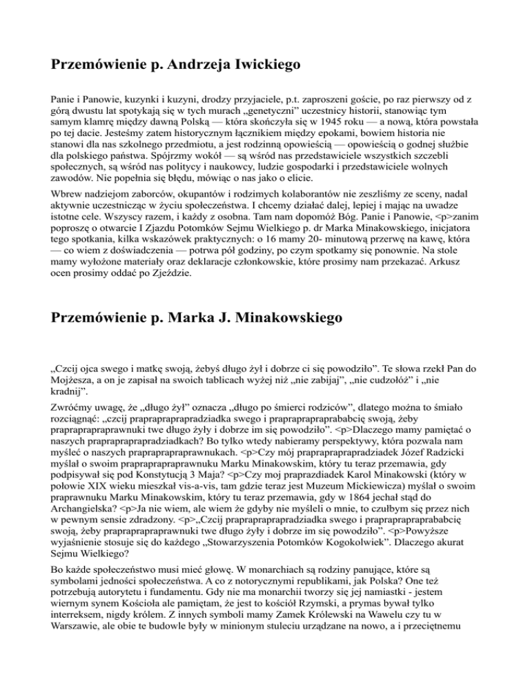 Przemówienie p. Andrzeja Iwickiego Panie i Panowie, kuzynki i kuzyni, drodzy przyjaciele, p.t. zaproszeni goście, po raz pierwszy od z górą dwustu lat spotykają się w tych murach „genetyczni” uczestnicy historii, stanowiąc tym samym klamrę między dawną Polską — która skończyła się w 1945 roku — a nową, która powstała po tej dacie. Jesteśmy zatem historycznym łącznikiem między epokami, bowiem historia nie stanowi dla nas szkolnego przedmiotu, a jest rodzinną opowieścią — opowieścią o godnej służbie dla polskiego państwa. Spójrzmy wokół — są wśród nas przedstawiciele wszystkich szczebli społecznych, są wśród nas politycy i naukowcy, ludzie gospodarki i przedstawiciele wolnych zawodów. Nie popełnia się błędu, mówiąc o nas jako o elicie. Wbrew nadziejom zaborców, okupantów i rodzimych kolaborantów nie zeszliśmy ze sceny, nadal aktywnie uczestnicząc w życiu społeczeństwa. I chcemy działać dalej, lepiej i mając na uwadze istotne cele. Wszyscy razem, i każdy z osobna. Tam nam dopomóż Bóg. Panie i Panowie, <p>zanim poproszę o otwarcie I Zjazdu Potomków Sejmu Wielkiego p. dr Marka Minakowskiego, inicjatora tego spotkania, kilka wskazówek praktycznych: o 16 mamy 20- minutową przerwę na kawę, która — co wiem z doświadczenia — potrwa pół godziny, po czym spotkamy się ponownie. Na stole mamy wyłożone materiały oraz deklaracje członkowskie, które prosimy nam przekazać. Arkusz ocen prosimy oddać po Zjeździe. Przemówienie p. Marka J. Minakowskiego „Czcij ojca swego i matkę swoją, żebyś długo żył i dobrze ci się powodziło”. Te słowa rzekł Pan do Mojżesza, a on je zapisał na swoich tablicach wyżej niż „nie zabijaj”, „nie cudzołóż” i „nie kradnij”. Zwróćmy uwagę, że „długo żył” oznacza „długo po śmierci rodziców”, dlatego można to śmiało rozciągnąć: „czcij praprapraprapradziadka swego i prapraprapraprababcię swoją, żeby prapraprapraprawnuki twe długo żyły i dobrze im się powodziło”. <p>Dlaczego mamy pamiętać o naszych praprapraprapradziadkach? Bo tylko wtedy nabieramy perspektywy, która pozwala nam myśleć o naszych prapraprapraprawnukach. <p>Czy mój praprapraprapradziadek Józef Radzicki myślał o swoim prapraprapraprawnuku Marku Minakowskim, który tu teraz przemawia, gdy podpisywał się pod Konstytucją 3 Maja? <p>Czy moj praprazdiadek Karol Minakowski (który w połowie XIX wieku mieszkał vis-a-vis, tam gdzie teraz jest Muzeum Mickiewicza) myślał o swoim praprawnuku Marku Minakowskim, który tu teraz przemawia, gdy w 1864 jechał stąd do Archangielska? <p>Ja nie wiem, ale wiem że gdyby nie myśleli o mnie, to czułbym się przez nich w pewnym sensie zdradzony. <p>„Czcij praprapraprapradziadka swego i prapraprapraprababcię swoją, żeby prapraprapraprawnuki twe długo żyły i dobrze im się powodziło”. <p>Powyższe wyjaśnienie stosuje się do każdego „Stowarzyszenia Potomków Kogokolwiek”. Dlaczego akurat Sejmu Wielkiego? Bo każde społeczeństwo musi mieć głowę. W monarchiach są rodziny panujące, które są symbolami jedności społeczeństwa. A co z notorycznymi republikami, jak Polska? One też potrzebują autorytetu i fundamentu. Gdy nie ma monarchii tworzy się jej namiastki - jestem wiernym synem Kościoła ale pamiętam, że jest to kościół Rzymski, a prymas bywał tylko interreksem, nigdy królem. Z innych symboli mamy Zamek Królewski na Wawelu czy tu w Warszawie, ale obie te budowle były w minionym stuleciu urządzane na nowo, a i przeciętnemu Polakowi niewiele są bliższe od egipskich piramid. <p>Inna notoryczna demokracja, USA, ma takie organizacje jak The National Society of the Sons of American Revolution: Narodowe Stowarzyszenie Synów Amerykańskiej Rewolucji. Jego członkami byli: George Bush (jeden i drugi), Jimmy Carter, Dwight Eisenhower, Harry Truman, Franklin i Teodor Rooseveltowie, a także Sir Winston Churchill czy Juan Carols hiszpański. <p>A gdyby u nas zgromadzić potomków „ojców-założycieli”? Kto powinien się czuć najbardziej odpowiedzialny za Polskę? Kogo u nas możnaby nazwać „ojcem-założycielem”? Kiedy obchodzimy święto państwowe? Jaka ulica jest w każdym mieście? <p>Tak, drodzy Kuzyni. Sejm Wielki (lub też Czteroletni). 461 ludzi, reprezentujących wszystkie ziemie ówczesnej Rzeczypospolitej, którzy zaprzysięgli co następuje: <p>My Rady duchowne i świeckie, i posłowie w obecności Nayiaśnieyszego Krola Jmci Pana Naszego Miłościwego z najwyższą aprobacyą i przewodniczym podpisem nayłaskawszey ręki Jego, zgromadzeni nie innym tchnący duchem, iako tylko gorącego żądania naydokładnieyszego ubezpieczenia i ulepszenia Oyczyzny naszey, bierzemy przed się iedyny sposób, tym celom wydołać mogący, to iest: Związek konfederacyi generalney, pod którym wszystkie obrady nasze mieć chcemy nierozerwane przy zachowaniu nayświątobliwszym wszystkich praw, które nam ubezpieczaią wiarę świętą naszą katolicką rzymską, całość kraiów Rzeczypospolitey, rząd wolny republikantski, osobę dostoieństwo i wszystkie prawa i prerogatywy tronu Nayiaśnieyszego Krola Stanisława Augusta łaskawie nam panuiącego, iako i magistratur wszelkich w zwykłych powinnościach, i obrębach swoich i całość obywatelskich własności. <p>Raz jeszcze powiem: my, potomkowie trzech stanów Sejmu Wielkiego, zgromadzeni nie innym tchnący duchem, iako tylko gorącego żądania naydokładnieyszego ubezpieczenia i ulepszenia Oyczyzny naszey bierzemy przed się sposób, tym celom służący, to iest: Stowarzyszenie Potomków Sejmu Wielkiego. <p>Główne zadania: 1. Być świadkiem tradycji państwowej Polski i Rzeczypospolitej Obojga Narodów. To jest cel najgłówniejszy, w którym nikt nas nie zastąpi - ani Kościół ani Zamek na Wawelu 2. Przekazywać tę tradycję kolejnym pokoleniom 3. Mówić o tej tradycji za granicą 4. Pamiętać i przypomina