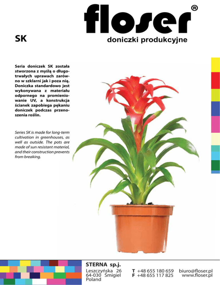 floser ® SK doniczki produkcyjne Seria doniczek SK została stworzona z myślą o długotrwałych uprawach zarówno w szklarni jak i poza nią. Doniczka standardowo jest wykonywana z materiału odpornego na promieniowanie UV, a konstrukcja ścianek zapobiega pękaniu doniczek podczas przenoszenia roślin. Series SK is made for long-term cultivation in greenhouses, as well as outside. The pots are made of sun resistant material, and their construction prevents from breaking. STERNA sp.j. Leszczyńska 26 64-030 Śmigiel Poland T +48 655 180 659 [email protected] www.floser.pl F +48 655 117 825 floser ® SK doniczki produkcyjne mm mm 0 SK 15 5 0 150 120 VOL kolor 1,5 l terakota czarny dowolny kolor na zamówienie sztuk w sztaplu sztapli na palecie 56 168 sztuk na palecie 9408 terakota SK 17 5 0 170 135 2l czarny dowolny kolor na zamówienie SK 19 5 0 190 148 3l czarny dowolny kolor na zamówienie będzie dostępna od września 2016 terakota STERNA sp.j. Leszczyńska 26 64-030 Śmigiel Poland będzie dostępna od grudnia 2016 T +48 655 180 659 [email protected] www.floser.pl F +48 655 117 825