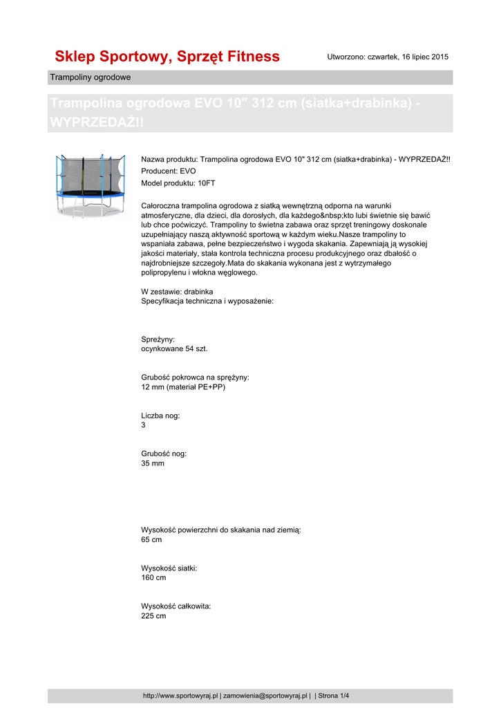 Sklep Sportowy, Sprzęt Fitness Utworzono: czwartek, 16 lipiec 2015 Trampoliny ogrodowe Trampolina ogrodowa EVO 10" 312 cm (siatka+drabinka) WYPRZEDAŻ!! Nazwa produktu: Trampolina ogrodowa EVO 10" 312 cm (siatka+drabinka) - WYPRZEDAŻ!! Producent: EVO Model produktu: 10FT Całoroczna trampolina ogrodowa z siatką wewnętrzną odporna na warunki atmosferyczne, dla dzieci, dla dorosłych, dla każdego kto lubi świetnie się bawić lub chce poćwiczyć. Trampoliny to świetna zabawa oraz sprzęt treningowy doskonale uzupełniający naszą aktywność sportową w każdym wieku.Nasze trampoliny to wspaniała zabawa, pełne bezpieczeństwo i wygoda skakania. Zapewniają ją wysokiej jakości materiały, stała kontrola techniczna procesu produkcyjnego oraz dbałość o najdrobniejsze szczegoły.Mata do skakania wykonana jest z wytrzymałego polipropylenu i włokna węglowego. W zestawie: drabinka Specyfikacja techniczna i wyposażenie: Spreżyny: ocynkowane 54 szt. Grubość pokrowca na sprężyny: 12 mm (materiał PE+PP) Liczba nog: 3 Grubość nog: 35 mm Wysokość powierzchni do skakania nad ziemią: 65 cm Wysokość siatki: 160 cm Wysokość całkowita: 225 cm http://www.sportowyraj.pl | [email protected] | | Strona 1/4 Sklep Sportowy, Sprzęt Fitness Utworzono: czwartek, 16 lipiec 2015 Trampoliny ogrodowe Trampolina ogrodowa EVO 10" 312 cm (siatka+drabinka) WYPRZEDAŻ!! Średnica powierzchni do skakania: 280 cm Max obciążenie: 150 kg Waga trampoliny: ok. 40 kg http://www.sportowyraj.pl | [email protected] | | Strona 2/4 Sklep Sportowy, Sprzęt Fitness Utworzono: czwartek, 16 lipiec 2015 Trampoliny ogrodowe Trampolina ogrodowa EVO 10" 312 cm (siatka+drabinka) WYPRZEDAŻ!! http://www.sportowyraj.pl | [email protected] | | Strona 3/4 Sklep Sportowy, Sprzęt Fitness Utworzono: czwartek, 16 lipiec 2015 Trampoliny ogrodowe Trampolina ogrodowa EVO 10" 312 cm (siatka+drabinka) WYPRZEDAŻ!! Cena: 499.00zł Dostępność: Ten produkt został dodany do sklepu w dniu środa, 29 kwiecień 2015 http://www.sportowyraj.pl | [email protected] | | Strona 4/4