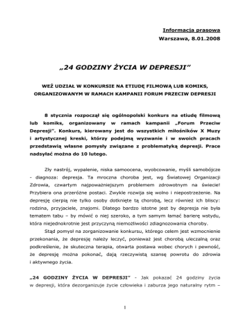 Informacja prasowa Warszawa, 8.01.2008 „24 GODZINY ŻYCIA W DEPRESJI” WEŹ UDZIAŁ W KONKURSIE NA ETIUDĘ FILMOWĄ LUB KOMIKS, ORGANIZOWANYM W RAMACH KAMPANII FORUM PRZECIW DEPRESJI 8 stycznia rozpoczął się ogólnopolski konkurs na etiudę filmową lub komiks, organizowany w ramach kampanii „Forum Przeciw Depresji”. Konkurs, kierowany jest do wszystkich miłośników X Muzy i artystycznej kreski, którzy podejmą wyzwanie i w swoich pracach przedstawią własne pomysły związane z problematyką depresji. Prace nadsyłać można do 10 lutego. Zły nastrój, wypalenie, niska samoocena, wyobcowanie, myśli samobójcze - diagnoza: depresja. Ta mroczna choroba jest, wg Światowej Organizacji Zdrowia, czwartym najpoważniejszym problemem zdrowotnym na świecie! Przybiera ona przeróżne postaci. Zwykle rozwija się wolno i niepostrzeżenie. Na depresję cierpią nie tylko osoby dotknięte tą chorobą, lecz również ich bliscy: rodzina, przyjaciele, znajomi. Dlatego bardzo istotne jest by depresja nie była tematem tabu – by mówić o niej szeroko, a tym samym łamać barierę wstydu, która niejednokrotnie jest przyczyną niemożliwości zdiagnozowania choroby. Stąd pomysł na zorganizowanie konkursu, którego celem jest wzmocnienie przekonania, że depresję należy leczyć, ponieważ jest chorobą uleczalną oraz podkreślenie, że skuteczna terapia, otwarta postawa wobec chorych i pewność, że depresję można pokonać, dają rzeczywistą szansę powrotu do zdrowia i aktywnego życia. „24 GODZINY ŻYCIA W DEPRESJI” - Jak pokazać 24 godziny życia w depresji, która dezorganizuje życie człowieka i zaburza jego naturalny rytm – 1 depresji, która zmienia percepcję widzenia świata i wprowadza chaos w każdą godzinę naszego życia? Na prace czekamy do 10 lutego. Do konkursu zostaną zakwalifikowane projekty wykonane w formie obrazu (etiuda filmowa w formie fabuły, animacji itp.) lub komiksu. W przypadku drugiej kategorii jedynym wymogiem technicznym jest możliwość przeniesienia projektu na papier i zapisania go w formacie wektorowym (Format strony komiksu to 40 cm w poziomie i 60 cm w pionie, 300dpi [wybrane prace będą drukowane na potrzeby wystawy]. Jeśli komiks będzie miał więcej niż jedną stronę, należy w nazwie pliku podać numer odpowiadający kolejności (np. „strona_1”, „strona_2” itp.) Zgłoszone projekty będą oceniane przez Jury, w skład, którego wejdą: przedstawiciele firmy Servier Polska i Fundacji ITAKA oraz Mateusz Subieta laureat m.in. Złotego Lwa w Cannes oraz zdobywca francuskiej nagrody Nisi Masa za scenariusz do filmu krótkometrażowego, pracownik Platige Image (czołowe i wielokrotnie nagradzane studio postprodukcyjne w Polsce) obecnie przygotowujący swój debiut reżyserski. Wśród najlepszych projektów Jury przyzna nagrody: dwie nagrody główne w każdej z kategorii – kamera (kategoria etiuda filmowa) o wartości 2.000 PLN, laptop (kategoria komiks) o wartości 2.000 PLN oraz 6 wyróżnień (po 3 w każdej z kategorii) – programy graficzne o wartości 500 PLN każdy. Jury może dokonać innego podziału nagród. Rozstrzygnięcie konkursu, uroczyste ogłoszenie wyników i wręczenie nagród laureatom nastąpi 18 lutego 2009 roku w Warszawie. Prace należy przysyłać na adres Biura Konkursu, do dnia 10 lutego 2009 roku (decyduje data dostarczenia przesyłki do Biura Konkursu). Wszelkie dodatkowe informacje na temat konkursu można uzyskać w Biurze Konkursowym: PRIMUM Public Relations, ul. Widok 8, 00-023 Warszawa, tel. 22/690-67-50, mail [email protected] Kampania społeczna Forum Przeciw Depresji jest organizowana od trzech lat przez firmę Servier Polska przy współpracy z Fundacją ITAKA – Centrum Poszukiwań Ludzi Zaginionych, która między innymi udziela pomocy i wsparcia 2 osoby zmagającym się z problemem depresji. Kampania ma na celu poszerzenie wiedzy w zakresie depresji, uświadomienie społeczeństwu, że depresja stanowi jeden z najpoważniejszych problemów zdrowotnych na świecie. Nie jest to stan, który mija, ale choroba, którą trzeba leczyć. Ma także pomóc przełamać opór i niechęć osób chorych i ich rodzin przed zgłoszeniem się do lekarzy, terapeutów i grup wsparcia. W ramach Forum Przeciw Depresji planowane są liczne działania kierowane zarówno dla osób chorujących i ich rodzin, które, na co dzień muszą zmagać się z problemem depresji, jak i dla osób zdrowych, które z różnych powodów (prywatnych lub zawodowych) interesują się tym zagadnieniem - www.forumprzeciwdepresji.pl Grupa Badawcza Servier, obecna w Polsce strukturalnie od 1992 roku, to największa, niezależna francuska firma farmaceutyczna doskonale znana z działań o charakterze edukacyjnym propagujących profilaktykę zdrowotną wśród pacjentów. Servier Polska od kilku lat organizuje społeczne, bezpłatne akcje edukacyjno-diagnostyczne o charakterze ogólnopolskim prowadzone pod wspólnym hasłem „Servier w trosce o Twoje zdrowie”. ITAKA – Centrum Poszukiwań Ludzi Zaginionych jest jedyną w Polsce instytucją zajmującą się całościowo problemem zaginięcia. Działa od 1999 roku, rocznie przyjmuje ok. 1000 zgłoszeń zaginięć. ITAKA wspiera poszukiwania zaginionych, udziela pomocy ich rodzinom. Prowadzi programy prewencyjne skierowane do grup zagrożonych problemem zaginięcia: do młodzieży – „Nie uciekaj”, do ludzi chorych – „Depresja jest chorobą. Lecz depresję”. W ramach kampanii Forum Przeciw Depresji, organizowanej wspólnie z firmą Servier Polska, ITAKA prowadzi Antydepresyjny Telefon Zaufania. Dodatkowych informacji udziela: Sylwia Olczak, Senior Account Executive PRIMUM Public Relations ul. Widok 8 (8 piętro), 00-023 Warszawa tel: 22/ 690 67 50; [email protected] 3
