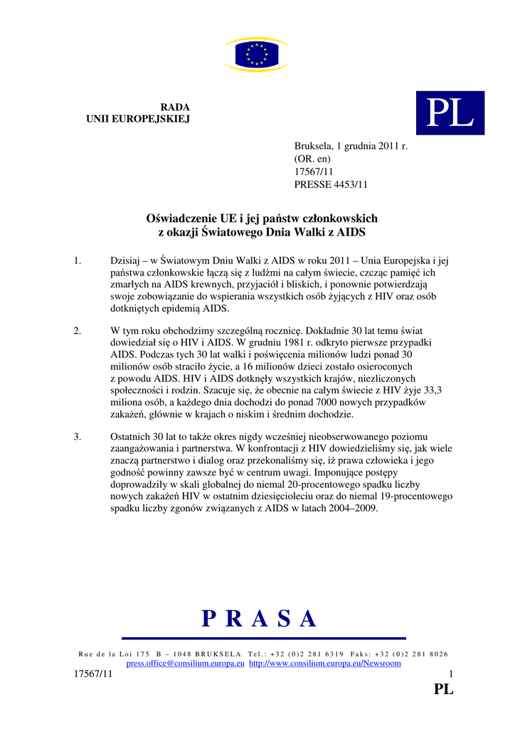 PL RADA UNII EUROPEJSKIEJ Bruksela, 1 grudnia 2011 r. (OR. en) 17567/11 PRESSE 4453/11 Oświadczenie UE i jej państw członkowskich z okazji Światowego Dnia Walki z AIDS 1. Dzisiaj – w Światowym Dniu Walki z AIDS w roku 2011 – Unia Europejska i jej państwa członkowskie łączą się z ludźmi na całym świecie, czcząc pamięć ich zmarłych na AIDS krewnych, przyjaciół i bliskich, i ponownie potwierdzają swoje zobowiązanie do wspierania wszystkich osób żyjących z HIV oraz osób dotkniętych epidemią AIDS. 2. W tym roku obchodzimy szczególną rocznicę. Dokładnie 30 lat temu świat dowiedział się o HIV i AIDS. W grudniu 1981 r. odkryto pierwsze przypadki AIDS. Podczas tych 30 lat walki i poświęcenia milionów ludzi ponad 30 milionów osób straciło życie, a 16 milionów dzieci zostało osieroconych z powodu AIDS. HIV i AIDS dotknęły wszystkich krajów, niezliczonych społeczności i rodzin. Szacuje się, że obecnie na całym świecie z HIV żyje 33,3 miliona osób, a każdego dnia dochodzi do ponad 7000 nowych przypadków zakażeń, głównie w krajach o niskim i średnim dochodzie. 3. Ostatnich 30 lat to także okres nigdy wcześniej nieobserwowanego poziomu zaangażowania i partnerstwa. W konfrontacji z HIV dowiedzieliśmy się, jak wiele znaczą partnerstwo i dialog oraz przekonaliśmy się, iż prawa człowieka i jego godność powinny zawsze być w centrum uwagi. Imponujące postępy doprowadziły w skali globalnej do niemal 20-procentowego spadku liczby nowych zakażeń HIV w ostatnim dziesięcioleciu oraz do niemal 19-procentowego spadku liczby zgonów związanych z AIDS w latach 2004–2009. PRASA Rue de la Loi 175 B – 1048 BRUKSELA Tel.: +32 (0)2 281 6319 Faks: +32 (0)2 281 8026 [email protected] http://www.consilium.europa.eu/Newsroom 17567/11 1 PL 4. Największy postęp dokonał się na obszarze najbardziej dotkniętym, czyli w krajach Afryki Subsaharyjskiej, w której żyją dwie trzecie wszystkich osób zakażonych HIV. Unia Europejska jest dumna z faktu, że wysiłki podejmowane przez nią wraz z tak istotnymi partnerami, jak: UNAIDS, WHO, Globalny Fundusz na rzecz Walki z AIDS, Gruźlicą i Malarią, UNITAID, osoby żyjące z HIV i społeczeństwo obywatelskie przyczyniły się do uzyskania niezwykłych osiągnięć w światowej konfrontacji z HIV i AIDS. W roku 2010 wysokość wkładu Unii Europejskiej do Globalnego Funduszu na rzecz Walki z AIDS, Gruźlicą i Malarią wyniosła 1,493 miliardów USD, co stanowi 53% całkowitych wpłat na ten fundusz (zliczono razem wpłaty Komisji Europejskiej i państw członkowskich). Niemniej jednak, ponad osiem milionów osób żyjących w państwach o niskim i średnim dochodzie nadal potrzebuje dostępu do skutecznego leczenia, a liczba nowych zakażeń wciąż przewyższa liczbę osób rozpoczynających leczenie. Oznacza to, że HIV i AIDS nadal są jedną z największych przeszkód na drodze tych krajów ku rozwojowi. 5. W siedmiu krajach, w tym pięciu leżących w Europie Wschodniej i Azji Środkowej, liczba zakażeń HIV w latach 2001–2009 wzrosła o ponad 25%. Dzięki partnerstwom z tymi krajami UE wzmocni swoje wysiłki na rzecz zmiany tej niemożliwej do zaakceptowania sytuacji, wzywając do pilnego zintensyfikowania programów profilaktycznych i świadczeń na szczeblu regionalnym i krajowym, które mogą doprowadzić do wyeliminowania HIV i AIDS. 6. UE odegra decydującą rolę w konfrontacji z HIV i AIDS poprzez wzmocnienie swej wiodącej pozycji i lepsze dostosowanie działań instytucji UE do zmieniającego się kontekstu HIV na szczeblu globalnym i europejskim. Wyzwaniem dla nas jest teraz utrzymanie AIDS jako kwestii priorytetowej oraz przyspieszenie działań podejmowanych na szczeblu globalnym, regionalnym, krajowym i lokalnym w celu zakończenia epidemii. 7. UE z zadowoleniem przyjmuje wszechstronny przegląd postępu realizacji zobowiązań wynikających z wszystkich milenijnych celów rozwoju z roku 2000 oraz ambitnych celów na rok 2015 określonych w deklaracji politycznej w sprawie HIV/AIDS pt. „Zwiększamy wysiłki na rzecz eliminacji HIV/AIDS” przyjętej na poświęconym AIDS posiedzeniu wysokiego szczebla Zgromadzenia Ogólnego Narodów Zjednoczonych w czerwcu 2011 r. Realizacja tych celów przybliży nas do świata bez nowych zakażeń HIV, bez zgonów związanych z AIDS i bez dyskryminacji. UE przyłącza się do społeczności osób działających przeciwko AIDS we wspieraniu strategii UNAIDS „Zero nowych zakażeń, zero dyskryminacji i zero zgonów z powodu HIV/AIDS” (Getting to zero), oraz korzystając z okazji, jaką jest Światowy Dzień Walki z AIDS, potwierdza swoją wolę udziału w realizacji naszego wspólnego zadania, jakim jest pokonanie HIV. 17567/11 2 PL 8. Ponownie potwierdzamy zobowiązanie UE do pracy na rzecz osiągnięcia wyznaczonych na rok 2015 celów polegających na rozpoczęciu leczenia antyretrowirusowego u 15 milionów osób zarażonych HIV, zmniejszeniu o połowę liczby zakażeń przenoszonych drogą płciową, zmniejszeniu o połowę liczby zakażeń HIV wśród osób przyjmujących dożylnie narkotyki, wyeliminowaniu przenoszenia HIV z matki na dziecko oraz znacznemu zmniejszeniu liczby zgonów matek z powodu AIDS. 9. UE podkreśla, że profilaktyka stanowi najskuteczniejszy sposób powstrzymania epidemii HIV. Musimy upewnić się, że strategie profilaktyczne mają kompleksowy charakter, są opracowane w oparciu o dostępną wiedzę, z pełnym poszanowaniem praw człowieka i zrozumieniem kontekstu lokalnego, przy jak najpełniejszym wykorzystaniu już istniejących metod profilaktycznych oraz jednoczesnym promowaniu nowych metod i technologii. 10. UE z niepokojem zwraca uwagę na fakt, że kobiety i dziewczęta są szczególnie narażone na zakażenie HIV ze względu na czynniki fizjologiczne, ekonomiczne i społeczne, nierówności i przemoc związane z płcią. Kobiety i dziewczęta stanowią ponad 50% wszystkich osób żyjących z 