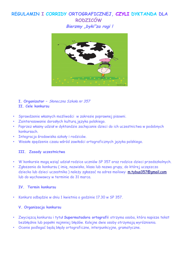 REGULAMIN I CORRIDY ORTOGRAFICZNEJ, CZYLI DYKTANDA DLA RODZICÓW Bierzmy „byki”za rogi ! I. Organizator – Słoneczna Szkoła nr 357 II. Cele konkursu • • • • • Sprawdzenie własnych możliwości w zakresie poprawnej pisowni. Zainteresowanie dorosłych kulturą języka polskiego. Poprzez własny udział w dyktandzie zachęcanie dzieci do ich uczestnictwa w podobnych konkursach. Integracja środowiska szkoły i rodziców. Wesołe spędzenie czasu wśród zawiłości ortograficznych języka polskiego. III. Zasady uczestnictwa • • W konkursie mogą wziąć udział rodzice uczniów SP 357 oraz rodzice dzieci przedszkolnych. Zgłoszenia do konkursu ( imię, nazwisko, klasa lub nazwa grupy, do której uczęszcza dziecko lub dzieci uczestnika ) należy zgłaszać na adres mailowy: [email protected] lub do wychowawcy w terminie do 31 marca. IV. Termin konkursu • Konkurs odbędzie w dniu 1 kwietnia o godzinie 17.30 w SP 357. V. Organizacja konkursu • • Zwycięzcą konkursu i tytuł Supermatadora ortografii otrzyma osoba, która napisze tekst bezbłędnie lub popełni najmniej błędów. Kolejne dwie osoby otrzymają wyróżnienia. Ocenie podlegać będą błędy ortograficzne, interpunkcyjne, gramatyczne. • • • • • • • • Błędy pierwszego stopnia – ortograficzne ( h-ch, ż-rz, u-ó, pisownia małą i wielką literą nazw własnych ). Błędy drugiego stopnia – pisownia „nie” z różnymi częściami mowy, łączna i rozdzielna pisownia innych wyrazów, błędy fonetyczne, gramatyczne, pisownia cząstek „bym”, „byś”, „by” z różnymi częściami mowy, pisownia rzeczowników zakończonych na i, ii, ji. Błędy trzeciego stopnia – błędy interpunkcyjne ( trzy błędy interpunkcyjne liczone będą jako jeden błąd pierwszego stopnia ). Czas trwania dyktanda około 30 minut. Organizatorzy zapewnią karty do pisania, uczestnicy proszeni są o przyniesienie długopisów piszących na niebiesko lub czarno. W trakcie dyktanda nie wolno korzystać z „pomocy naukowych”: słowników i urządzeń elektronicznych. Salę można będzie opuścić po zebraniu prac od wszystkich uczestników. Wyniki konkursu zostaną podane na stronie internetowej szkoły, natomiast wręczenie nagród i dyplomów planowane jest w dniu Pikniku 11 czerwca. Wszyscy uczestnicy proszeni są o wzięcie pod uwagę, że spotykamy się 1 kwietnia!!!