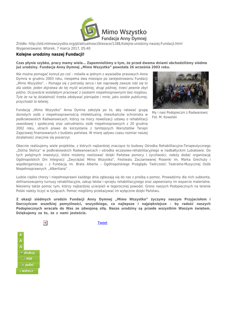 Źródło: http://old.mimowszystko.org/pl/aktualnosci/biezace/1188,Kolejne-urodziny-naszej-Fundacji.html Wygenerowano: Wtorek, 7 marca 2017, 05:40 Kolejne urodziny naszej Fundacji! Czas płynie szybko, pracy mamy wiele… Zapomnieliśmy o tym, że przed dwoma dniami obchodziliśmy siódme już urodziny. Fundacja Anny Dymnej „Mimo Wszystko” powstała 26 września 2003 roku. Nie można pomagać komuś po coś – mówiła w jednym z wywiadów prasowych Anna Dymna w grudniu 2003 roku, niespełna dwa miesiące po zarejestrowaniu Fundacji „Mimo Wszystko”. – Pomaga się z potrzeby serca i tak naprawdę zawsze robi się to dla siebie. Jeden dojrzewa do tej myśli wcześniej, drugi później, trzeci pewnie zbyt późno. Oczywiście wolałabym pracować z osobami niepełnosprawnymi bez rozgłosu. Tyle że na tę działalność trzeba zdobywać pieniądze i mnie, jako osobie publicznej, przychodzi to łatwiej. Fundację „Mimo Wszystko” Anna Dymna założyła po to, aby ratować grupę dorosłych osób z niepełnosprawnością intelektualną, mieszkańców schroniska w podkrakowskich Radwanowicach, którzy na mocy nowelizacji ustawy o rehabilitacji zawodowej i społecznej oraz zatrudnieniu osób niepełnosprawnych z 20 grudnia 2002 roku, utracili prawo do korzystania z tamtejszych Warsztatów Terapii Zajęciowej finansowanych z budżetu państwa. W miarę upływu czasu rozmiar naszej działalności znacznie się poszerzył. My i nasi Podopieczni z Radwanowic Fot. M. Kowalski Obecnie realizujemy wiele projektów, z których najbardziej znaczące to budowy Ośrodka Rehabilitacyjno-Terapeutycznego „Dolina Słońca” w podkrakowskich Radwanowicach i ośrodka wczasowo-rehabilitacyjnego w nadbałtyckim Lubiatowie. Do tych potężnych inwestycji, które możemy realizować dzięki Państwa pomocy i życzliwości, należy dodać organizację Ogólnopolskich Dni Integracji „Zwyciężać Mimo Wszystko”, Festiwalu Zaczarowanej Piosenki im. Marka Grechuty i współorganizację – z Fundacją im. Brata Alberta – Ogólnopolskiego Przeglądu Twórczości Teatralno-Muzycznej Osób Niepełnosprawnych „Albertiana” . Ludzie ciężko chorzy i niepełnosprawni każdego dnia zgłaszają się do nas z prośbą o pomoc. Prowadzimy dla nich subkonta, dofinansowujemy turnusy rehabilitacyjne, zakup leków i sprzętu rehabilitacyjnego oraz zapewniamy im wsparcie materialne. Niesiemy także pomoc tym, którzy najbardziej ucierpieli w tegorocznej powodzi. Grono naszych Podopiecznych na terenie Polski należy liczyć w tysiącach. Pomoc mogliśmy przekazywać im wyłącznie dzięki Państwu. Z okazji siódmych urodzin Fundacji Anny Dymnej „Mimo Wszystko” życzymy naszym Przyjaciołom i Darczyńcom wszelkiej pomyślności, wszystkiego, co najlepsze i najpiękniejsze – by radość naszych Podopiecznych wracała do Was ze zdwojoną siłą. Nasze urodziny są przede wszystkim Waszym świętem. Dziękujemy za to, że z nami jesteście. Tweet