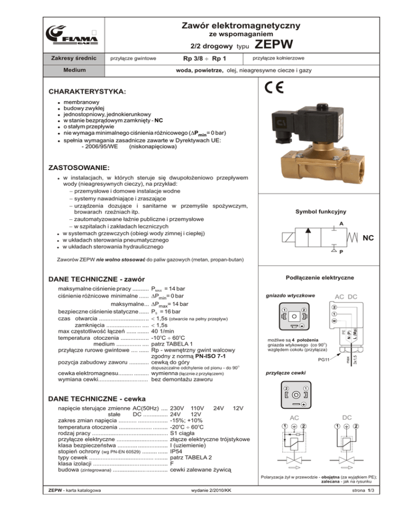 Zawór elektromagnetyczny Ò ze wspomaganiem 2/2 drogowy typu Zakresy średnic przyłącze gwintowe Medium ZEPW przyłącze kołnierzowe Rp 3/8 ¸ Rp 1 woda, powietrze, olej, nieagresywne ciecze i gazy CHARAKTERYSTYKA: ! ! ! ! ! ! ! membranowy budowy zwykłej jednostopniowy, jednokierunkowy w stanie bezprądowym zamknięty - NC o stałym przepływie nie wymaga minimalnego ciśnienia różnicowego (DPmin= 0 bar) spełnia wymagania zasadnicze zawarte w Dyrektywach UE: - 2006/95/WE (niskonapięciowa) ZASTOSOWANIE: ! w instalacjach, w których steruje się dwupołożeniowo przepływem wody (nieagresywnych cieczy), na przykład: - przemysłowe i domowe instalacje wodne - systemy nawadniające i zraszające - urządzenia dozujące i sanitarne w przemyśle spożywczym, browarach rzeźniach itp. - zautomatyzowane łaźnie publiczne i przemysłowe - w szpitalach i zakładach leczniczych ! w systemach grzewczych (obiegi wody zimnej i ciepłej) ! w układach sterowania pneumatycznego ! w układach sterowania hydraulicznego Symbol funkcyjny A NC P Zaworów ZEPW nie wolno stosować do paliw gazowych (metan, propan-butan) Podłączenie elektryczne DANE TECHNICZNE - zawór maksymalne ciśnienie pracy .......... ciśnienie różnicowe minimalne ...... maksymalne... bezpieczne ciśnienie statyczne ...... czas otwarcia .............................. zamknięcia ..................... .... max częstotliwość łączeń ...... ....... temperatura otoczenia ................. medium ............... .... przyłącze rurowe gwintowe .... ...... PMAX = 14 bar DPmin= 0 bar DPmax= 14 bar PS = 16 bar < 1,5s (otwarcie na pełny przepływ) < 1,5s 40 1/min -10oC ¸ 60oC patrz TABELA 1 Rp - wewnętrzny gwint walcowy zgodny z normą PN-ISO 7-1 pozycja zabudowy zaworu ............ cewką do góry dopuszczalne odchylenie od pionu - do 90 gniazdo wtyczkowe 1 AC DC 2 2 max możliwe są 4 położenia gniazda wtykowego (co 90O) względem cokołu (przyłącza) PG11 3x1,5 PE N (P) L (Mp) 1 O cewka elektromagnesu......... ......... wymienna (łącznie z przyłączem) wymiana cewki.............................. bez demontażu zaworu przyłącze cewki 2 1 DANE TECHNICZNE - cewka napięcie sterujące zmienne AC(50Hz) .... stałe DC ............... zakres zmian napięcia ........... .................. temperatura otoczenia .................... ......... rodzaj pracy .............................................. przyłącze elektryczne ............................... klasa bezpieczeństwa ............ .................. stopień ochrony (wg PN-EN 60529) ......... ...... typy cewek ....................................... ........ klasa izolacji ............................................. budowa (zintegrowana) ................................. 230V 110V 24V 12V 24V 12V -15%; +10% -20oC ¸ 60oC S1 ciągła złącze elektryczne trójstykowe I (uziemienie) IP54 patrz TABELA 2 F cewki zalewane żywicą DC AC 1 2 1 2 Polaryzacja żył w przewodzie - obojętna (za wyjątkiem PE); zalecana - jak na rysunku ZEPW - karta katalogowa wydanie 2/2010/KK strona 1/3 Typ zaworu DN TABELA 1 ZEPW1-10 ZEPW3-10 ZEPW1-15 ZEPW3-15 ZEPW1-20 ZEPW1-20 ZEPW1-25 ZEPW3-25 Max ciśn. pracy PMAX [bar] Ciśn. różnicowe DP [bar] DPmin DPmax Rp 10 3/8 0 14 14 15 1/2 0 14 14 20 3/4 0 14 14 25 1 0 14 14 Materiał uszczelnień Temperatura medium 1 - NBR 3 - EPDM peroxy Kv* O [m3/h] [ C] +90 +140 +90 +140 +90 +140 +90 +140 1 3 1 3 1 3 1 3 2,1 2,5 5,8 6,8 * - współczynnik przepływu mierzony dla wody przy DP = 1 bar TABELA 2 Typ cewki Napięcie znamionowe [V] AC 50Hz DC 230 24 24 12 12 110 UMO 26-00 UMO 26-1 UMO 26-2 UMO 26-3 UMO 26-4 UMO 26-5 Pobór mocy [VA] 26 26 Rezystancja cewki TC=20OC [W] 975 6,2 20 8,2 1,7 163,5 [W] 26 26 26 26 Uwagi 1. Cewki na napięcie AC(~) mają układ prostowniczo-gaszący zalany w korpusie. Stanowi on integralną część cewki. WYMIARY GABARYTOWE (mm), MASA (kg) ZEPW...-20 ZEPW...-25 DN Rp A B C(1) E H L P Pg Masa 10 3/8 105 14 147 42 54 84 68 11 0,73 15 1/2 105 14 147 42 54 84 68 11 0,70 20 3/4 115 20 157 66 54 113 68 11 1,54 25 1 115 20 157 66 54 113 68 11 1,47 P H C ZEPW...-15 A ZEPW...-10 Pg Rp B Typ L E (1) - wymiar związany z demontażem cewki INSTALACJA - wymagania montażowe: ! montować do instalacji gazowej zgodnie ze strzałką przepływu gazu na zaworze ! pozycja zabudowy zaworu - cewką do góry Dopuszczalne odchylenie od pionu - max 90O. ! maksymalne momenty: skręcający TMAX i zginający MMAX nie mogą przekroczyć wartości podanych niżej wartości MMAX T MAX MMAX TMAX DN Rp [Nm] t £10s [Nm] t £10s 10 3/8 35 70 15 20 25 1/2 3/4 1 50 85 125 105 225 340 MMAX ! bezpośredni kontakt zaworu z murami, ścianami, podłożem itp. jest niedopuszczalny; należy zachować minimalny odstęp - około 1 cm ! miejsce zabudowy zaworu Z powinno być tak dobrane, aby zapewniony był swobodny dostęp potrzebny do jego obsługi (dla osób upoważnionych do tego) ! należy zwrócić uwagę na to, aby po zainstalowaniu zaworu pozostało wystarczająco dużo miejsca (pole manewrowe), które jest potrzebne do wymiany cewki ! zapewnić właściwą sztywność instalacji w miejscu montowania zaworu tak, by nie był on narażony na naprężenia gnące wynikające z braku współosiowości rurociągu na wlocie i wylocie zaworu ! zapewnić zabudowę gwarantującą eliminowanie drgań ! w instalacji przed zaworem należy zastosować filtr chroniący przed zanieczyszczeniami mechanicznymi, którego maksymalny wymiar otworów nie powinien przekraczać 0,2mm ! w celu zapewnienia szczelności połączeń stosować odpowiednie środki uszczelniające gwint ! próbę szczelności instalacji łącznie z zaworem ZEPW można przeprowadzić ciśnieniem nie przekracza-jącym wartości PS = 16 bar ! zawór zabezpieczyć przed silnym zakurzeniem i przed zalaniem wodą ! zapewnić właściwą temperaturę pracy ! w czasie eksploatacji zawór nie może być narażony na działanie sił dylatacyjnych i dynamicznych ! styk ochronny w gnieździe wtyczkowym mus