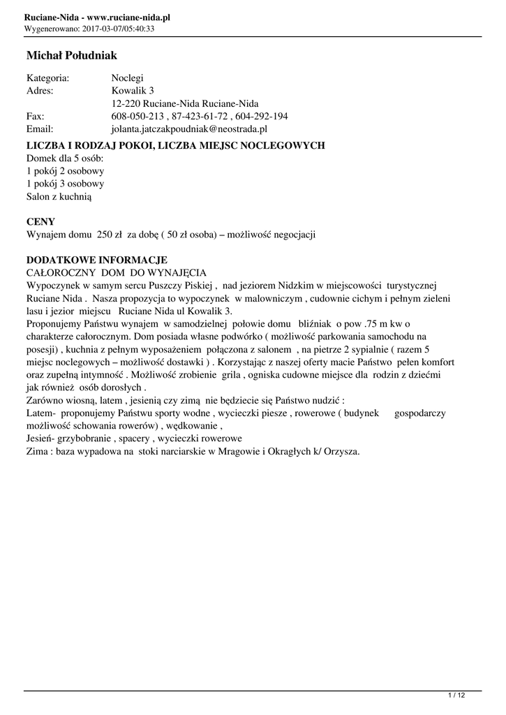 Ruciane-Nida - www.ruciane-nida.pl Wygenerowano: 2017-03-07/05:40:33 Michał Południak Kategoria: Adres: Fax: Email: Noclegi Kowalik 3 12-220 Ruciane-Nida Ruciane-Nida 608-050-213 , 87-423-61-72 , 604-292-194 [email protected] LICZBA I RODZAJ POKOI, LICZBA MIEJSC NOCLEGOWYCH Domek dla 5 osób: 1 pokój 2 osobowy 1 pokój 3 osobowy Salon z kuchnią CENY Wynajem domu 250 zł za dobę ( 50 zł osoba) – możliwość negocjacji DODATKOWE INFORMACJE CAŁOROCZNY DOM DO WYNAJĘCIA Wypoczynek w samym sercu Puszczy Piskiej , nad jeziorem Nidzkim w miejscowości turystycznej Ruciane Nida . Nasza propozycja to wypoczynek w malowniczym , cudownie cichym i pełnym zieleni lasu i jezior miejscu Ruciane Nida ul Kowalik 3. Proponujemy Państwu wynajem w samodzielnej połowie domu bliźniak o pow .75 m kw o charakterze całorocznym. Dom posiada własne podwórko ( możliwość parkowania samochodu na posesji) , kuchnia z pełnym wyposażeniem połączona z salonem , na pietrze 2 sypialnie ( razem 5 miejsc noclegowych – możliwość dostawki ) . Korzystając z naszej oferty macie Państwo pełen komfort oraz zupełną intymność . Możliwość zrobienie grila , ogniska cudowne miejsce dla rodzin z dziećmi jak również osób dorosłych . Zarówno wiosną, latem , jesienią czy zimą nie będziecie się Państwo nudzić : Latem- proponujemy Państwu sporty wodne , wycieczki piesze , rowerowe ( budynek gospodarczy możliwość schowania rowerów) , wędkowanie , Jesień- grzybobranie , spacery , wycieczki rowerowe Zima : baza wypadowa na stoki narciarskie w Mragowie i Okragłych k/ Orzysza. 1 / 12 Ruciane-Nida - www.ruciane-nida.pl Wygenerowano: 2017-03-07/05:40:33 2 / 12 Ruciane-Nida - www.ruciane-nida.pl Wygenerowano: 2017-03-07/05:40:33 3 / 12 Ruciane-Nida - www.ruciane-nida.pl Wygenerowano: 2017-03-07/05:40:33 4 / 12 Ruciane-Nida - www.ruciane-nida.pl Wygenerowano: 2017-03-07/05:40:33 5 / 12 Ruciane-Nida - www.ruciane-nida.pl Wygenerowano: 2017-03-07/05:40:33 6 / 12 Ruciane-Nida - www.ruciane-nida.pl Wygenerowano: 2017-03-07/05:40:33 7 / 12 Ruciane-Nida - www.ruciane-nida.pl Wygenerowano: 2017-03-07/05:40:33 8 / 12 Ruciane-Nida - www.ruciane-nida.pl Wygenerowano: 2017-03-07/05:40:33 9 / 12 Ruciane-Nida - www.ruciane-nida.pl Wygenerowano: 2017-03-07/05:40:33 10 / 12 Ruciane-Nida - www.ruciane-nida.pl Wygenerowano: 2017-03-07/05:40:33 11 / 12 Ruciane-Nida - www.ruciane-nida.pl Wygenerowano: 2017-03-07/05:40:33 12 / 12 Powered by TCPDF (www.tcpdf.org)