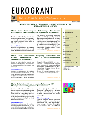EUROGRANT DZIAŁ PROGRAMÓW BADAWCZYCH SEKCJA DS. PROGRAMÓW MIĘDZYNARODOWYCH 2010, 1 (19) 01.04.2010 NOWE KONKURSY W PROGRAMIE „LUDZIE” (PEOPLE) W 7.PR ZAPRASZAMY DO LEKTURY Marie Curie Intra-European Fellowships for Career Development (IEF) - Europejskie Stypendium Wyjazdowe Grant na indywidualny projekt badawczo-szkoleniowy realizowany w instytucji kraju członkowskiego UE lub stowarzyszonego, przez okres od 12 do 24 miesięcy. Adresaci konkursu Konkurs jest skierowany do naukowców ze stopniem doktora lub co najmniej 4-letnim stażem pracy badaw- czej (liczonym od momentu uzyskania tytułu magistra), przebywających w krajach członkowskich Unii Europejskiej lub stowarzyszonych (niezależnie od posiadanego obywatelstwa), zamierzających podjąć pracę w innym kraju członkowskim UE lub stowarzyszonym, lub w jednej z tzw. International European Interest Organisations (np. CERN). (Ciąg dalszy na stronie 2) Marie Curie International Outgoing Fellowships for Career Development (IOF) - Międzynarodowe Stypendium Wyjazdowe Grant na indywidualny projekt badawczo-szkoleniowy realizowany w pozaeuropejskich instytucjach badawczych. Adresaci konkursu Konkurs jest skierowany do naukowców ze stopniem doktora lub co najmniej 4-letnim stażem pracy badawczej (liczonym od momentu uzyskania tytułu magistra), z kraju członkow- skiego Unii Europjskiej lub stowarzyszonego, zamierzających podjąć pracę w uznanych, pozaeuropejskich instytucjach badawczych lub tzw. International European Interest Organisations (np. CERN). Grantu nie można realizować w kraju, w którym naukowiec przebywał (Ciąg dalszy na stronie 2) Marie Curie International Incoming Fellowship (IIF) Międzynarodowe Stypendium Przyjazdowe Jest to możliwość zatrudnienia doświadczonego pracownika naukowego pracującego w kraju trzecim, na okres od 1 do 2 lat, celem realizacji wspólnego przedsięwzięcia badawczego (bazującego na transferze nowej wiedzy/technologii z kraju trzeciego do Europy). Adresaci konkursu Konkurs jest skierowany do naukowców ze stopniem doktora lub co najmniej 4-letnim stażem pracy badawczej (liczonym od momentu uzyskania tytułu magistra), niezależnie od posiadanego obywatelstwa. Warunkiem jest mobilność z kraju trzeciego do kraju członkowskiego lub stowarzyszonego. Zakres tematyczny Projekty dotyczyć mogą wszystkich dziedzin wiedzy - ważne by były interesujące dla Unii Europejskiej. Dużą uwagę Komisja Europejska przywiązuje do projektów (Ciąg dalszy na stronie 4) W tym numerze: IEF - EUROPEJSKIE 1 STYPENDIUM WYJAZDOWE IOF - 1 MIĘDZYNARODOWE STYPENDIUM WYJAZDOWE IIF - 1 MIĘDZYNARODOWE STYPENDIUM PRZYJAZDOWE KONKURSY MARIE CURIE - 5 FINANSOWANIE NOWOŚCI W 7. PR 8 OGŁOSZENIA DZIAŁU 10 PROGRAMÓW BADAWCZYCH EUROGRANT Marie Curie Intra-European Fellowship for Career Development (IEF) - Europejskie Stypendium Wyjazdowe (Ciąg dalszy ze strony 1) Grantu nie można realizować w kraju, w którym naukowiec przebywał dłużej niż 12 miesięcy w ciągu ostatnich 3 lat (stan na dzień zamknięcia konkursu). Zakres tematyczny Projekty dotyczyć mogą wszystkich dziedzin wiedzy - ważne by były interesujące dla UE; wysoko cenione są projekty interdyscyplinarne oraz międzysektorowe. Co jest finansowane? Instytucja biorąca udział w projekcie otrzymuje fundusze na pokrycie kosztów związanych z przyjazdem i zatrudnieniem naukowca (w tym wynagrodzenie), jego szkoleniem, prowadzonymi pracami badawczymi, zarządzaniem projektem oraz koszty pośrednie. GRANT NA INDYWIDUALNY PROJEKT BADAWCZO SZKOLENIOWY REALIZOWANY W UE Składanie wniosku jest proste! (1) Na stronie serwisu CORDIS znajduje się zaproszenie do składania wniosków. Pod każdym zaproszeniem dostępne są wszystkie informacje i dokumenty niezbędne do przygotowania projektu: informacja o konkursie (Call Fiche), program pracy (Work Programme) i przewodnik dla wnioskodawców (Guide for Applicants). (2) Wniosek przygotowuje zainteresowany naukowiec w porozumieniu z wybraną przez siebie zagraniczną instytucją przyjmującą. (3) Wniosek przesyła się on-line (ściśle przestrzegany jest termin przyjmowania wniosków) do Komisji Europejskiej poprzez internetowy system EPSS (Electronic Proposal Submission Service), dostępny ze strony danego konkursu. (4) Projekty wysyłane do KE podlegają ocenie merytorycznej dokonywanej przez grono międzynarodowych ekspertów wybieranych i zapraszanych przez KE. (5) Informacja o wstępnych rezultatach ewaluacji nadesłanych projektów podawana jest na stronie danego konkursu. (6) W przypadku zaakceptowanego projektu KE wysyła informacje, dokumenty potrzebne do przygotowania umowy grantowej oraz samą umowę do osoby odpowiedzialnej za realizację projektu z ramienia instytucji przyjmującej danego naukowca. Informacja o zaakceptowaniu danego projektu jest przesyłana także do zainteresowanego naukowca. (7) KE prowadzi negocjacje tylko z instytucją przyjmującą i z nią podpisuje umowę o grant. Instytucja jest zobowiązana do podpisania umowy z przyjeżdżającym naukowcem zgodnie z wymogami zawartymi w umowie o grant z KE i obowiązującym w danym kraju prawem. Terminy składania wniosków 17 sierpnia 2010 Szczegółowe informacje dotyczące konkursu (FP7-PEOPLE-2010-IEF), czyli najważniejsze dokumenty (Call Fiche, Work Programme, Guide for Applicants) są dostępne na stronie serwisu CORDIS Zakładka „Find a call” Marie Curie International Outgoing Fellowships for Career Development (IOF) Międzynarodowe Stypendium Wyjazdowe (Ciąg dalszy ze strony 1) dłużej niż 12 miesięcy w ciągu ostatnich 3 lat (stan na dzień zamknięcia konkursu). Zakres tematyczny Projekty dotyczyć mogą wszystkich dziedzin wiedzy - ważne by były interesujące dla UE; wysoko cenione są projekty interdyscyplinarne oraz międzysektorowe. Jak to działa? Projekt trwa 2-3 lata i realizowany jest w dwóch etapach. Etap pierwszy (wyjazdowy) trwa od 12 do 24 miesięcy i obejmuje prowadzenie badań w inst