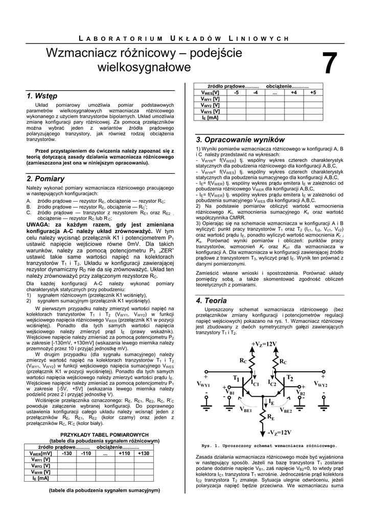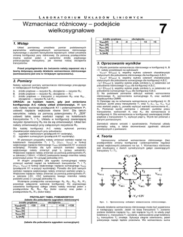 L A B O R A T O R I U M U L K Ł A D Ó W I N I O W Y C H Wzmacniacz różnicowy – podejście wielkosygnałowe 1. Wstęp Układ pomiarowy umożliwia pomiar podstawowych parametrów wielkosygnałowych wzmacniacza różnicowego wykonanego z użyciem tranzystorów bipolarnych. Układ umożliwia zmianę konfiguracji pary różnicowej. Za pomocą przełączników można wybrać jeden z wariantów źródła prądowego polaryzującego tranzystory, jak również rodzaj obciążenia tranzystorów. Przed przystąpieniem do ćwiczenia należy zapoznać się z teorią dotyczącą zasady działania wzmacniacza różnicowego (zamieszczona jest ona w niniejszym opracowaniu). 2. Pomiary Należy wykonać pomiary wzmacniacza różnicowego pracującego w następujących konfiguracjach: A. B. C. źródło prądowe — rezystor RE, obciążenie — rezystor RC; źródło prądowe — rezystor RE, obciążenie — RC’; źródło prądowe — tranzystor z rezystorem RE1 oraz RE2 obciążenie — rezystor RC lub R’C; , UWAGA: za każdym razem, gdy jest zmieniana konfiguracja A-C należy układ zrównoważyć. W tym celu należy wycisnąć przełącznik K1 i potencjometrem P1 ustawić napięcie wejściowe równe 0mV. Dla takich warunków, należy za pomocą potencjometru P3 „ZER” ustawić takie same wartości napięć na kolektorach tranzystorów T1 i T2. Układu w konfiguracji zawierającej rezystor dynamiczny RD nie da się zrównoważyć. Układ ten należy zrównoważyć przy załączonym rezystorze RC. Dla każdej konfiguracji A-C należy wykonać charakterystyk statycznych przy pobudzeniu: 1) sygnałem różnicowym (przełącznik K1 wciśnięty), 2) sygnałem sumacyjnym (przełącznik K1 wyciśnięty). pomiary W pierwszym przypadku należy zmierzyć wartości napięć na kolektorach tranzystorów T1 i T2 (VWY1, VWY2) w funkcji wejściowego napięcia różnicowego VWER (przełącznik K1 w pozycji wciśniętej). Ponadto dla tych samych wartości napięcia wejściowego należy zmierzyć prąd IE (prawy wskaźnik). Wejściowe napięcie należy zmieniać za pomocą potencjometru P2 w zakresie [-130mV, +130mV] (wskazania lewego miernika należy przemnożyć przez 10 i przyjąć jednostkę mV). W drugim przypadku (dla sygnału sumacyjnego) należy zmierzyć wartość napięć na kolektorach tranzystorów T1 i T2 (VWY1, VWY2) w funkcji wejściowego napięcia sumacyjnego VWES (przełącznik K1 w pozycji wyciśniętej). Ponadto dla tych samych wartości napięcia wejściowego należy zmierzyć wartości prądu IE. Wejściowe napięcie należy zmieniać za pomocą potencjometru P1 w zakresie [-5V, +5V] (wskazania lewego miernika należy podzielić przez 2 i przyjąć jednostkę V). Wciśnięcie przełącznika oznaczonego: RE, RE1, RE2, RC, R’C powoduje załączenie wybranej konfiguracji. Do poprawnego ustawienia konfiguracji całego układu należy wcisnąć jeden z przełączników RE, RE1, RE2 (kolor czarny) oraz jeden z przełączników RC, R’C (kolor biały). PRZYKŁADY TABEL POMIAROWYCH (tabele dla pobudzenia sygnałem róźnicowym) źródło prądowe.......... obciążenie............ VWER[mV] -130 -110 ... +110 +130 VWY1 [V] VWY2 [V] VWYR [V] IE [mA] (tabele dla pobudzenia sygnałem sumacyjnym) 7 źródło prądowe.......... VWES[V] -5 -4 VWY1 [V] VWY2 [V] VWYS [V] IE [mA] obciążenie............ ... +4 +5 3. Opracowanie wyników 1) Wyniki pomiarów wzmacniacza różnicowego w konfiguracji A, B i C należy przedstawić na wykresach: - VWYR= f(VWER) tj. wspólny wykres czterech charakterystyk statycznych dla pobudzenia różnicowego dla konfiguracji A,B,C, - VWYR= f(VWES) tj. wspólny wykres czterech charakterystyk statycznych dla pobudzenia sumacyjnego dla konfiguracji A,B,C, - IE= f(VWER) tj. wspólny wykres prądu emitera IE w zależności od pobudzenia różnicowego VWER dla konfiguracji A,B,C, - IE= f(VWER) tj. wspólny wykres prądu emitera IE w zależności od pobudzenia sumacyjnego VWES dla konfiguracji A,B,C. 2) Na podstawie pomiarów obliczyć wartość wzmocnienia różnicowego Kr, wzmocnienia sumacyjnego Ks oraz wartość współczynnika CMRR. 3) Opierając się na schemacie wzmacniacza w konfiguracji A i B wyliczyć: punkt pracy tranzystorów T1 oraz T2 (Ic1, Ic2, Vc1, Vc2) oraz wartość prądu IE, ponadto wyliczyć wartość wzmocnienia Kr. i Ks. Porównać wyniki pomiarów i obliczeń: punktów pracy tranzystorów, wzmocnień Kr oraz Ks1 dla wzmacniacza w konfiguracji A. Dla wzmacniacza w konfiguracji zawierającej źródło prądowe z tranzystorem T3, wyliczyć prąd IE. Wynik ten prównać z danymi pomierzonymi. Zamieścić własne wnioski i spostrzeżenia. Porównać układy pomiędzy sobą, a także skomentować zgodność obliczeń teoretycznych z pomiarami. 4. Teoria Uproszczony schemat wzmacniacza różnicowego (bez przełączników zmiany konfiguracji i potencjometrów regulacji napięć wejściowych) pokazano na rys. 1. Wzmacniacz różnicowy jest zbudowany z dwóch symetrycznych gałęzi zawierających tranzystory T1 i T2. +VZ =12V RC + VWY1 - T1 + VB1 - RC IC1 IC2 T2 + VB2 - IE VBE1 + VWY2 - VBE2 RE -VZ=12V Rys. 1. Uproszczony schemat wzmacniacza różnicowego. Zasada działania wzmacniacza różnicowego może być wyjaśniona w następujący sposób. Jeżeli na bazę tranzystora T1 zostanie podane dodatnie napięcie VB1, zaś napięcie VB2=0, to wtedy prąd kolektora IC1 tranzystora T1 wzrośnie. Jednocześnie prąd kolektora IC2 tranzystora T2 zmaleje. Sytuacja ulegnie odwróceniu, jeżeli polaryzacja napięć będzie przeciwna. We wzmacniaczu suma 1A-2 prądów emiterów tranzystorów jest równa prądowi IE, który płynie przez rezystor RE, a zatem: I E1 + I E 2 = I E IC IE 1 (1) Jeżeli wartość rezystancji RE jest dostatecznie duża, to wartość prądu jest niezależna od wysterowania tranzystorów T1 i T2. Znacznie korzystniejsze pod tym względem jest stosowanie źródła prądowego zamiast rezystora RE. Korzystając z napięciowego prawa Kirchoffa można uł