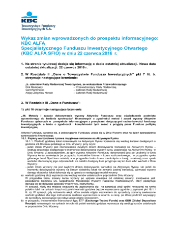 Wykaz zmian wprowadzonych do prospektu informacyjnego: KBC ALFA Specjalistycznego Funduszu Inwestycyjnego Otwartego (KBC ALFA SFIO) w dniu 22 czerwca 2016 r. 1. Na stronie tytułowej dodaje się informację o dacie ostatniej aktualizacji. Nowa data ostatniej aktualizacji: 22 czerwca 2016 r. 2. W Rozdziale II „Dane o Towarzystwie Funduszy Inwestycyjnych” pkt 7 lit. b. otrzymuje następujące brzmienie: „b. członków Rady Nadzorczej Towarzystwa, ze wskazaniem Przewodniczącego Dirk Mampaey – Przewodniczący Rady Nadzorczej, Gert Rammeloo – Członek Rady Nadzorczej, Alojzy Zbigniew Nowak – Członek Rady Nadzorczej.” 3. W Rozdziale III „Dane o Funduszu”: 1) pkt 16 otrzymuje następujące brzmienie: „16. Metody i zasady dokonywania wyceny Aktywów Funduszu oraz oświadczenie podmiotu uprawnionego do badania sprawozdań finansowych o zgodności metod i zasad wyceny Aktywów Funduszu opisanych w prospekcie informacyjnym z przepisami dotyczącymi rachunkowości funduszy inwestycyjnych, a także o zgodności i kompletności tych zasad z przyjętą przez Fundusz polityką inwestycyjną Aktywa Funduszu wycenia się, a zobowiązania Funduszu ustala się w Dniu Wyceny oraz na dzień sporządzenia sprawozdania finansowego. 16.1. Papiery wartościowe i prawa majątkowe notowane na Aktywnym Rynku 16.1.1. Wartość godziwą lokat notowanych na Aktywnym Rynku wyznacza się według kursów dostępnych o godzinie 23.30 czasu polskiego w Dniu Wyceny, przy czym: jeżeli Dzień Wyceny jest równocześnie zwykłym dniem dokonywania transakcji na Aktywnym Rynku – według ostatniego dostępnego w momencie dokonywania wyceny kursu ustalonego na Aktywnym Rynku w Dniu Wyceny, z zastrzeżeniem, że gdy wycena Aktywów Funduszu dokonywana jest po ustaleniu w Dniu Wyceny kursu zamknięcia (w przypadku kontraktów futures – kursu rozliczeniowego, w przypadku rynku głównego bond Spot kurs ostatni), a w przypadku braku kursu zamknięcia – innej, ustalonej przez rynek wartości stanowiącej jego odpowiednik, za ostatni dostępny kurs przyjmuje się ten kurs albo wartość z Dnia Wyceny; jeżeli Dzień Wyceny nie jest zwykłym dniem dokonywania transakcji na Aktywnym Rynku, lub jeżeli do momentu dokonywania wyceny na danym składniku lokat nie zawarto żadnej transakcji, wówczas wyceny danego składnika lokat dokonuje się w oparciu o następujący model wyceny: a) wartość godziwą akcji wyznacza się według kursów ustalonych w poprzednim Dniu Wyceny. W przypadku braku zmiany kursu wyceny po upływie miesiąca od ostatniej zmiany, zwoływane jest posiedzenie Komitetu Ds. Uzgadniania Metodologii Wyceny Papierów Wartościowych, który podejmuje decyzję co do dalszego sposobu wyceny ww. instrumentu. W sytuacji, kiedy ma miejsce wezwanie do zapisywania się na sprzedaż akcji spółki notowanej na rynku polskim lub/i na rynkach innych niż polski wartość godziwa będzie wyznaczana zgodnie z zapisami pkt 16.1.1 lit. a). W sytuacji, gdy notowania akcji, która została objęta wezwaniem do sprzedaży zostaną zawieszone wartość godziwa dla tego instrumentu zostanie wyznaczona w oparciu o cenę, po której podmiot wzywający do sprzedaży zobowiązuje się nabyć akcje objęte wezwaniem. b) w przypadku instrumentów finansowych typu ETF (Exchange-Traded Funds) oraz GDR (Global Depository Receipt) notowanych na rynkach innych niż polski wartość godziwą wyznacza się według kursów ustalonych w poprzednim Dniu Wyceny. W przypadku braku zmiany kursu wyceny po upływie miesiąca od ostatniej zmiany, zwoływane jest posiedzenie Komitetu Ds. Uzgadniania Metodologii Wyceny Papierów Wartościowych, który podejmuje decyzję co do dalszego sposobu wyceny ww. instrumentu. c) w przypadku warrantów subskrypcyjnych – na podstawie wartości instrumentu bazowego skorygowanej o ewentualne różnice w przysługujących prawach majątkowych, d) w przypadku praw poboru notowanych na rynkach w Polsce i za granicą: - jeżeli od momentu dopuszczenia do obrotu nie została zawarta żadna transakcja na aktywnym rynku, wg wartości wyznaczonej poprzez zastosowanie modelu wyceny wartości teoretycznej prawa poboru dla którego dane wejściowe pochodzą z Aktywnego Rynku Vc = (Pc - Pe) / K i Vc >0 Pe - cena akcji nowej emisji Vc - wartość bieżąca praw poboru Pc - cena bieżąca akcji na Aktywnym Rynku K - liczba praw poboru potrzebna do zakupu 1 akcji nowej emisji W przypadku braku ceny akcji nowej emisji, aż do jej ogłoszenia wartość teoretyczna praw poboru wynosi 0. - jeżeli prawo poboru było wcześniej notowane – to wartość godziwą wyznacza się według kursów ustalonych w poprzednim Dniu Wyceny. W przypadku braku zmiany kursu wyceny po upływie miesiąca od ostatniej zmiany, zwoływane jest posiedzenie Komitetu Ds. Uzgadniania Metodologii Wyceny Papierów Wartościowych, który podejmuje decyzję co do dalszego sposobu wyceny ww. instrumentu. e) w przypadku praw do akcji: - jeżeli od momentu dopuszczenia do obrotu nie została zawarta żadna transakcja na aktywnym rynku: - w przypadku gdy instrument bazowy jest notowany na Aktywnym Rynku – w cenie instrumentu bazowego - w pozostałych przypadkach – cenę emisyjną lub cenę zakupu; - jeżeli prawo do akcji było wcześniej notowane – to wartość godziwą wyznacza się według kursów ustalonych w poprzednim Dniu Wyceny. W przypadku braku zmiany kursu wyceny po upływie miesiąca od ostatniej zmiany, zwoływane jest posiedzenie Komitetu Ds. Uzgadniania Metodologii Wyceny Papierów Wartościowych, który podejmuje decyzję co do dalszego sposobu wyceny ww. instrumentu. f) w przypadku dłużnych papierów wartościowych innych niż polskie obligacje skarbowe, listy zastawne według kursów ustalonych w poprzednim Dniu Wyceny. W przypadku gdy sytuacja braku kursu trwa do najbliższego badania rynku i zgodnie z zasadami nastąpi konieczność przejścia na wycenę wg efektywnej stopy procentowej, wówczas za kurs wyjściowy przyjmujem