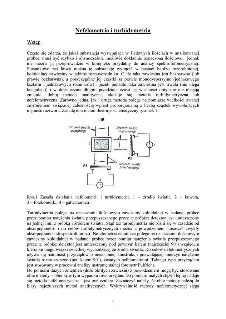 Nefelometria i turbidymetria Wstęp Często się zdarza, Ŝe jakaś substancja występująca w śladowych ilościach w analizowanej próbce, musi być szybko i równocześnie moŜliwie dokładnie oznaczona ilościowo, jednak nie moŜna ją przeprowadzić w kompleks przydatny do analizy spektrofotometrycznej. Stosunkowo zaś łatwo moŜna tę substancję wytrącić w postaci bardzo rozdrobnionej, koloidalnej zawiesiny w jakimś rozpuszczalniku. O ile taka zawiesina jest bezbarwna (lub prawie bezbarwna), a poszczególne jej cząstki są prawie monodyspersyjne (jednakowego kształtu i jednakowych rozmiarów) i jeŜeli ponadto taka zawiesina jest trwała (nie ulega koagulacji) i w dostatecznie długim przedziale czasu jej własności optyczne nie ulegają zmianie, dobrą metoda analityczną okazuje się metoda turbidymetryczna lub nefelometryczna. Zarówno jedna, jak i druga metoda polega na pomiarze wielkości zwanej zmętnieniem związanej zaleŜnością wprost proporcjonalną z liczbą cząstek wywołujących mętność roztworu. Zasadę obu metod ilustruje schematyczny rysunek 1. Rys.1 Zasada działania nefelometrii i turbidymetrii. 1 – źródło światła, 2 – kuweta, 3 – fotokomórki, 4 – galwanometr. Turbidymetria polega na oznaczaniu ilościowym zawiesiny koloidalnej w badanej próbce przez pomiar natęŜenia światła przepuszczanego przez tę próbkę; detektor jest umieszczony na jednej linii z próbką i źródłem światła. Stąd teŜ turbidymetria nie róŜni się w zasadzie od absorpcjometrii i do celów turbidymetrycznych moŜna z powodzeniem stosować zwykły absorpcjometr lub spektrofotometr. Nefelometria natomiast polega na oznaczaniu ilościowym zawiesiny koloidalnej w badanej próbce przez pomiar natęŜenia światła przepuszczanego przez tę próbkę; detektor jest umieszczony pod pewnym kątem (najczęściej 900) względem kierunku biegu wiązki świetlnej wychodzącej ze źródła światła. Do celów nefelometrycznych uŜywa się natomiast przyrządów o nieco innej konstrukcji pozwalającej mierzyć natęŜenie światła rozproszonego (pod kątem 900), zwanych nefelometrami. Takiego typu przyrządem jest stosowany w pracowni analizy instrumentalnej fotometr Pulfricha. Do pomiaru duŜych zmętnień (dość obfitych zawiesin) z powodzeniem mogą być stosowane obie metody – obie są w tym wypadku równorzędne. Do pomiaru małych stęŜeń lepiej nadaje się metoda nefelometryczna – jest ona czulsza. Zaznaczyć naleŜy, Ŝe obie metody naleŜą do klasy najczulszych metod analitycznych. Wykrywalność metody nefelometycznej sięga 1 niekiedy 1/300 ppm (1:300000000), jak w przypadku oznaczania fosforu wytrąconego odczynnikiem strychninomolibdenianowym: w przypadku oznaczania amoniaku za pomocą odczynnika Nesslera wykrywalność sięga 1/160 ppm. ppm (part per milion) – jednostka stęŜenia uŜywana w przypadku roztworów bardzo rozcieńczonych, oznaczająca jedną część wagową substancji rozpuszczonej przypadającą na 1000000 części wagowych roztworu. Stąd teŜ metoda nefelometryczna lub turbidymetryczna bywa z powodzeniem stosowana do takich standardowych analiz, jak oznaczenie siarki i siarczanów w postaci siarczanu barowego, halogenków w postaci halogenków srebra, ołowiu w postaci siarczanu ołowiu itp. Ponadto stosuje się ją do oznaczania zanieczyszczeń zawartych w powietrzu (dymy, aerozole), gazów bojowych, niektórych bakterii, do oznaczania fazy rozproszonej w emulsjach koloidalnych (np. w mleku), do określenia efektywności procesu filtracyjnego, do oznaczania tłuszczów i smarów, do róŜnych analiz biochemicznych (moczu, krwi i innych płynów fizjologicznych), do oznaczania białka i in. Aby zapewnić dobrą powtarzalność pomiarów, a tym samych duŜą ich dokładność, opracowano szczegółowo przepisy analityczne precyzujące stęŜenia odczynników, ilości jakie mają być uŜyte do oznaczania, szybkość, sposób i czas wytrącania osadu czy mieszania oraz okres jaki powinien upłynąć od momentu wytrącenia osadu do chwili pomiaru zmętnienia. Ponadto istotnym czynnikiem jest temperatura oraz ilości dodatkowych odczynników zwiększających stopień rozdrobnienia i trwałość zawiesiny, takich jak koloidy ochronne np. Ŝelatyna lub teŜ jonowe substancje peptyzujące. Wymienione odczynniki zapewniają otrzymanie zawiesin o odpowiedniej i jednolitej w całej masie wielkości ziarna cząstek rozpraszających światło. Matematyczne podstawy nefelometrii i turbidymetrii Podstawową wielkością, której pomiar prowadzi do ilościowego oznaczania substancji tworzącej zawiesinę koloidalną, jest tzw. Zmętnienie. Jednoznaczne zdefiniowanie tej wielkości jest sprawą kłopotliwą, w literaturze poświęconej temu zagadnieniu istnieje pewna rozbieŜność nomenklaturowa. NiezaleŜnie jednak od sposobu, w jaki ta wielkość jest zdefiniowana, jest ona ściśle powiązana (bezpośrednio lub pośrednio) z rozproszenoem światła R=Ir/I0, czyli wielkością, którą zaniedbywaliśmy w pomiarach spektrofotometrycznych jako znikomo małą, a która tutaj gra rolę dominującą. W wyraŜeniu definiującym rozproszenie (I0 = Ia + Ir + It) Ir - jest natęŜeniem światła rozproszonego, I0 - natęŜeniem światła padającego na próbkę, Ia – to zaadsorbowana część światła. W przypadku układów z zawiesiną Ir przybiera znaczne wartości kosztem Ir i Ia, która jest tutaj nieznaczna. Zatem równanie powyŜsze moŜna napisać w formie przybliŜonej, przydatnej do celów turbidymetrycznych i nefelometrycznych: I r It + =1 (1) I0 I0 Jak widać z powyŜszego równania, jest rzeczą obojętna, czy będziemy mierzyć jak w turbidymetrii wielkość It, czy teŜ jak w nefelometrii wielkość Ir. Pomiar zarówno jednego jak i drugiego natęŜenia oddaje wielkość rozproszenia światła. Zmętnieninatomiast musi być tak zdefiniowane, aby jego związek z oznaczanym turbidymetrycznie czy nefelometrycznie stęŜeniem był mo