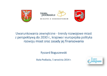 Uwarunkowania zewnętrzne - trendy rozwojowe miast z perspektywą do 2030 r., krajowa i europejska polityka rozwoju miast oraz zasady jej finansowania Ryszard Boguszewski Biała Podlaska, 5 września 2014 r. Najważniejsze kwestie do omówienia … Polityka miejska na poziomie unijnym i krajowym Rozwój miast i obszarów funkcjonalnych w polityce regionalnej woj. lubelskiego Zasady i źródła finansowania rozwoju obszarów miejskich do roku 2020 Główne czynniki mające wpływ na pozycję konkurencyjną miejskiego obszaru funkcjonalnego Biała Podlaska Polityka miejska na poziomie unijnym Zaczęła być obecna po roku 2007 (tj. po przyjęciu tzw. Karty Lipskiej nt. Zrównoważonych Miast Europejskich oraz opublikowaniu Komunikatu KE pt. „Miejski wymiar polityki UE – kluczowe elementy agendy miejskiej UE „) Realizowana w latach 20072007-2013 głównie przez pryzmat rewitalizacji miejskich naukowo--badawcze przestrzeni (m.in. poprzez instrument finansowy JESSICA), prace naukowo (w ramach programu ESPON) oraz współpracę miast (np. w ramach programu URBACT II) Mocno wpisana w perspektywę finansową 20142014-2020 , m. in. poprzez wymiar terytorialny polityki spójności oraz zasadę zintegrowanego podejścia do rozwoju miast (w ramach tzw. Zintegrowanych Inwestycji Terytorialnych) Wzmocnione instrumentarium wdrażania polityki, m.in. poprzez szerszy zakres instrumentów finansowych (EBI, JESSICA) oraz współpracę sieciową miast (program URBACT, programy EWT) Polityka miejska na poziomie unijnym Raport Miasta przyszłości… jest efektem analiz i refleksji ponad 50 ekspertów naukowych i urbanistów nt. wyzwań, wizji i perspektyw rozwoju miast do roku 2020. Sformułowano ponad 20 wyzwań w takich obszarach jak: różnorodność vs spójność miasta; ekologia i zrównoważony rozwój; silna gospodarka lokalna; rządzenie vs zarządzanie Zarysowano możliwe modele rozwoju miast, w tym również małych z liczbą mieszkańców pomiędzy 50 – 100 tys. mieszkańców Polityka miejska na poziomie krajowym Poważnie potraktowana w Krajowej Strategii Rozwoju Regionalnego 20102010-2020: Regiony, Miasta, Obszary Wiejskie , przyjęto założenie że konkurencyjność regionów będzie wzmacniana w ramach modelu polaryzacyjnopolaryzacyjno-dyfuzyjnego (z udziałem miast wojewódzkich oraz ośrodków subsub-regionalnych i regionalnych); Uruchomiono prace nad Krajową Polityką Miejską (ostatni projekt z marca 2014 r.) Opracowano również wstępne założenia Narodowego Planu Rewitalizacji (NPR), które będą podstawą do opracowywania i finansowania miejskich planów/projektów rewitalizacyjnych Przygotowano wytyczne na temat realizacji projektów w ramach ZIT Główne wątki tematyczne w Krajowej Polityce Miejskiej (KPM) NPR będzie opierał się na 4 modułach Każda z gmin będzie musiała mieć opracowany program rewitalizacji !! Polityka miejska na poziomie regionalnym W Strategii Rozwoju Województwa Lubelskiego na lata 20142014-2020 zostały wskazane obszary funkcjonalne miast subsubregionalnych (w tym również obszaru Białej Podlaskiej) Podlaskiej) Rozwojowi miast dedykowany jest pierwszy cel strategiczny (Wzmocnienie urbanizacji regionu), w tym w całości Cel operacyjny 1.2. (Wspieranie ponadlokalnych funkcji miast) Zapewniono środki finansowania rozwoju funkcji miast w regionie w ramach RPO WL, w tym dla Lublina w ramach ZIT oraz miast subregionalnych w ramach SIT. Perspektywa finansowa 20142014-2020 Polityka spójności Polityka rolna i rozwój obszarów wiejskich I Filar polityki rolnej II Filar polityki rolnej Polityka rybacka Dopłaty obszarowe PROW 2014-2020 PO Ryby i Morze 21,1 mld euro 13,5 mld euro 0,53 mld euro Polityka spójności Programy krajowe Programy regionalne RPO WL 20142014-2020 – główne źródło finansowania rozwoju obszarów funkcjonalnych do roku 2020 Nazwa osi priorytetowej 1. Badania i innowacje 2. Cyfrowe lubelskie 3. Konkurencyjność przedsiębiorstw 4. Energia przyjazna środowisku 5. Efektywność energetyczna i gospodarka niskoemisyjna 6. Ochrona środowiska oraz efektywne wykorzystanie zasobów 7. Ochrona dziedzictwa kulturowego i naturalnego 8.Mobilność regionalna i ekologiczny transport 9. Rynek pracy 10. Adaptacyjność przedsiębiorstw i pracowników do zmian 11. Włączenie społeczne 12. Edukacja, umiejętności i kompetencje 13. Infrastruktura społeczna 14. Pomoc techniczna Łącznie Nazwa funduszu finansującego Wkład unijny w mln euro EFRR EFRR EFRR EFRR EFRR EFRR EFRR EFRR EFS EFS EFS EFS EFRR EFRR 45,4 72,3 291,6 158,8 237,0 170,6 98,7 271,0 202,0 62,1 180,5 107,4 261,8 69,4 2 228,8 Procent w całości alokacji 2,04 3,24 13,08 7,13 10,63 7,66 4,43 12,16 8,97 2,79 8,1 4,82 11,74 3,11 100,0 PROW 20142014-2020 – ważne źródło finansowania rozwoju na obszarach wiejskich Lp. Nazwa działania (art. EFRROW) Transfer wiedzy i działalność informacyjna (art. 14) Usługi doradcze, usługi z zakresu zarządzania 2. gospodarstwem i usługi z zakresu zastępstw (art. 15) Systemy jakości produktów rolnych i 3. środków spożywczych (art. 16) 1. 4. Inwestycje w środki trwałe (art. 17) Nazwa poddziałania Procent w całości alokacji - Szkolenie zawodowe i nabywanie umiejętności Demonstracje i działania informacyjne 27 361 0,33 - Udzielanie pomocy rolnikom lub właścicielom lasów w korzystaniu z usług doradczych Wsparcie szkoleń dla doradców 41 360 0,50 - Wsparcie dla nowych uczestników systemów jakości Wsparcie na przeprowadzenie działań informacyjnych i promocyjnych Modernizacja gospodarstw rolnych Przetwórstwo i marketing produktów rolnych Scalanie gruntów 21 000 0,25 2 321 243 28,18 264 046 3,20 1 236 882 15.00 683 983 8,30 Przywracanie potencjału produkcji rolnej zniszczonego w wyniku klęsk żywiołowych i 5. katastrof oraz wprowadzenie odpowiednich środków zapobiegawczych (art. 18) Rozwój gospodarstw i działalności 6. gospodarczej (art. 19) 7. Wkład unijny (w tys. euro) Podstawowe usługi i odnow
