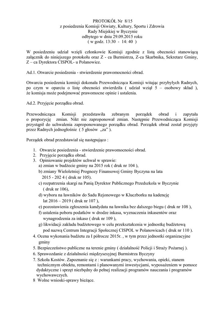 PROTOKÓŁ Nr 8/15 z posiedzenia Komisji Oświaty, Kultury, Sportu i Zdrowia Rady Miejskiej w Byczynie odbytego w dniu 29.09.2015 roku ( w godz. 13:30 - 14: 40 ) W posiedzeniu udział wzięli członkowie Komisji zgodnie z listą obecności stanowiącą załącznik do niniejszego protokołu oraz Z - ca Burmistrza, Z-ca Skarbnika, Sekretarz Gminy, Z – ca Dyrektora CISPOL- u Polanowice. Ad.1. Otwarcie posiedzenia - stwierdzenie prawomocności obrad. Otwarcia posiedzenia komisji dokonała Przewodnicząca Komisji witając przybyłych Radnych, po czym w oparciu o listę obecności stwierdziła ( udział wziął 5 – osobowy skład ), że komisja może podejmować prawomocne opinie i ustalenia. Ad.2. Przyjęcie porządku obrad. Przewodnicząca Komisji przedstawiła zebranym porządek obrad i zapytała o propozycję zmian. Nikt nie zaproponował zmian. Następnie Przewodnicząca Komisji przystąpił do uchwalenia zaproponowanego porządku obrad. Porządek obrad został przyjęty przez Radnych jednogłośnie ( 5 głosów „za” ). Porządek obrad przedstawiał się następująco : 1. Otwarcie posiedzenia - stwierdzenie prawomocności obrad. 2. Przyjęcie porządku obrad. 3. Opiniowanie projektów uchwał w sprawie: a) zmian w budżecie gminy na 2015 rok ( druk nr 104 ), b) zmiany Wieloletniej Prognozy Finansowej Gminy Byczyna na lata 2015 - 202 4 ( druk nr 105). c) rozpatrzenia skargi na Panią Dyrektor Publicznego Przedszkola w Byczynie ( druk nr 106), d) wyboru na ławników do Sadu Rejonowego w Kluczborku na kadencję lat 2016 – 2019 ( druk nr 107 ), e) pozostawienia zgłoszenia kandydata na ławnika bez dalszego biegu ( druk nr 108 ), f) ustalenia poboru podatków w drodze inkasa, wyznaczenia inkasentów oraz wynagrodzenia za inkaso ( druk nr 109 ), g) likwidacji zakładu budżetowego w celu przekształcenia w jednostkę budżetową pod nazwą Centrum Integracji Społecznej CISPOL w Polanowicach ( druk nr 110 ). 4. Ocena wykonania budżetu za I półrocze 2015r. , w tym przez jednostki organizacyjne gminy 5. Bezpieczeństwo publiczne na terenie gminy ( działalność Policji i Straży Pożarnej ). 6. Sprawozdanie z działalności międzysesyjnej Burmistrza Byczyny 7. Szkoła Kostów. Zapoznanie się z : warunkami pracy, wychowania, opieki, stanem technicznym obiektu, remontami i planowanymi inwestycjami, wyposażeniem w pomoce dydaktyczne i sprzęt niezbędny do pełnej realizacji programów nauczania i programów wychowawczych. 8 Wolne wnioski-sprawy bieżące. 9. Zakończenie posiedzenia. Ad.3 Opiniowanie projektów uchwał w sprawie: a) Na wstępie głos zabrała Z-ca Skarbnik Gminy i w sposób szczegółowy i wyczerpujący omówiła planowane zmiany w budżecie gminy na 2015r.(druk nr 104), jak również zmiany w Wieloletniej Prognozy Finansowej Gminy Byczyna na lata 2015 - 2024 ( druk nr 105). Następnie Przewodnicząca Komisji zadała pytanie, czy dokumentacje techniczne na wszelkiego rodzaju planowane roboty muszą być tak drogie. W odpowiedzi Z-ca Burmistrza stwierdziła, że takie są ceny. Z kolei Radny – Michał Półtorak zadał pytanie, czy w myśl przedłożonych dokumentów Mysia Wieża będzie miała większą dotację. Sekretarz Gminy odpowiedział, że tak. Następnie Przewodnicząca Komisji zadała pytanie, skoro tak dużo płacimy za wykonane dok. techniczne, to dlaczego są tak bublowate. Kontynuując wypowiedź Przewodnicząca Komisji zadała pytanie, dlaczego wykonawca dok. technicznej drogi w Pogorzałce nie został jeszcze oddany do sądu. Mianowicie, w powyższym przypadku projektant zaprojektował przydrożny rów na prywatnych gruntach. Podobny przypadek miał miejsce w przypadku budowy kompleksu rekreacyjnego w Nasalach. W powyższym przypadku staw został zaprojektowany również na gruntach prywatnych. Kontynuując wypowiedź Przewodnicząca Komisji stwierdziła, że w przypadku wsi Nasale nie bardzo można wykonać jakiś ruch, ponieważ omawiany projektant zmarł, ale w tym przypadku mamy większe możliwości. Następnie Sekretarz Gminy stwierdził, że w Pogorzałce brakuje zaledwie kilka centymetrów. Z kolei Przewodnicząca Komisji dopowiedziała, że nie kilka, a kilkadziesiąt centymetrów. Projekt uchwały w sprawie zmian w budżecie gminy na 2015 rok ( druk nr 104 ), został jednogłośnie pozytywnie ( 5 głosów „ za ” ) zaopiniowany przez Komisję. b) Projekt uchwały w sprawie zmiany Wieloletniej Prognozy Finansowej Gminy Byczyna na lata 2015 - 2024 ( druk nr 105) , został jednogłośnie pozytywnie ( 5 głosów „ za ” ) zaopiniowany przez Komisję. c) Na wstępie Przewodnicząca Komisji zadała pytanie, dlaczego Pani Dyrektor nie przedłużyła umowy Pani Katarzynie Semeres, a na kolejne dwa lata przyjęła w to miejsce Panią Amelię Kudłę. Powyższa decyzja ma bardzo wymowny gest i nie wymaga zbędnego komentarza. Faktem jest to, że po zwolnieniu Pani Semeres, Pani Kudła pracowała przez okres dwóch lat w omawianym przedszkolu. Z kolei Sekretarz Gminy stwierdził, że każdy dyrektor dobiera sobie ludzi wg. własnego uznania i takie jest prawo w powyższym zakresie. Z kolei Radny – Adam Radom stwierdził, że w świetle wysnutych stwierdzeń przez Radnego – Jerzego Plutę wcześniejsze fakty bardzo się ze sobą kłócą. Następnie Przewodnicząca Komisji zadała pytanie, czy prawda jest, że w danym okresie Pani Dyrektor miała bardzo dużo zastępstw. W odpowiedzi Sekretarz Gminy stwierdził, że umowa z Panią Semeres była zawarta na czas określony i po prostu wygasła. Następnie Radny –Adam Radom zadał pytanie, czy prawdą jest, że Pani Amelia Kudła w większości przebywała na zwolnieniu lekarskim. W odpowiedzi Sekretarz Gminy stwierdził, że powyższy fakty zostaną sprawdzone i na posiedzeniu Rady zostanie udzielona odpowiedź w powyższych kwestiach. Następnie Przewodnicząca Komisji zaproponowała, aby rozstrzygnięcie wszelkich nie wyjaśnionych kwestii przesunąć do kolejnego posiedzenia Rady. By