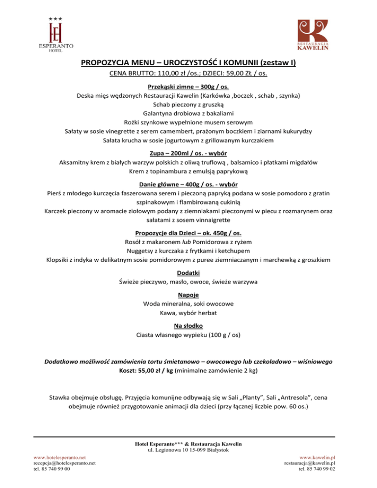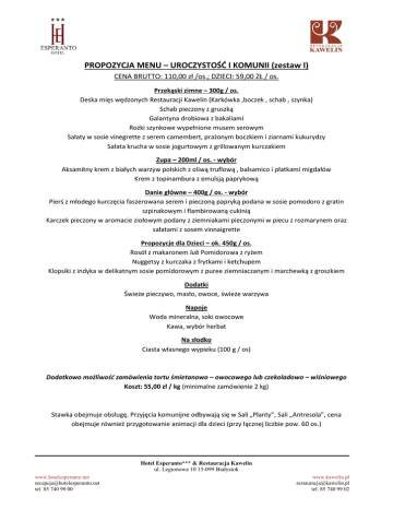 PROPOZYCJA MENU – UROCZYSTOŚĆ I KOMUNII (zestaw I) CENA BRUTTO: 110,00 zł /os.; DZIECI: 59,00 ZŁ / os. Przekąski zimne – 300g / os. Deska mięs wędzonych Restauracji Kawelin (Karkówka ,boczek , schab , szynka) Schab pieczony z gruszką Galantyna drobiowa z bakaliami Rożki szynkowe wypełnione musem serowym Sałaty w sosie vinegrette z serem camembert, prażonym boczkiem i ziarnami kukurydzy Sałata krucha w sosie jogurtowym z grillowanym kurczakiem Zupa – 200ml / os. - wybór Aksamitny krem z białych warzyw polskich z oliwą truflową , balsamico i płatkami migdałów Krem z topinambura z emulsją paprykową Danie główne – 400g / os. - wybór Pierś z młodego kurczęcia faszerowana serem i pieczoną papryką podana w sosie pomodoro z gratin szpinakowym i flambirowaną cukinią Karczek pieczony w aromacie ziołowym podany z ziemniakami pieczonymi w piecu z rozmarynem oraz sałatami z sosem vinnaigrette Propozycje dla Dzieci – ok. 450g / os. Rosół z makaronem lub Pomidorowa z ryżem Nuggetsy z kurczaka z frytkami i ketchupem Klopsiki z indyka w delikatnym sosie pomidorowym z puree ziemniaczanym i marchewką z groszkiem Dodatki Świeże pieczywo, masło, owoce, świeże warzywa Napoje Woda mineralna, soki owocowe Kawa, wybór herbat Na słodko Ciasta własnego wypieku (100 g / os) Dodatkowo możliwość zamówienia tortu śmietanowo – owocowego lub czekoladowo – wiśniowego Koszt: 55,00 zł / kg (minimalne zamówienie 2 kg) Stawka obejmuje obsługę. Przyjęcia komunijne odbywają się w Sali „Planty”, Sali „Antresola”, cena obejmuje również przygotowanie animacji dla dzieci (przy łącznej liczbie pow. 60 os.) Hotel Esperanto*** & Restauracja Kawelin ul. Legionowa 10 15-099 Białystok www.hotelesperanto.net [email protected] tel. 85 740 99 00 www.kawelin.pl [email protected] tel. 85 740 99 02