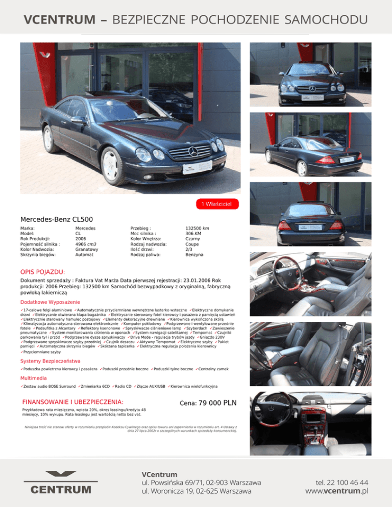 Mercedes-Benz CL500 Marka: Model: Rok Produkcji: Pojemność silnika : Kolor Nadwozia: Skrzynia biegów: Mercedes CL 2006 4966 cm3 Granatowy Automat Przebieg : Moc silnika : Kolor Wnętrza: Rodzaj nadwozia: Ilość drzwi: Rodzaj paliwa: 132500 km 306 KM Czarny Coupe 2/3 Benzyna OPIS POJAZDU: Dokument sprzedaży : Faktura Vat Marża Data pierwszej rejestracji: 23.01.2006 Rok produkcji: 2006 Przebieg: 132500 km Samochód bezwypadkowy z oryginalną, fabryczną powłoką lakierniczą Dodatkowe Wyposażenie ✓17-calowe felgi aluminiowe ✓Automatycznie przyciemniane wewnętrzne lusterko wsteczne ✓Elektryczne domykanie drzwi ✓Elektrycznie otwierana klapa bagażnika ✓Elektrycznie sterowany fotel kierowcy i pasażera z pamięcią ustawień ✓Elektrycznie sterowany hamulec postojowy ✓Elementy dekoracyjne drewniane ✓Kierownica wykończona skórą ✓Klimatyzacja automatyczna sterowana elektronicznie ✓Komputer pokładowy ✓Podgrzewane i wentylowane przednie fotele ✓Podsufitka z Alcantary ✓Reflektory ksenonowe ✓Spryskiwacze ciśnieniowe lamp ✓Szyberdach ✓Zawieszenie pneumatyczne ✓System monitorowania ciśnienia w oponach ✓System nawigacji satelitarnej ✓Tempomat ✓Czujniki parkowania tył i przód ✓Podgrzewane dysze spryskiwaczy ✓Drive Mode - regulacja trybów jazdy ✓Gniazdo 230V ✓Podgrzewane spryskiwacze szyby przedniej ✓Czujnik deszczu ✓Aktywny Tempomat ✓Elektryczne szyby ✓Pakiet pamięci ✓Automatyczna skrzynia biegów ✓Skórzana tapicerka ✓Elektryczna regulacja położenia kierownicy ✓Przyciemniane szyby Systemy Bezpieczeństwa ✓Poduszka powietrzna kierowcy i pasażera ✓Poduszki przednie boczne ✓Poduszki tylne boczne ✓Centralny zamek Multimedia ✓Zestaw audio BOSE Surround ✓Zmieniarka 6CD ✓Radio CD ✓Złącze AUX/USB ✓Kierownica wielofunkcyjna FINANSOWANIE I UBEZPIECZENIA: Cena: 79 000 PLN Przykładowa rata miesięczna, wpłata 20%, okres leasingu/kredytu 48 miesięcy, 10% wykupu. Rata leasingu jest wartością netto bez vat. Niniejsza treść nie stanowi oferty w rozumieniu przepisów Kodeksu Cywilnego oraz opisu towaru ani zapewnienia w rozumieniu art. 4 Ustawy z dnia 27 lipca 2002r o szczególnych warunkach sprzedaży konsumenckiej. Powered by TCPDF (www.tcpdf.org)