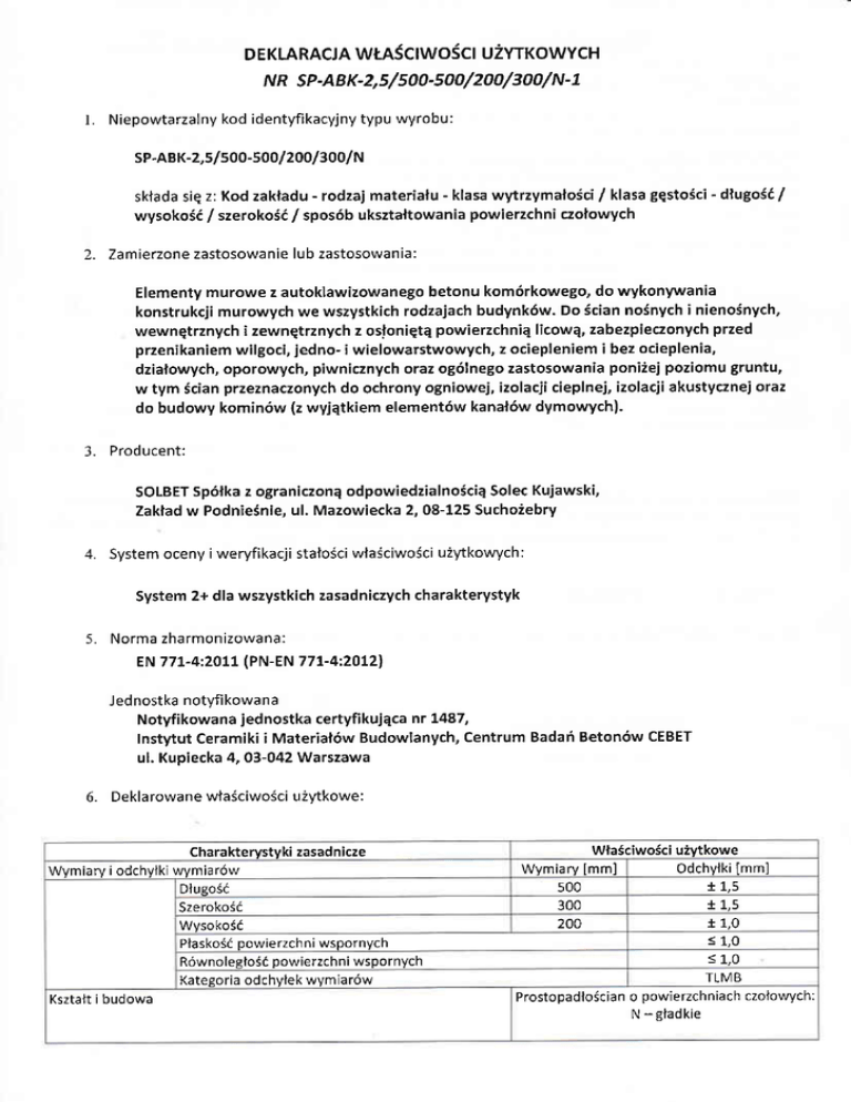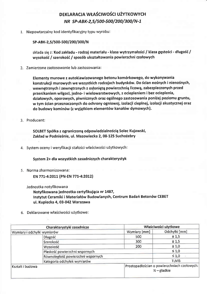 DEKLARACJA WŁAŚClWOŚCl UŹYTKOWYCH N l. R 'P-AB K-2, 5/ 5 00- 500/ 200/ 300/ N - 1 Niepowtarzalny kod identyfikacyjny typu wyrobu: sP-ABK-2,5/500-500/200/300/N sktada się z: Kod zakładu - rodzaj materiału - klasa wytrzymałości/ klasa gęstoŚci - długoŚĆ wysokość/ szerokość/ sposób ukształtowania powierzchni czołowych z. l zamie(zone zastosowanie lub zastosowania: Elementy murowe z autoklawizowanego betonu komórkowego, do wykonywania konstrukcji murowych we wszystkich rodzajach budynków. Do Ścian noŚnych i nienoŚnych, wewnętrznych i zewnętrznych z osłoniętą powierzchnią licową, zabezpieczonych przed przenikaniem wilgoci, jedno- i wielowarstwowych, z ociepleniem i bez ocieplenia, działowych, oporowych, piwnicznych oraz ogólnego zastosowania poniżej poziomu gruntu, w tym ścianprzeznaczonych do ochrony ogniowej, izolacji cieplnej, izolacji akustycznej oraz do budowy kominów (z wyjątkiem elementów kanałów dymowych). 3. Prod ucent: SOLBET Spółka z ograniczoną odpowiedzialnością Solec Kujawski, Zakład w Podnieśnie, ul. Mazowiecka 2, O8-t25 Suchożebry 4. system oceny iweryfikacji stałościwłaściwoŚci użytkowych: System 2+ dla wszystkich zasadniczych charakterystyk 5. Normazharmonizowana: EN J 6. ed 77 !-4,!20tt ( PN-EN 771-4:2012) nostka notyfikowana Notyfikowana jednostka certyfikująca nr t487, lnstytut ceramiki iMateriałów Budowlanych, centrum Badań BetonóW cEBET ul. Kupiecka 4, 03-042 Warszawa Deklarowanewłaściwościużytkowe: Charakterystyki zasadnicze Wymiary i odchyłki wymiarów Właściwościużytkowe Odchyłki Imm] Wvmiary Imml Długość 500 sze rokość 300 Wysokość t t t 2o0 kształt i budowa 1,5 1,0 ś1,0 ś1,0 Płaskośćpowierzch ni wspornych Równoległośćpowierzchni wspornych Kategoria odchyłek wymiarów 1,5 TLMB powierzchniach czołowych: Prostopadłościano N - gładkie Charakterystyki zasadnicze Wytrzymałośćna ści5ka nie KateBoria elementu muroWego (r do powielzchni Wspornej, wycięty sześcian o długości krawędzi 100mm) Stabilność wymiarowa Właściwości użytkowe Śred nia wytrzymałośćna ściskanie ż 2,5 N/mm2 Klasa wytrzymalości na ściskanie 2,5 (Skurcz pod wpływem wilgoci) WytrzymałoŚĆ spoiny na Ścinanie Wytrzymałośćspoiny wykonanej z zaprawy do cienkich spoin: soLBET 0.1 (SoLBET 0.2, SoLBET 0.7) 0,2Omm/m 0,3O N/mm' (Wartość ustalona Wg PN-EN 998 -2:2oL2 zal. c) Wytrzymałośćspoiny na zgina nie w płaszczyźnie równoległej do spoin wspornych Wytrzymałośćspoiny na zginanie w plaszczyźnie prostopadłej do spoin wspornych, spoiny czołowe wypełnione za 0,24N/mm' 0,22 Nlmm2 praWą Reakcja na ogień Euroklasa 41 Absorpcja wody NPD PrzepuszczalnoŚĆ pary Wodnej (Współcżynnik dyfuzji pary l,Vodnej); 5/70 (Wartość ustalona wg PN-EN 1745:2o12) Średnia wartość gęstościbrutto w stanie suchym 475 (odchyłki) Współczynnik przewodzenia ciepła (}..6,6.", S2) TrwałoŚĆ 1odpornośćna zamrażanie/odmrażanie, 15 cykli) sU bsta ncje nie bezpieczne (ł 25) kg/m3 0,145 w /mK Wyrób mrozood porny Stężenie naturalnych pierwiastkóW promieniotwórczych je5t poniżej Wartości dopuszczalnych stężeń WłaŚciwoŚci użytkowe określonegopowyżej wyrobu są zgodne z zestawem deklarowanych właściwości użytkowych. Niniejsza deklaracja właściwości użytkowych wydana zostaje z8odnie z rozporządzeniem (UE) nr 3O5 /201t na wyiączną odpowiedzia lnośćproducenta określonego powyżej, Podnieśno,25.05,2015r. (miejsce i data Wystawi€nia) ( podpis osoby upoważnionej)