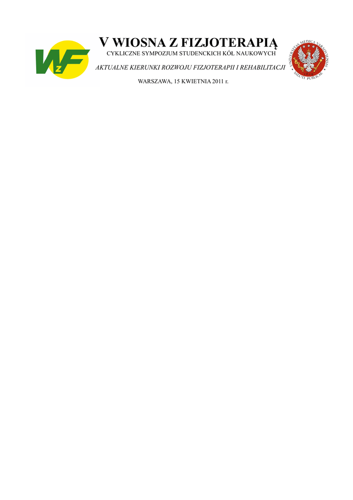 V WIOSNA Z FIZJOTERAPIĄ CYKLICZNE SYMPOZJUM STUDENCKICH KÓŁ NAUKOWYCH AKTUALNE KIERUNKI ROZWOJU FIZJOTERAPII I REHABILITACJI WARSZAWA, 15 KWIETNIA 2011 r. PATRONATY PATRONAT HONOROWY JM REKTOR WARSZAWSKIEGO UNIWERSYTETU MEDYCZNEGO PROF. DR HAB. MED. MAREK KRAWCZYK PATRONAT NAUKOWY POLSKIE TOWARZYSTWO FIZJOTERAPII POLSKIE TOWARZYSTWO REHABILITACJI POLSKIE TOWARZYSTWO GERONTOLOGICZNE PATRONAT MEDIALNY FIZJOTERAPIA POLSKA (6 PKT. MNiSzW) ORTOPEDIA TRAUMATOLOGIA REHABILITACJA (9 PKT. MNiSzW) Fizjoterapiaonline.pl – Portal Dla Fizjoterapeutów AKADEMICKIE RADIO KAMPUS 97,1 FM PARTNERZY STRATEGICZNI • Studenckie Towarzystwo Naukowe Warszawskiego Uniwersytetu Medycznego • Samorząd Studentów Warszawskiego Uniwersytetu Medycznego PARTNERZY • HABYS Sp. z o. o. • Centrum Rehabilitacji KINEZIO • International Publishing Service Sp. z o.o. • Accuro-Sumer Sp. z o.o. • Centrum Szkoleniowo-Konferencyjne BMK Wrocław • WORKER – Odzież medyczna • Agencja Wydawnicza MEDSPORTPRESS ORGANIZATORZY • Studenckie Koło Naukowe Fizjoterapii Warszawskiego Uniwersytetu Medycznego • Zakład Rehabilitacji Oddziału Fizjoterapii II Wydziału Lekarskiego Warszawskiego Uniwersytetu Medycznego WSPÓŁORGANIZATOR • Katedra i Klinika Rehabilitacji I Wydziału Lekarskiego Warszawskiego Uniwersytetu Medycznego RADA NAUKOWA (w kolejności alfabetycznej) PRZEWODNICZĄCY dr n. med. MAREK KRASUSKI – Krajowy Konsultant w Dziedzinie Rehabilitacji Medycznej, V-ce Prezes Zarządu Głównego Polskiego Towarzystwa Rehabilitacji prof. nadzw. dr hab. med. ZBIGNIEW ŚLIWIŃSKI – Krajowy Konsultant w Dziedzinie Fizjoterapii, V-ce Prezes Zarządu Głównego Polskiego Towarzystwa Fizjoterapii CZŁONKOWIE dr n. med. DARIUSZ BIAŁOSZEWSKI – Kierownik Zakładu Rehabilitacji Oddziału Fizjoterapii II Wydziału Lekarskiego Warszawskiego Uniwersytetu Medycznego, Redaktor Naczelny Czasopisma "Ortopedia Traumatologia Rehabilitacja" prof. dr hab. PIOTR BŁĘDOWSKI – Prezes Zarządu Głównego Polskiego Towarzystwa Gerontologicznego dr n. med. ANDRZEJ BUGAJSKI – Prorektor Wyższej Szkoły Fizjoterapii we Wrocławiu prof. dr hab. med. KRZYSZTOF GALUS – Kierownik Kliniki Geriatrii Warszawskiego Uniwersytetu Medycznego dr n. k. f. MARIA GRODNER – Konsultant Wojewódzki w Dziedzinie Fizjoterapii dla Obszaru Województwa Mazowieckiego dr n. med. MAREK KILJAŃSKI – Prezes Zarządu Głównego Polskiego Towarzystwa Fizjoterapii prof. dr hab. med. JERZY KIWERSKI – Rektor Wyższej Szkoły Rehabilitacji w Warszawie prof. nadzw. dr hab. med. JOLANTA KUJAWA – Prezes Zarządu Głównego Polskiego Towarzystwa Rehabilitacji, Kierownik Kliniki Rehabilitacji Uniwersytetu Medycznego w Łodzi dr hab. med. PIOTR MAJCHER – Kierownik Zakładu Rehabilitacji Uniwersytetu Medycznego w Lublinie, Koordynator Ogólnopolskiego Studenckiego Forum Naukowego dr hab. n. med. DARIUSZ SZUKIEWICZ – Prodziekan II Wydziału Lekarskiego Warszawskiego Uniwersytetu Medycznego ds. Oddziału Fizjoterapii dr n. med. PIOTR TEDERKO – Przewodniczący Zarządu Oddziału Warszawskiego Polskiego Towarzystwa Rehabilitacji KOMITET ORGANIZACYJNY Przewodniczący: dr n. med. DARIUSZ BIAŁOSZEWSKI ANNA MOSIOŁEK – Przewodnicząca SKN Fizjoterapii V-ce przewodniczący: KATARZYNA BIENIAS – V-ce Przewodnicząca SKN Fizjoterapii Członkowie: MAGDALENA DMITRUK – SKN Fizjoterapii dr n. med. MICHAŁ DWORNIK – Zakład Rehabilitacji Oddziału Fizjoterapii dr. n. o zdr. JOANNA GOTLIB – Sekretarz Redakcji Czasopisma „Ortopedia Traumatologia Rehabilitacja” ZOFIA KACZOR – SKN Fizjoterapii TADEUSZ KOWALEWSKI – SKN Fizjoterapii ALEKSANDRA KURBIEL – SKN Fizjoterapii ALEKSANDRA MACIEJEWSKA – SKN Fizjoterapii KINGA MAJCHRZYK – SKN Fizjoterapii ANNA MIERZWIŃSKA – SKN Fizjoterapii NATALIA MROZIŃSKA – SKN Fizjoterapii lek. med. IZABELLA NYKA – Klinika Rehabilitacji Warszawskiego Uniwersytetu Medycznego mgr ANNA OSTASZEWSKA – Zakład Rehabilitacji Oddziału Fizjoterapii PAULINA POŚWIATA – SKN Fizjoterapii MARTA ROGALEWICZ – SKN Fizjoterapii ANNA SCHERER – SKN Fizjoterapii mgr ANNA SŁUPIK – Zakład Rehabilitacji Oddziału Fizjoterapii KAROLINA SKŁADANOWSKA – SKN Fizjoterapii MAŁGORZATA SMODEREK – SKN Fizjoterapii mgr KATARZYNA WASIAK – Zakład Rehabilitacji Oddziału Fizjoterapii ILONA WAGNER – SKN Fizjoterapii TOMASZ WRONA – SKN Fizjoterapii WAŻNE INFORMACJE DLA UCZESTNIKÓW 1. Sympozjum odbędzie się w Auli B Centrum Dydaktycznego Warszawskiego Uniwersytetu Medycznego przy ul. Trojdena 2a (budynek obok Rektoratu WUM) w godzinach 9.30 - 18.00. 2. Rejestracja uczestników w dniu Konferencji oraz wydawanie materiałów konferencyjnych rozpocznie się o godzinie 8:30. Sekretariat będzie czynny w godzinach 8.30 - 12.30. 3. Tylko zarejestrowani uczestnicy otrzymają pakiet konferencyjny i certyfikat uczestnictwa. 4. Certyfikaty uczestnictwa będą wydawane po zakończeniu Konferencji. 5. Autorzy zakwalifikowanych do wygłoszenia prac proszeni są o przesłanie na adres [email protected] swoich prezentacji utworzonych w programie PowerPoint (maksymalnie 10 MB) , w terminie do 9 kwietnia włącznie. Czas przewidziany na prezentację wynosi 7 minut. Będzie on monitorowany zegarem konferencyjnym i bezwzględnie przestrzegany. 6. Program szczegółowy Konferencji znajduję się w tym Komunikacie oraz jest dostępny na stronie: www.sknfizjoterapii.wum.edu.pl/5wzf DANE KONTAKTOWE KOMITETU ORGANIZACYJNEGO Zakład Rehabilitacji Oddziału Fizjoterapii II WL Warszawski Uniwersytet Medyczny ul. Solec 57, 00-424 Warszawa tel/fax: 022 622 80 05 e-mail: [email protected] PROGRAM SZCZEGÓŁOWY CZĘŚĆ OFICJALNA 9.30 - 9.50 POWITANIE GOŚCI, PRZEMÓWIENIA GOŚCI I OFICJALNE OTWARCIE SYMPOZJUM 9.50 - 10.00 Pięć lat z „Wiosną z Fizjoterapią” – Anna Mosiołek 10.00 - 10.30 WYKŁAD INAUGURACYJNY – „Historyczne korzenie nowego pojęcia – Evidence-based Medicine w tradycji europejskiej” – dr n. med. Maria J. Turos 10.