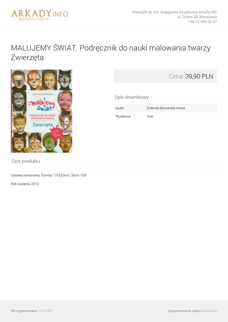 Dobra28 sp zoo. księgarnia wysyłkowa arkady.info ul. Dobra 28, Warszawa +48 22 444 86 97 MALUJEMY ŚWIAT. Podręcznik do nauki malowania twarzy Zwierzęta Cena: 39,90 PLN Opis słownikowy Autor Kolendo-Borowska Aneta Wydawca Inne Opis produktu Oprawa kartonowa, Format 17x23,5cm, Stron 104 Rok wydania 2012 Plik wygenerowano: 07-03-2017 Powered by TCPDF (www.tcpdf.org) Oprogramowanie sklepu: AptusShop