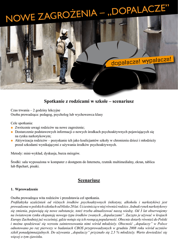 ” E Z C A L A P O D „ – A I N E Ż O R G A Z NOWE Spotkanie z rodzicami w szkole – scenariusz Czas trwania – 2 godziny lekcyjne Osoba prowadząca: pedagog, psycholog lub wychowawca klasy Cele spotkania: zz Zwrócenie uwagi rodziców na nowe zagrożenie; zz Dostarczenie podstawowych informacji o nowych środkach psychoaktywnych pojawiających się na rynku narkotykowym; zz Aktywizacja rodziców – pozyskanie ich jako koalicjantów szkoły w chronieniu dzieci i młodzieży przed szkodami wynikającymi z używania środków psychoaktywnych. Metody: mini-wykład, dyskusja, burza mózgów. Środki: sala wyposażona w komputer z dostępem do Internetu, rzutnik multimedialny, ekran, tablica lub flipchart, pisaki. Scenariusz 1. Wprowadzenie Osoba prowadząca wita rodziców i przedstawia cel spotkania. Profilaktyka uzależnień od różnych środków psychoaktywnych (nikotyny, alkoholu i narkotyków) jest prowadzona w polskich szkołach od blisko 20 lat. Uczestniczą w niej również rodzice. Jednak rynek narkotykowy się zmienia, pojawiają się nowe substancje, toteż trzeba aktualizować naszą wiedzę. Od 3 lat obserwujemy na światowym rynku ekspansję nowego typu środków zwanych „dopalaczami”. Zaczęto je używać w krajach Europy Zachodniej już wcześniej, gdzie notuje się ich rosnącą popularność. Obecnie dotarły również do Polski i można spodziewać się wzrostu zainteresowania nimi wśród młodzieży. Obecność „dopalaczy” w Polsce odnotowano po raz pierwszy w badaniach CBOS przeprowadzonych w grudniu 2008 roku wśród uczniów szkół ponadgimnazjalnych. Do używania „dopalaczy” przyznało się 2,5 % młodzieży. Warto dowiedzieć się więcej o tym zjawisku. 2. Dyskusja (10 minut) Osoba prowadząca pyta rodziców: zz czy słyszeli o „dopalaczach”, jakie były źródła informacji o tych środkach (dzieci, media, znajomi, Internet, itp.), zz co o nich wiedzą, zz czy wiedzą, gdzie w ich miejscowości znajdują się sklepy z „dopalaczami” zz ewentualnie, jaki jest ich stosunek do tego, obawy, itp. Prowadzący krótko podsumowuje stan wiedzy rodziców konkludując, że my dorośli zwykle później zauważamy wszelkie nowości niż dzieci, które mają bardzo rozbudowane potrzeby poznawcze czyli ciekawość, mają też znacznie mniej obaw przed eksperymentowaniem. 3. Mini-wykład (15 min.) a. Kontakt młodzieży z narkotykami w Polsce – trendy i tendencje w ciągu ostatnich 15 lat Wyniki ogólnopolskich badań ankietowych prowadzonych w szkołach (ESPAD) wskazują, że generalnie od 2003 roku liczba młodzieży mającej kontakt z narkotykami nie wzrasta, a nawet obserwujemy lekką tendencję spadkową. Zmniejszyła się liczba uczniów potwierdzających eksperymentowanie ze środkami psychoaktywnymi lub deklarujących zainteresowanie spróbowaniem narkotyku. Spada dostępność substancji psychoaktywnych, w tym na terenie szkoły. Zmniejsza się również liczba propozycji spróbowania narkotyku otrzymywanych przez uczniów. Ta tendencja jednak może się szybko odwrócić. W opinii uczniów szkół podstawowych i gimnazjalnych rodzice słabo orientują się w tym, co robią i czego doświadczają ich dzieci. Większość uczniów twierdzi, iż rodzice nie mają wiedzy na temat używania alkoholu i narkotyków przez ich dzieci (Badania Ursynowskie, Warszawa, 2009). b. Dlaczego pojawiły się dopalacze? Przemysł narkotykowy przynosi krociowe zyski. Rozwój tego przemysłu jest jednak hamowany przez działania ważnych instytucji międzynarodowych i krajową politykę antynarkotykową. Stałe aktualizowanie przepisów prawa, coraz bardziej skuteczna kontrola granic, ściganie producentów i dilerów, monitoring wizyjny i dyżury nauczycieli w szkole, a także działania profilaktyczne prowadzone wobec dzieci i młodzieży przynoszą efekty. Spadek dostępności narkotyków i obawa młodzieży przed wejściem w konflikt z prawem powodują, że liczba użytkowników narkotyków, zwłaszcza w Polsce, jak już wspomniano, nie wzrasta. Powoduje to zmniejszenie zysków producentów i handlarzy. Przemysł narkotykowy wprowadza więc na rynek nowe środki, które nie figurują na liście substancji zabronionych. Taką próbą ominięcia przepisów prawa są właśnie „dopalacze”. Ich promocja, jako środków użytecznych i bezpiecznych, prowadzona jest na licznych, specjalnie utworzonych stronach internetowych adresowanych do młodych odbiorców. Wzrasta liczba sklepów internetowych oraz stacjonarnych punktów sprzedaży nieprzypadkowo lokowanych w pobliżu szkół. c. Co to są „dopalacze”? Nazwa nie posiada charakteru naukowego; jest to raczej termin używany potocznie dla określenia grupy różnych substancji lub ich mieszanek o rzekomym bądź faktycznym działaniu psychoaktywnym. Reklamowane są m.in. jako „smart drugs” („sprytne substancje, zwiększające spryt i inteligencję”) – usprawniające pamięć, koncentrację uwagi. W zależności od typu produktu, imitują swoje nielegalne odpowiedniki: środki stymulujące (podobnie jak amfetamina), euforyzujące (jak tabletki ekstazy), relaksujące (jak konopie indyjskie), a nawet psychodeliczne i halucynogenne (jak LSD). Są wśród nich substancje pochodzenia zarówno syntetycznego, jak i naturalnego (roślinnego). Wiele z nich ma atrakcyjne, zachęcające nazwy, jak: „Szałwia wieszcza”, „Zioła marzeń”, „Ogon lwa (Lion’s Tail)”, itp. Strony internetowe poświęcone „dopalaczom” są przeważnie prowadzone przez użytkowników narkotyków albo producentów i służą promocji tych środków. Prezentowane informacje nie są więc wiarygodne. Rzetelne informacje można znaleźć na stronie internetowej Krajowego Biura ds. Przeciwdziałania Narkomanii przygotowanej przez specjalistów. Prowadzący prezentuje zawartość strony internetowej www.dopalaczeinfo.pl, zapisuje na tablicy adres i zachęca rodziców do zapoznania się z informacjami dotyczącymi wyglądu