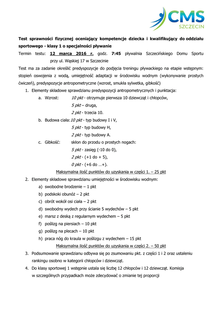 Test sprawności fizycznej oceniający kompetencje dziecka i kwalifikujący do oddziału sportowego - klasy 1 o specjalności pływanie Termin testu: 12 marca 2016 r. godz. 7:45 pływalnia Szczecińskiego Domu Sportu przy ul. Wąskiej 17 w Szczecinie Test ma za zadanie określić predyspozycje do podjęcia treningu pływackiego na etapie wstępnym: stopień oswojenia z wodą, umiejętność adaptacji w środowisku wodnym (wykonywanie prostych ćwiczeń), predyspozycje antropometryczne (wzrost, smukła sylwetka, gibkość) 1. Elementy składowe sprawdzianu predyspozycji antropometrycznych i punktacja: a. Wzrost: 10 pkt - otrzymuje pierwsza 10 dziewcząt i chłopców, 5 pkt – druga, 2 pkt - trzecia 10. b. Budowa ciała:10 pkt - typ budowy I i V, 5 pkt - typ budowy H, 2 pkt - typ budowy A. c. Gibkość: skłon do przodu o prostych nogach: 5 pkt - zasięg (-10 do 0), 2 pkt - (+1 do + 5), 0 pkt - (+6 do …+). Maksymalna ilość punktów do uzyskania w części 1. – 25 pkt 2. Elementy składowe sprawdzianu umiejętności w środowisku wodnym: a) swobodne brodzenie – 1 pkt b) podskoki obunóż – 2 pkt c) obrót wokół osi ciała – 2 pkt d) swobodny wydech przy ścianie 5 wydechów – 5 pkt e) marsz z deską z regularnym wydechem – 5 pkt f) poślizg na piersiach – 10 pkt g) poślizg na plecach – 10 pkt h) praca nóg do kraula w poślizgu z wydechem – 15 pkt Maksymalna ilość punktów do uzyskania w części 2. – 50 pkt 3. Podsumowanie sprawdzianu odbywa się po zsumowaniu pkt. z części 1 i 2 oraz ustaleniu rankingu osobno w kategorii chłopców i dziewcząt. 4. Do klasy sportowej 1 wstępnie ustala się liczbę 12 chłopców i 12 dziewcząt. Komisja w szczególnych przypadkach może zdecydować o zmianie tej proporcji