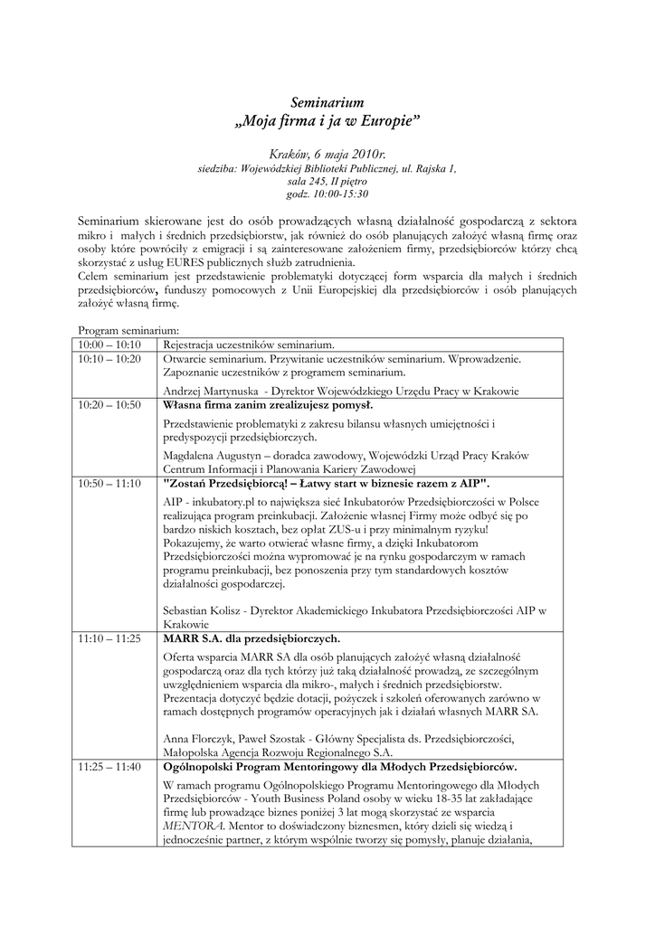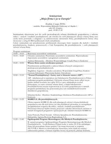 Seminarium „Moja firma i ja w Europie” Kraków, 6 maja 2010r. siedziba: Wojewódzkiej Biblioteki Publicznej, ul. Rajska 1, sala 245, II piętro godz. 10:00-15:30 Seminarium skierowane jest do osób prowadzących własną działalność gospodarczą z sektora mikro i małych i średnich przedsiębiorstw, jak równieŜ do osób planujących załoŜyć własną firmę oraz osoby które powróciły z emigracji i są zainteresowane załoŜeniem firmy, przedsiębiorców którzy chcą skorzystać z usług EURES publicznych słuŜb zatrudnienia. Celem seminarium jest przedstawienie problematyki dotyczącej form wsparcia dla małych i średnich przedsiębiorców, funduszy pomocowych z Unii Europejskiej dla przedsiębiorców i osób planujących załoŜyć własną firmę. Program seminarium: 10:00 – 10:10 Rejestracja uczestników seminarium. 10:10 – 10:20 Otwarcie seminarium. Przywitanie uczestników seminarium. Wprowadzenie. Zapoznanie uczestników z programem seminarium. 10:20 – 10:50 Andrzej Martynuska - Dyrektor Wojewódzkiego Urzędu Pracy w Krakowie Własna firma zanim zrealizujesz pomysł. Przedstawienie problematyki z zakresu bilansu własnych umiejętności i predyspozycji przedsiębiorczych. 10:50 – 11:10 Magdalena Augustyn – doradca zawodowy, Wojewódzki Urząd Pracy Kraków Centrum Informacji i Planowania Kariery Zawodowej "Zostań Przedsiębiorcą! – Łatwy start w biznesie razem z AIP". AIP - inkubatory.pl to największa sieć Inkubatorów Przedsiębiorczości w Polsce realizująca program preinkubacji. ZałoŜenie własnej Firmy moŜe odbyć się po bardzo niskich kosztach, bez opłat ZUS-u i przy minimalnym ryzyku! Pokazujemy, Ŝe warto otwierać własne firmy, a dzięki Inkubatorom Przedsiębiorczości moŜna wypromować je na rynku gospodarczym w ramach programu preinkubacji, bez ponoszenia przy tym standardowych kosztów działalności gospodarczej. 11:10 – 11:25 Sebastian Kolisz - Dyrektor Akademickiego Inkubatora Przedsiębiorczości AIP w Krakowie MARR S.A. dla przedsiębiorczych. Oferta wsparcia MARR SA dla osób planujących załoŜyć własną działalność gospodarczą oraz dla tych którzy juŜ taką działalność prowadzą, ze szczególnym uwzględnieniem wsparcia dla mikro-, małych i średnich przedsiębiorstw. Prezentacja dotyczyć będzie dotacji, poŜyczek i szkoleń oferowanych zarówno w ramach dostępnych programów operacyjnych jak i działań własnych MARR SA. 11:25 – 11:40 Anna Florczyk, Paweł Szostak - Główny Specjalista ds. Przedsiębiorczości, Małopolska Agencja Rozwoju Regionalnego S.A. Ogólnopolski Program Mentoringowy dla Młodych Przedsiębiorców. W ramach programu Ogólnopolskiego Programu Mentoringowego dla Młodych Przedsiębiorców - Youth Business Poland osoby w wieku 18-35 lat zakładające firmę lub prowadzące biznes poniŜej 3 lat mogą skorzystać ze wsparcia MENTORA. Mentor to doświadczony biznesmen, który dzieli się wiedzą i jednocześnie partner, z którym wspólnie tworzy się pomysły, planuje działania, ocenia ich skuteczność. Ponadto w ramach programu moŜna otrzymać wsparcie przy aplikowaniu o poŜyczkę z Banku Gospodarstwa Krajowego do 40 tys. zł na załoŜenie własnej firmy. Bank HSBC przygotował specjalną ofertę dla uczestników programu YBP. 11:40 – 11:55 Martin Oxley - prezes Fundacji Inkubator Technologiczny Przerwa – poczęstunek 11:55 – 12:10 Moja firma w Europie. W trakcie wystąpienia przedstawione zostaną działania jakie podejmuje Unia Europejska dla małych i średnich przedsiębiorstw (akt dla dobrej przedsiębiorczości). Ponadto ujęte zostaną informacje na temat przedsiębiorczości w Polsce ze szczególnym porównaniem do krajów Wspólnoty. 12:10 – 12:25 Tomasz Stawarz - Małopolski Punkt Informacji Europejskiej Europe Direct, działający przy Centrum Transferu Technologii Politechniki Krakowskiej Fundusze europejskie dla przedsiębiorców w ramach Małopolskiego Regionalnego Programu Operacyjnego na lata 2007 – 2013. Temat obejmować będzie dotacje dla przedsiębiorców, moŜliwe do uzyskania w ramach MRPO na lata 2007 – 2013, jak równieŜ warunki kwalifikowalności Beneficjenta i kosztów a takŜe terminy naboru wniosków. 12:25 – 12:40 Magdalena Zyguła, Małopolskie Centrum Przedsiębiorczości Enterprise Europe Network. Wystąpienie poświęcone będzie omówieniu zadań i usług świadczonych przez Enterprise Europe Network - "Wsparcia dla biznesu w zasięgu ręki”. 12:40 – 13:05 13:05 – 13:20 13:20 – 13:40 13:40 – 13:55 Józef Wołoszyn - Konsultant Izby Przemysłowo Handlowej MISTIA – prezentacja realizowanych projektów słuŜących rozwojowi małej i średniej przedsiębiorczości. Aneta Czuba - Koordynator Projektów Małopolska Akademia Zarządzania i Małopolska Akademia Kompetencji Zawodowych Małopolski Instytut Samorządu Terytorialnego i Administracji Przerwa – poczęstunek Zasady rozliczenia się przedsiębiorców w Polsce zakładających firmę w krajach Unii Europejskiej. dr Dariusz Gryglik, Zastępca Naczelnika Urzędu Skarbowego Kraków – Śródmieście Ubezpieczenia społeczne w Europie dla przedsiębiorców. Wystąpienie będzie dotyczyło czasowego przeniesienia podobnej działalności na własny rachunek na obszar UE, jak równieŜ prowadzenia działalności na własny rachunek w dwóch lub kilku państwach UE oraz praca na własny rachunek i praca najemna w róŜnych państwach członkowskich. 13:55 – 14:10 14:10 – 14:25 Renata Matusiak – Zakład Ubezpieczeń Społecznych Kraków Zaświadczenie potwierdzające okres, rodzaj i charakter działalności na terenie Rzeczpospolitej Polskiej. Małgorzata Myćka, Zespół Obsługi Instytucji Rynku Pracy - Wojewódzki Urząd Pracy w Krakowie „Zdobądź dyplom Państwowej Inspekcji Pracy”. Prezentacja programu „Zdobądź dyplom PIP”, którego celem jest zachęcenie pracodawców, do samodzielnego zapoznania się z wymogami stawianymi przez prawo pracy, ora