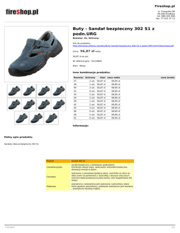 Fireshop.pl ul. Traugutta 9A 49-200 Grodków tel: 888 444 998 fax: 77 415 37 11 Buty - Sandał bezpieczny 302 S1 z podn.URG Rozmiar: 41, Ochrony: link do produktu: http://fireshop.pl/buty-sandaly/Buty-Sandal-bezpieczny-302-S1-z-podn-URG.html?download.pdf Cena: 56,87 zł netto 56,87 zł za szt. Nr referencyjny: 52124841 Stan: Nowy Inne kombinacje produktu: Rozmiar Ochrony ilość cena netto 37 2 szt. 56,87 zł 69,95 zł 38 1 szt. 56,87 zł 69,95 zł 40 3 szt. 56,87 zł 69,95 zł 41 0 szt. 56,87 zł 69,95 zł 43 2 szt. 56,87 zł 69,95 zł 44 2 szt. 56,87 zł 69,95 zł 39 1 szt. 56,87 zł 69,95 zł 42 2 szt. 56,87 zł 69,95 zł 45 3 szt. 56,87 zł 69,95 zł 46 0 szt. 56,87 zł 69,95 zł 36 2 szt. 56,87 zł 69,95 zł S1 0 szt. 56,87 zł 69,95 zł cena brutto Informacje: Pełny opis produktu Sandały robocze bezpieczne 302 S1 7-03-2017 Produkt Sandał 302 S1 Charakterystyka sandał bezpieczny z metalowym podnoskiem Zamknięty obszar pięty, właściwości antyelektrostatyczne, absorpcja energii w pięcie. Cholewka wykonana z zamszowej bydlęcej skóry, wyściółka ze skóry ze skóry świni (w porównaniu z wyściółką z tworzyw sztucznych znacznie lepiej przepuszcza parą wodną i jest wygodniejsza dla stopy) Podeszwa zewnętrzna i wewnętrzna jest wykonana z poliuretanu (dwie różne gęstości poliuretanu), podeszwa zewnętrzna jest twardsza , wewnętrzna bardziej miękka. 1/1
