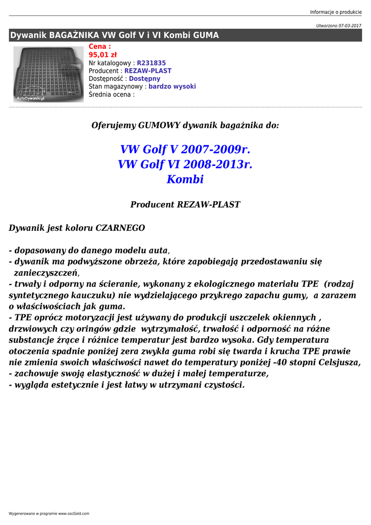 Informacje o produkcie Utworzono 07-03-2017 Dywanik BAGAŻNIKA VW Golf V i VI Kombi GUMA Cena : 95,01 zł Nr katalogowy : R231835 Producent : REZAW-PLAST Dostępność : Dostępny Stan magazynowy : bardzo wysoki Średnia ocena : Oferujemy GUMOWY dywanik bagażnika do: VW Golf V 2007-2009r. VW Golf VI 2008-2013r. Kombi Producent REZAW-PLAST Dywanik jest koloru CZARNEGO - dopasowany do danego modelu auta, - dywanik ma podwyższone obrzeża, które zapobiegają przedostawaniu się zanieczyszczeń, - trwały i odporny na ścieranie, wykonany z ekologicznego materiału TPE (rodzaj syntetycznego kauczuku) nie wydzielającego przykrego zapachu gumy, a zarazem o właściwościach jak guma. - TPE oprócz motoryzacji jest używany do produkcji uszczelek okiennych , drzwiowych czy oringów gdzie wytrzymałość, trwałość i odporność na różne substancje żrące i różnice temperatur jest bardzo wysoka. Gdy temperatura otoczenia spadnie poniżej zera zwykła guma robi się twarda i krucha TPE prawie nie zmienia swoich właściwości nawet do temperatury poniżej -40 stopni Celsjusza, - zachowuje swoją elastyczność w dużej i małej temperaturze, - wygląda estetycznie i jest łatwy w utrzymani czystości. Wygenerowano w programie www.oscGold.com
