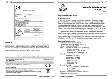 - Przenośny lokalizator GPS „Latarka T10 ” Ver. 01 Lokalizator GPS T10 (latarka) 1. Przeznaczenie Specjalna zaprojektowana i opatentowana konstrukcja urządzenia sprawia, Ŝe lokalizator T10 to znakomite połączenie latarki i ukrytego lokalizatora GPS. MoŜe on być stosowany jako zwykła latarka, w tym samym czasie zapewniając dokładna lokalizację osoby, bagaŜu lub pojazdu przy pomocy techniki GPS za pośrednictwem sieci komórkowej poprzez wiadomości SMS lub transmisję GPRS (online). Elastyczne moŜliwości programowania. Lokalizator T10 moŜe być łatwo zaprogramowany za pomocą wiadomości SMS przez uŜytkownika. Urządzenie obsługuje funkcję głębokiego uśpienia, wbudowany akumulator litowo-jonowy o pojemności 2200mAh pozwala na pozostanie w trybie gotowości przez miesiąc czekając na wybudzenie przez ruch (wibracje). O fakcie wybudzenia moŜe poinformować uŜytkownika wiadomością SMS lub połączeniem głosowym. Wbudowany mikrofon pozwala na podsłuch otoczenia przez uŜytkownika. GWARANCJA. Dystrybutor udziela 12 miesięcy gwarancji od daty zakupu i zobowiązuje się do bezpłatnej naprawy urządzenia, jeŜeli w okresie tym wystąpią wady z winy producenta. Wadliwe urządzenie naleŜy dostarczyć do miejsca zakupu w stanie czystym i na własny koszt wraz z niniejszą gwarancją, paragonem zakupu lub fakturą VAT i krótkim opisem uszkodzenia. Koszt demontaŜu i montaŜu urządzenia ponosi uŜytkownik. Gwarancja nie obejmuje wszystkich uszkodzeń powstałych w wyniku nieprawidłowego uŜytkowania, samowolnych regulacji, przeróbek i napraw. Data i miejsce zakupu (pieczęć sprzedawcy): …………………………………………. Importer: AMT, 57-100 Strzelin, ul. DzierŜoniowska 14 Kraj pochodzenia: CHRL Dane techniczne: 0 ÷ +30 oC 0,180 Kg Napięcie zasilania 5V USB Temperatura pracy Wbudowany akumulator lit-jon 2200mAh Masa netto Urządzenie to spełnia wymogi dyrektywy 1999/5/EC R&TTE Ochrona środowiska Produkt ten nie moŜe być traktowany jako odpad domowy i wrzucony do śmieci. Aby chronić środowiska naturalne zapewnij prawidłową utylizacje. Informacje dotyczące recyklingu niniejszego produktu otrzymasz w punkcie sprzedaŜy lub u przedstawicieli władz lokalnych. Lokalizatory gps Specyfikacja techniczna: Wymiary: 155mm x55mm x 55mm Temperatura przechowywania: -0 to 85°C Temperatura pracy: 0 do 30°C GPS: chipset U-BLOX G6010-ST, 50 kanałowy Antena: wewnętrzna Częstotliwość: L1 1575.42 MHz Dokładność pozycjonowania: <5m Czułość: Śledzenie: –161 dBm Zimny start: –148 dBm Gorący start: –156 dBm Zimny start: <27s Ciepły start: <5s Gorący start: 1s GPRS: MTK 6260D Quad band; 850/900/1800/1900 MHz GPRS Class 12 Antena: Wewnętrzna Zasilanie: Akumulator litowo-jonowy 2200mAh Wbudowany czujnik wstrząsu Lokalizatory gps - 11.2 Komenda SMS: *fenceoff* Wysłanie komendy SMS: *fenceoff* wyłącza funkcję Geofence. 2. Widok produktu W odpowiedzi na wysłaną wiadomość, zwrotnie otrzymamy SMS’a o treści: “Notice: The Geofence is disabled.” 12. Zapytanie o status: *status* Wysłanie komendy SMS: *status* spowoduje odesłanie raportu o stanie urządzenia. W odpowiedzi na wysłaną wiadomość otrzymamy raport informujący o stanie urządzenia, aktywnych opcjach i stanie baterii. 13. Obsługa przez kilku uŜytkowników: Multi Controller Funkcja ta pozwala na zapytanie o pozycję czy status urządzenia z innych numerów telefonów niŜ uŜytkownik Master. 3. Działanie przełącznika latarki 13.1. Komenda SMS: *multiquery* Wysłanie komendy SMS: *multiquery* zezwala na zapytania od innych uŜytkowników a. On: Przesuń w pozycję On aby włączyć latarkę b. Off: Przesuń w pozycję Off aby wyłączyć latarkę 4. Przygotowanie do pracy 4.1 Przygotowanie karty SIM a. uŜywać tylko kart SIM GSM/GPRS (nie naleŜy uŜywać kart ‘internetowych’) b. karta SIM powinna mieć aktywną usługę transmisji GPRS (do lokalizacji online) c. do urządzenia naleŜy wysyłać wiadomości z numeru nie zastrzeŜonego. d. wyłączyć Ŝądanie kodu PIN z karty SIM korzystając np. z telefonu 4.2 Instalacja karty SIM a. Otworzyć osłonę karty SIM b. Wsunąć kartę SIM, styki karty powinny być skierowane w stronę uchwytu c. Zielone dioda w obudowie zapali się i po chwili zgaśnie d. ZałóŜ osłonę karty SIM i przykręć ją załączoną w zestawie śrubką. e. Zadzwoń na numer zainstalowanej karty SIM. JeŜeli karta została poprawnie zainstalowana powinien być słyszalny sygnał dzwonienia (urządzenie nie odbiera połączenia). JeŜeli karta SIM nie zgłasza się (abonent poza zasięgiem itp.) naleŜy sprawdzić poprawność zainstalowania karty SIM. Lokalizatory gps W odpowiedzi na wysłaną wiadomość, zwrotnie otrzymamy SMS’a o treści: “Notice: Multi query feature enabled.” 13.1. Komenda SMS: *multiqueryoff* Wysłanie komendy SMS: *multiqueryoff* blokuje moŜliwość zapytań od innych uŜytkowników poza uŜytkownikiem Master. W odpowiedzi na wysłaną wiadomość, uŜytkownik Master zwrotnie otrzyma SMS’a o treści: “ Notice: Multi query feature disabled.” 14. Informacje o urządzeniu: *about* Wysłanie komendy SMS: *about* spowoduje odesłanie przez urządzenie informacji o wersji oprogramowania i numerze seryjnym. Lokalizatory gps - - 10.1 Komenda SMS: *sleep*1-99* Wysłanie komendy SMS: *sleep*1-99* spowoduje przejście urządzenia w tryb głębokiego uśpienia. Parametr 1-99 oznacza czas cyklu uśpienia w godzinach. Po ustalonym czasie urządzenie wybudza się, wysyła dane na serwer i ponownie usypia. W odpowiedzi na wysłaną wiadomość, zwrotnie otrzymamy SMS’a o treści: “Notice: System is going to enter deep sleep function, data will be uploaded every XXX hours.” 10.2 Komenda SMS: * sleepoff* Wysłanie komendy SMS: * sleepoff* wyłącza tryb uśpienia W odpowiedzi na wysłaną wiadomość, zwrotnie otrzymamy SMS’a o treści: “Notice: System has ended deep sleep function.” UWAGA! Odpowi