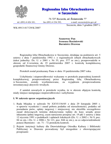 Regionalna Izba Obrachunkowa w Szczecinie 71-727 Szczecin, ul. Światowida 77 tel. (091) 4 426 101, fax (091) 4 236 392, e-mail: [email protected] Szczecin, dnia 3 grudnia 2007 r. WK-0913-817/29/K/2007 Szanowny Pan Ireneusz Rzeźniewski Burmistrz Drawna Regionalna Izba Obrachunkowa w Szczecinie, działając na podstawie art. 5 ustawy z dnia 7 października 1992 r. o regionalnych izbach obrachunkowych (tekst jednolity: Dz. U. z 2001 r. Nr 55, poz. 577 ze zm.), przeprowadziła w okresie od 6 września do 19 października 2007 r. kontrolę kompleksową gospodarki finansowej Gminy Drawno. Protokół został przekazany Panu w dniu 19 października 2007 roku. Uchybienia i nieprawidłowości wykazane w protokole poprzedniej kontroli kompleksowej, przeprowadzonej przez Regionalną Izbę Obrachunkową w Szczecinie, zostały wyeliminowane, za wyjątkiem przeprowadzenia inwentaryzacji aktywów trwałych. Z ustaleń zawartych w protokole wynika, że w okresie objętym kontrolą miały miejsce następujące nieprawidłowości i uchybienia: I. W zakresie spraw organizacyjnych 1. Rada Miejska w uchwale Nr XXVI/156/05 z dnia 29 listopada 2005 r. w sprawie wysokości i zasad poboru podatku od nieruchomości, podatku od posiadania psów, opłaty targowej i miejscowej, nie określiła szczegółowo zasad dotyczących terminu dokonywania wpłaty do kasy urzędu przez inkasenta opłaty targowej, czym naruszono przepisy art. 19 pkt 1 ustawy z dnia 12 stycznia 1991 o podatkach i opłatach lokalnych (Dz. U. z 2002 r. Nr 9, poz. 84 ze zm. i Dz. U. z 2006 r. Nr 121, poz. 844 ze zm.), za co odpowiedzialność ponosi Burmistrz – str. 71 - 72 protokołu kontroli. 2. Rejestr instytucji kultury dla Drawieńskiego Ośrodka Kultury i Biblioteki Publicznej w Drawnie prowadzony był niezgodnie z obowiązującymi przepisami: a) instytucje kultury wpisano do jednej księgi rejestrowej zamiast do osobnych, oznaczonych kolejnymi numerami, b) w dziale pierwszym – Oznaczenie instytucji kultury – nie wpisano cyfrowych identyfikatorów instytucji kultury, c) w dziale drugim – Organizacja instytucji kultury – nie dokonano żadnych wpisów (brak min. wzmianki o złożeniu do rejestru statutów instytucji kultury, imienia i nazwiska osób pełniących funkcje dyrektora), d) dział trzeci – Mienie instytucji kultury – zawierał jedynie nagłówek, nie utworzono rubryk i nie zamieszczono żadnych wpisów, e) działu czwartego – Połączenie, podział i likwidacja instytucji kultury – rejestr nie zawierał, f) wpisy w rejestrze nie były aktualizowane, nie zostały również zaopatrzone w datę dokonania wpisu oraz podpis pełnomocnika organizatora, czym naruszono przepisy § 1 ust. 2, § 2 ust. 1 i 2, § 3 oraz § 7 rozporządzenia Ministra Kultury i Sztuki z dnia 17 lutego 1992 r. w sprawie prowadzenia rejestru instytucji kultury (Dz. U. z 1992 r. Nr 20, poz. 80), za co odpowiedzialność ponosi Kierownik Referatu OrganizacyjnoAdministracyjngo, z tytułu nadzoru Burmistrz Gminy – str. 7-8 protokołu kontroli. 3. Przewodniczący Rady Miejskiej wykonywał czynności z zakresu prawa pracy wobec Burmistrza bez stosownej uchwały organu stanowiącego, czym naruszono przepisy art. 4 ust. 1 ustawy z dnia 22 marca 1990 r. o pracownikach samorządowych (tekst jednolity: Dz. U. z 2001 r. Nr 142, poz. 1593 ze zm.), str. 10-11 protokołu kontroli. 4. Dokumentacja opisująca przyjęte przez kontrolowaną jednostkę zasady (politykę) rachunkowości wprowadzona na mocy Zarządzenia Nr 33/04 Burmistrza z dnia 30 grudnia 2004 r. w sprawie przepisów wewnętrznych regulujących gospodarkę finansową w Urzędzie Miejskim w Drawnie nie zawierała: a) określenia roku obrotowego, b) określenia metod wyceny aktywów i pasywów oraz ustalania wyniku finansowego, c) wykazu ksiąg rachunkowych, a w przypadku prowadzenia ksiąg przy użyciu komputerów wykazu zbiorów danych tworzących księgi z określeniem ich struktury, powiązań oraz funkcji w organizacji całości ksiąg rachunkowych i w procesach przetwarzania danych, d) opisu systemu informatycznego, zawierającego wykaz programów, procedur lub funkcji, w zależności od struktury oprogramowania, wraz z opisem algorytmów i parametrów oraz programowych zasad ochrony danych, w tym szczególności metod zabezpieczenia dostępu do danych i systemu ich przetwarzania, e) określenia wersji oprogramowania i daty rozpoczęcia jego eksploatacji, f) opisu systemu służącego ochronie danych i ich zbiorów, w tym dowodów księgowych, ksiąg rachunkowych i innych dokumentów stanowiących podstawę dokonanych w nich zapisów, czym naruszono przepisy art. 10 ust. 1 pkt 1, 2, 3 lit. „b” i lit. „c” oraz pkt 4 ustawy z dnia 29 września 1994 r. o rachunkowości (tekst jednolity: Dz. U. z 2002 r. Nr 76, poz. 694 ze zm.), za co odpowiedzialność ponosi Burmistrz Gminy – str. 17 i 19-20 protokołu kontroli. 5. W 2006 r. ewidencję księgową prowadzono niezgodnie z ustaleniami zakładowego planu kont: a) w ewidencji księgowej urządzono konta (brak obrotów), które nie zostały przewidziane w Zakładowym Planie Kont Budżetu Gminy: 138 – „Rachunek środków na prefinansowanie”, 225 – „Dochody, wydatki niewygasające”, 257 – „Należności z tytułu prefinansowania”, 801 – „Dochody przedszkole”, 962 – „Wynik na pozostałych operacjach”, b) w ewidencji księgowej nie utworzono wszystkich kont przewidzianych w Zakładowym Planie Kont Urzędu Gminy: 014 – „Zbiory biblioteczne”, 015 – „Mienie zlikwidowanych jednostek”, 030 – „Finansowy majątek trwały”, 131 – „Rachunki bieżące”, 222 – „Rozliczenie dochodów budżetowych”, 490 – „Rozliczenie kosztów”, 640 – „Rozliczenie międzyokresowe kosztów”, 740 – „Dotacje i środki na inwestycje”, 820 – „Rozliczenie wyniku finansowego”, 840 – „Rezerwy i rozliczenia międzyokresowe przychodów”, 855 – „Fundusz mienia zlikwidowanych jednostek”, 870 