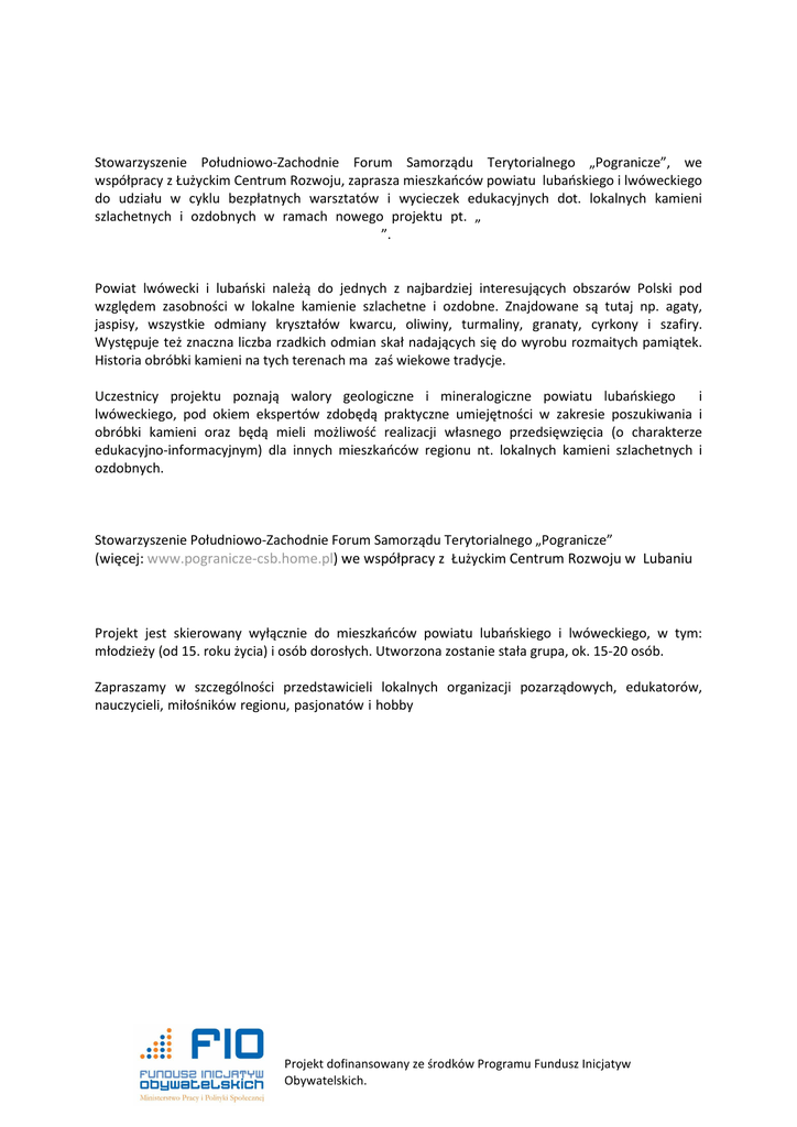 !" #$%# & ' ( ( ( ( Stowarzyszenie Południowo-Zachodnie Forum Samorządu Terytorialnego „Pogranicze”, we współpracy z Łużyckim Centrum Rozwoju, zaprasza mieszkańców powiatu lubańskiego i lwóweckiego do udziału w cyklu bezpłatnych warsztatów i wycieczek edukacyjnych dot. lokalnych kamieni szlachetnych i ozdobnych w ramach nowego projektu pt. „ ”. Powiat lwówecki i lubański należą do jednych z najbardziej interesujących obszarów Polski pod względem zasobności w lokalne kamienie szlachetne i ozdobne. Znajdowane są tutaj np. agaty, jaspisy, wszystkie odmiany kryształów kwarcu, oliwiny, turmaliny, granaty, cyrkony i szafiry. Występuje też znaczna liczba rzadkich odmian skał nadających się do wyrobu rozmaitych pamiątek. Historia obróbki kamieni na tych terenach ma zaś wiekowe tradycje. Uczestnicy projektu poznają walory geologiczne i mineralogiczne powiatu lubańskiego i lwóweckiego, pod okiem ekspertów zdobędą praktyczne umiejętności w zakresie poszukiwania i obróbki kamieni oraz będą mieli możliwość realizacji własnego przedsięwzięcia (o charakterze edukacyjno-informacyjnym) dla innych mieszkańców regionu nt. lokalnych kamieni szlachetnych i ozdobnych. ! ) $% *! + Stowarzyszenie Południowo-Zachodnie Forum Samorządu Terytorialnego „Pogranicze” (więcej: www.pogranicze-csb.home.pl) we współpracy z Łużyckim Centrum Rozwoju w Lubaniu ,& #"*$%&-+ Projekt jest skierowany wyłącznie do mieszkańców powiatu lubańskiego i lwóweckiego, w tym: młodzieży (od 15. roku życia) i osób dorosłych. Utworzona zostanie stała grupa, ok. 15-20 osób. Zapraszamy w szczególności przedstawicieli lokalnych organizacji pozarządowych, edukatorów, nauczycieli, miłośników regionu, pasjonatów i hobby Projekt dofinansowany ze środków Programu Fundusz Inicjatyw Obywatelskich. • • • • %>'789: = " !*0 $%# @ ; warsztat praktyczny z zakresu szlifierki kamieni - cz. 1 (Lubań) + - termin do ustalenia, sobota, 8 h, Lubań >'789: = " !*0 $%# : - warsztat praktyczny z zakresu szlifierki kamieni - cz. 2 (Lubań) + - termin do ustalenia, sobota, 8 h, Lubań >'789: = " !*0 $%# < – warsztat dot. planowania własnych wydarzeń lokalnych (Lubań) + - termin do ustalenia, dzień roboczy, od godz. 15.00, Lubań >;>%'789: = realizacja przez uczestników (w grupach) własnych wydarzeń lokalnych + - działanie o charakterze edukacyjno-informacyjnym, którego celem jest promocja wśród mieszkańców regionu tematyki dot. lokalnych kamieni szlachetnych i ozdobnych - forma akcji zostanie opracowana samodzielnie przez uczestników projektu - planowana jest realizacja minimum 3 inicjatyw (w grupach) - organizacja wydarzeń lokalnych zostanie dofinansowana w ramach projektu %$A! 1 &B# ! ) $% &-B$#+ • ,. % / 4 !B#0&%# B#"* C# / *$-D • Wymagany jest udział we wszystkich warsztatach i wycieczkach oraz uczestnictwo w realizacji wydarzenia dla społeczności lokalnej. • Nie jest możliwy udział w wybranych zajęciach. • Liczba miejsc jest ograniczona. • W przypadku większego zainteresowania zostanie utworzona lista rezerwowa. • Uczestnicy otrzymają zaświadczenia potwierdzające udział w projekcie. • Osoby zakwalifikowane otrzymają potwierdzenie drogą mailową do dn. 29.05.2015. )/!" #$% + Wypełnione deklaracje udziału można przesyłać wyłącznie drogą mailową do 7G 789: ' do godz. 18.00 na adres: Stowarzyszenia P-ZFST „Pogranicze” E F [email protected] 4%H&#B %$A! 1 &B%+ Magdalena Guła Stowarzyszenie Południowo-Zachodnie Forum Samorządu Terytorialnego „Pogranicze” ul. Armii Krajowej 30, 59-800 Luban e-mail: [email protected] Tel. 75 721 50 77 www.pogranicze-csb.home.pl Projekt dofinansowany ze środków Programu Fundusz Inicjatyw Obywatelskich.